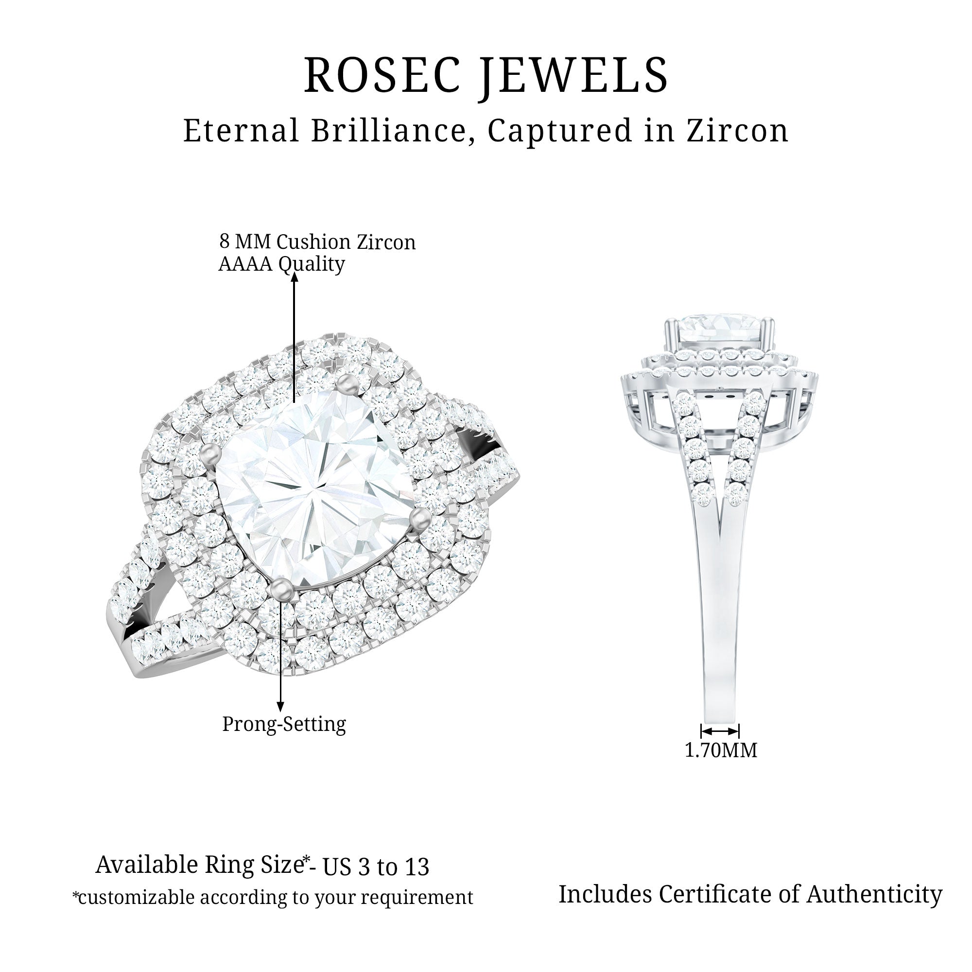 She is queen of your heart, and the queen deserves something special, so get her this Vintage Inspired CZ Ring on the big day. The ring is curated with an 8 MM Cushion Cut Zircon encircled by Double Halo of smaller stones, which beautifies the look of the ring and makes it a statement ring. This Halo Engagement Ring is an ultimate showstopper that can be worn to dazzle on the special day. This 3 Carat engagement Ring beholds the adorable shine of AAAA Quality Cubic Zirconia that will bring the shine to your brides face. The Gold Plated ring is accentuated with a studded shank, which gives a secure fit and dazzling appearance.