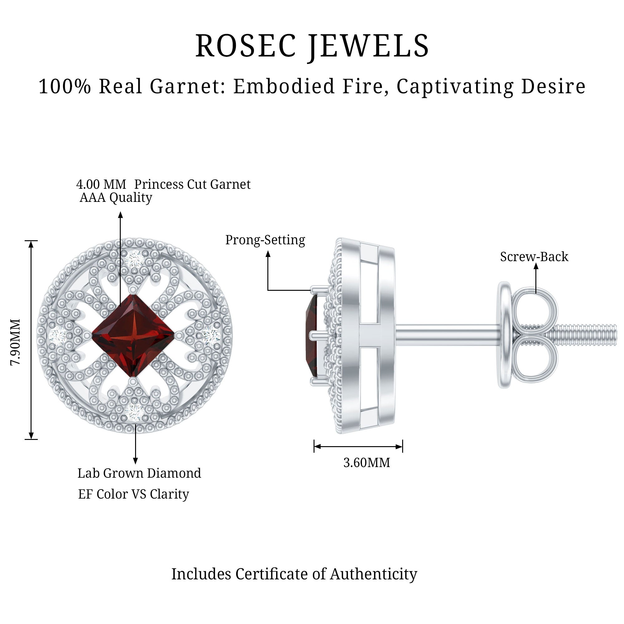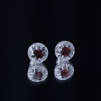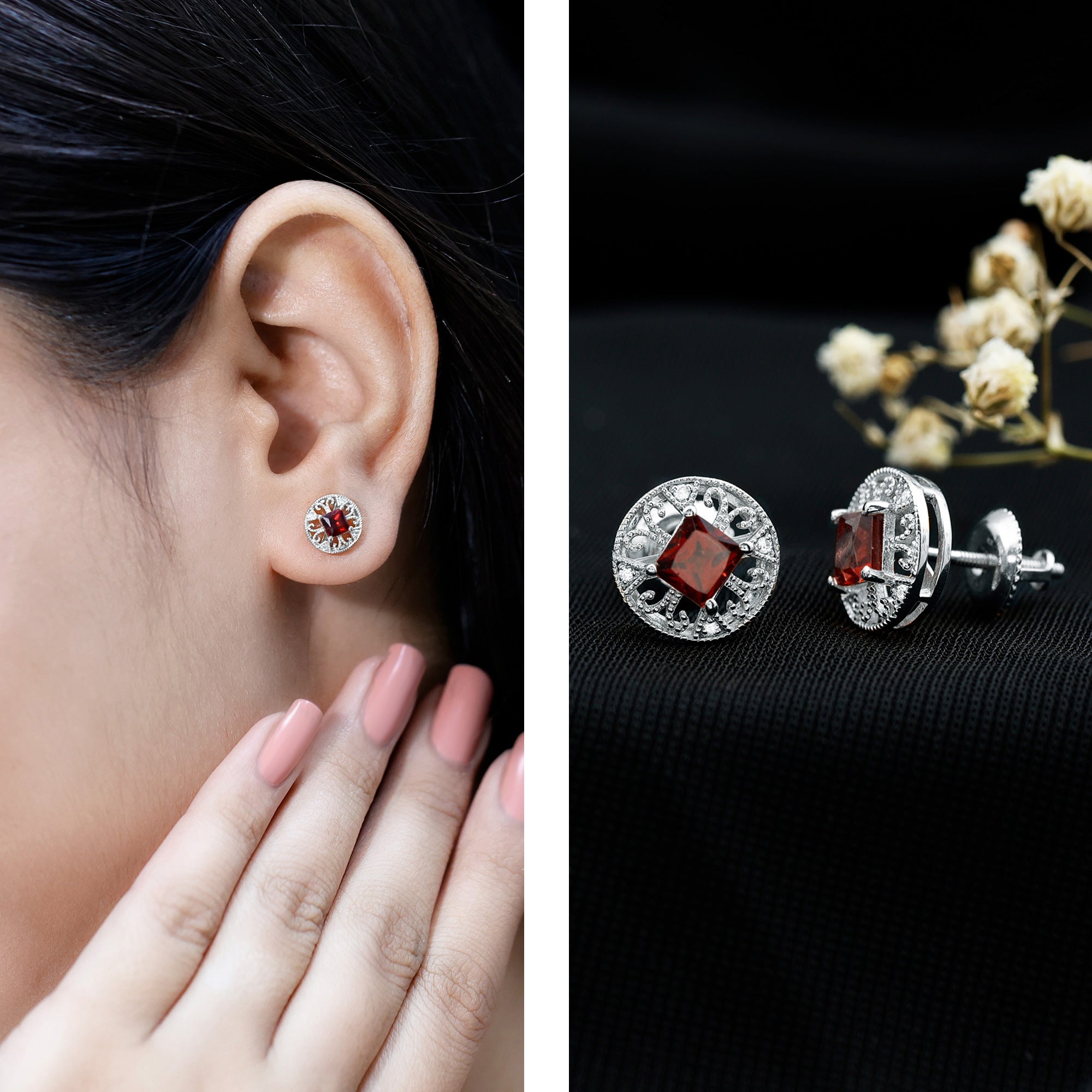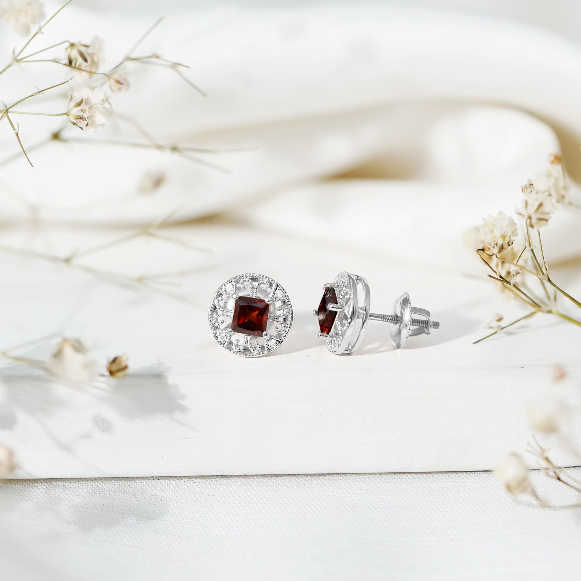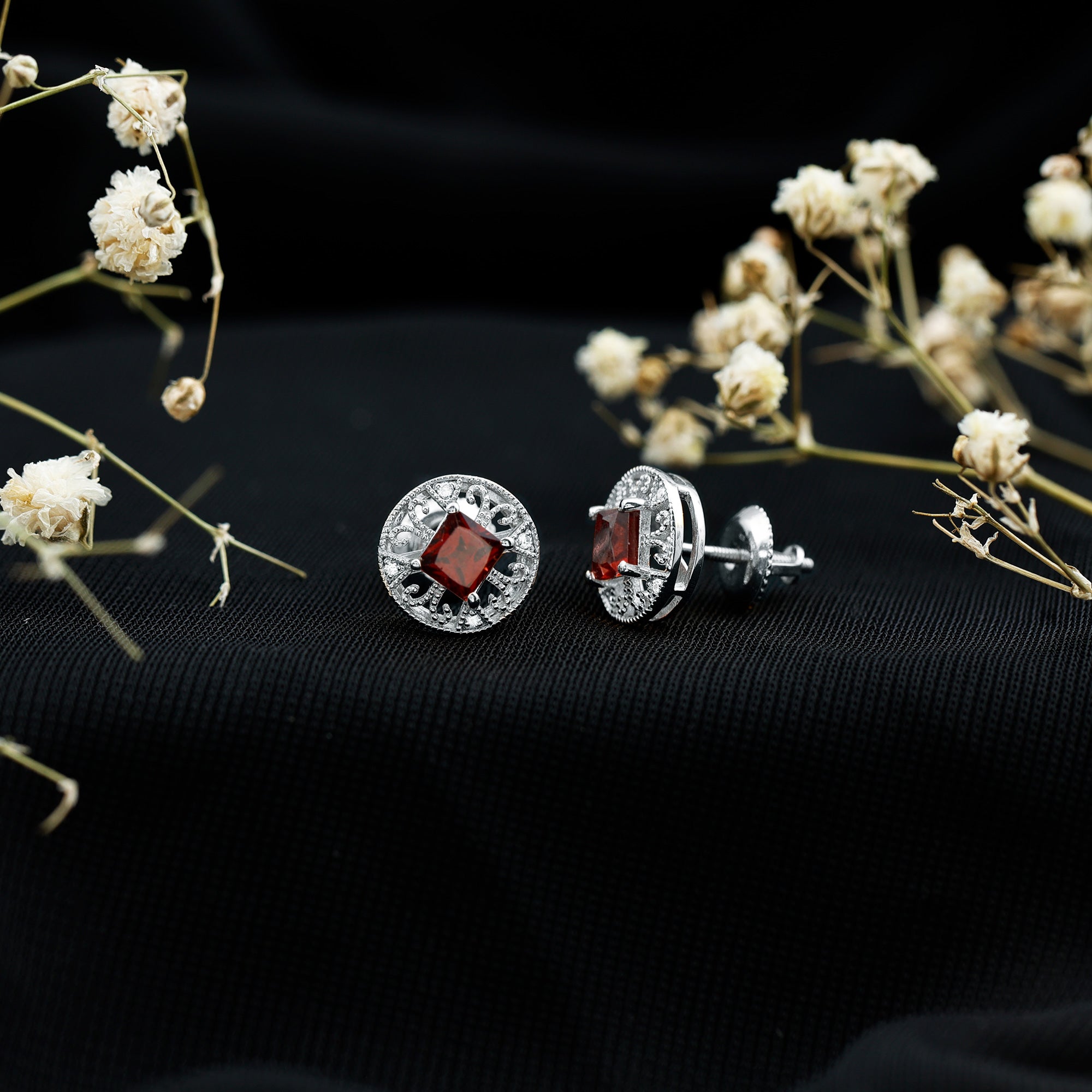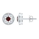 Rich in color and full of classic charm, these Garnet Stud Earrings bring warmth and elegance to your everyday style. Crafted in 14K white gold plated silver, these Circle Stud Earrings feature a vibrant princess cut garnet at the center. The center stone is surrounded by an antique-inspired pattern made of graceful and tiny beaded detailing. This vintage-style design brings a feeling of old-world romance, adding character and charm to each earring. Sparkling round lab created diamonds are set between the patterns, creating a soft contrast that makes the garnet pop even more. Their gentle shimmer adds just the right amount of brilliance without overpowering the bold red centerpiece. Designed with comfort in mind, these Garnet and Diamond Earrings come with secure screw backs, so you can wear them all day without worry. Whether you are dressing up for a dinner, attending a celebration, or just adding a special touch to your daily outfit, these Vintage Garnet Earrings are made to shine through every moment. These Stud Earrings are perfect for those who appreciate vintage-style jewelry with a personal story.