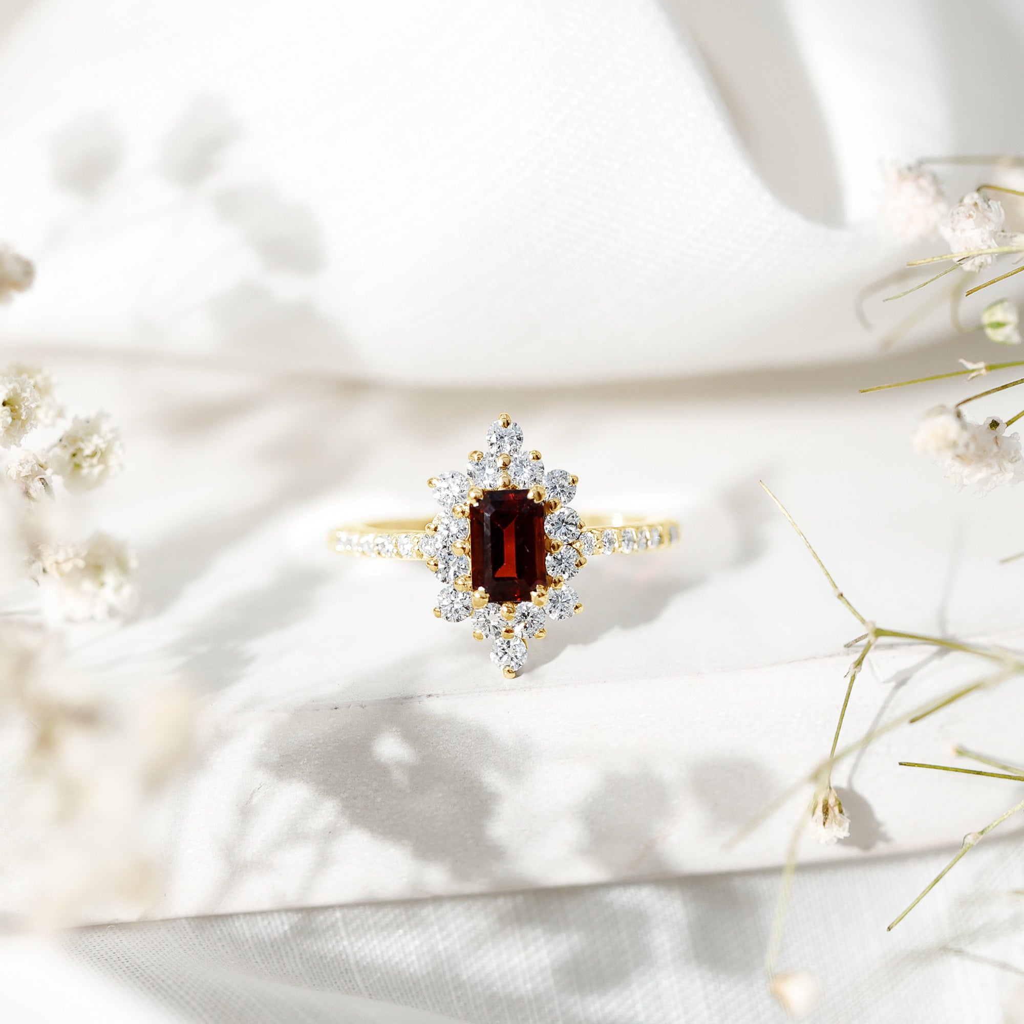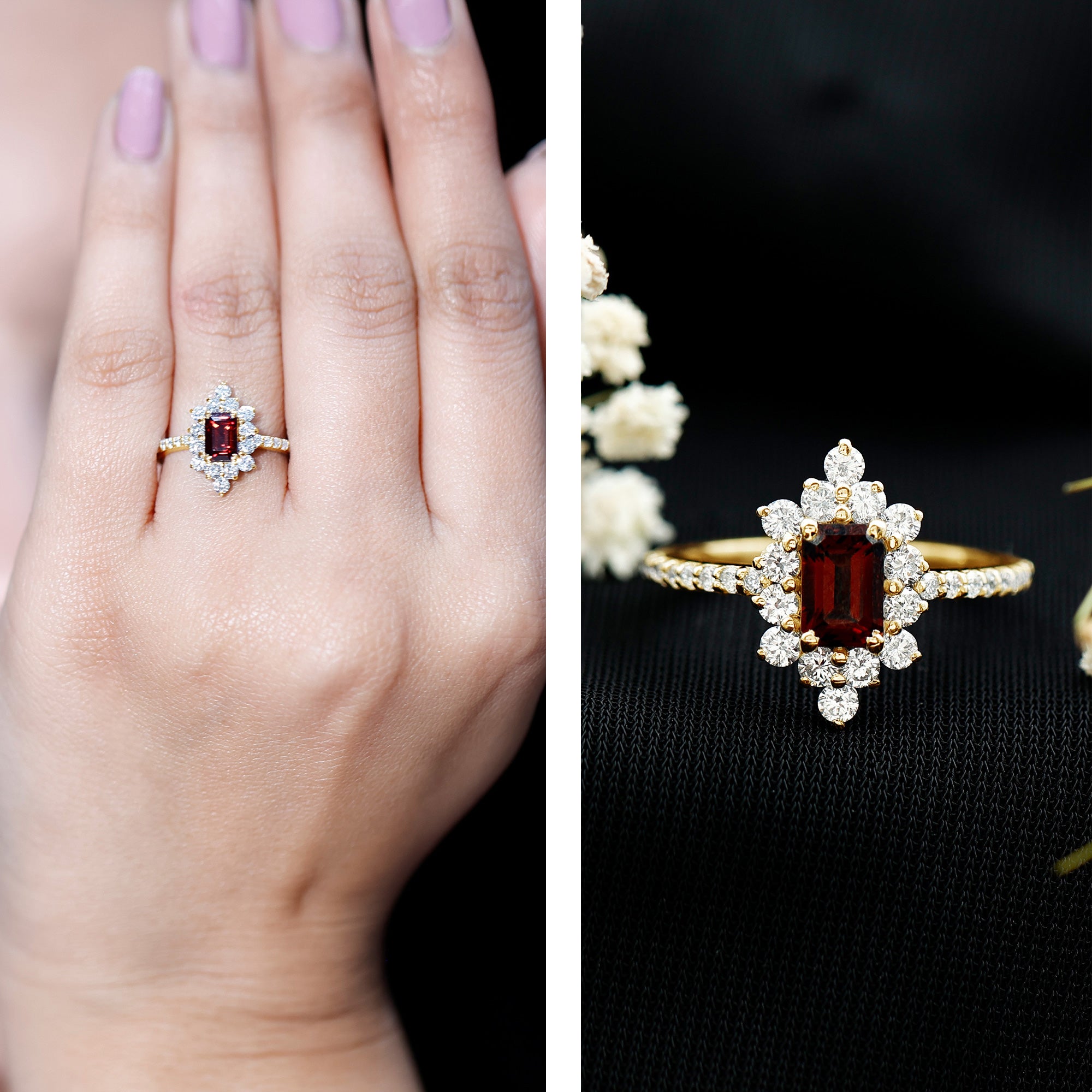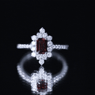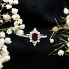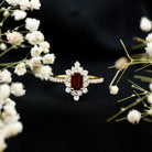 Vintage Inspired Garnet Emerald Cut Engagement Ring with Diamond Halo