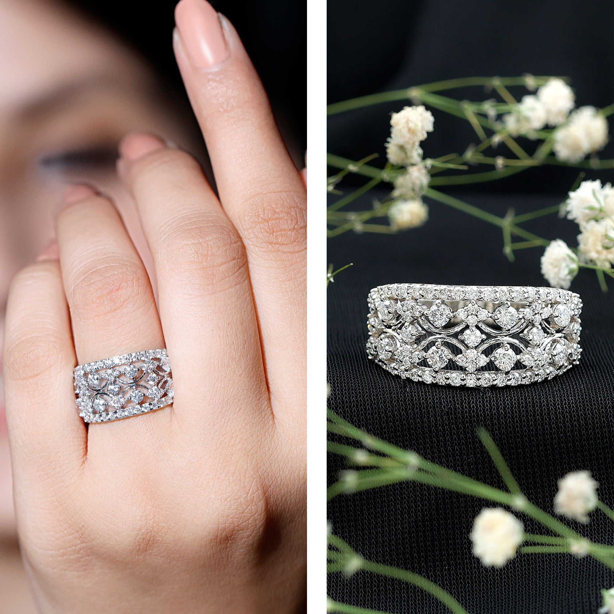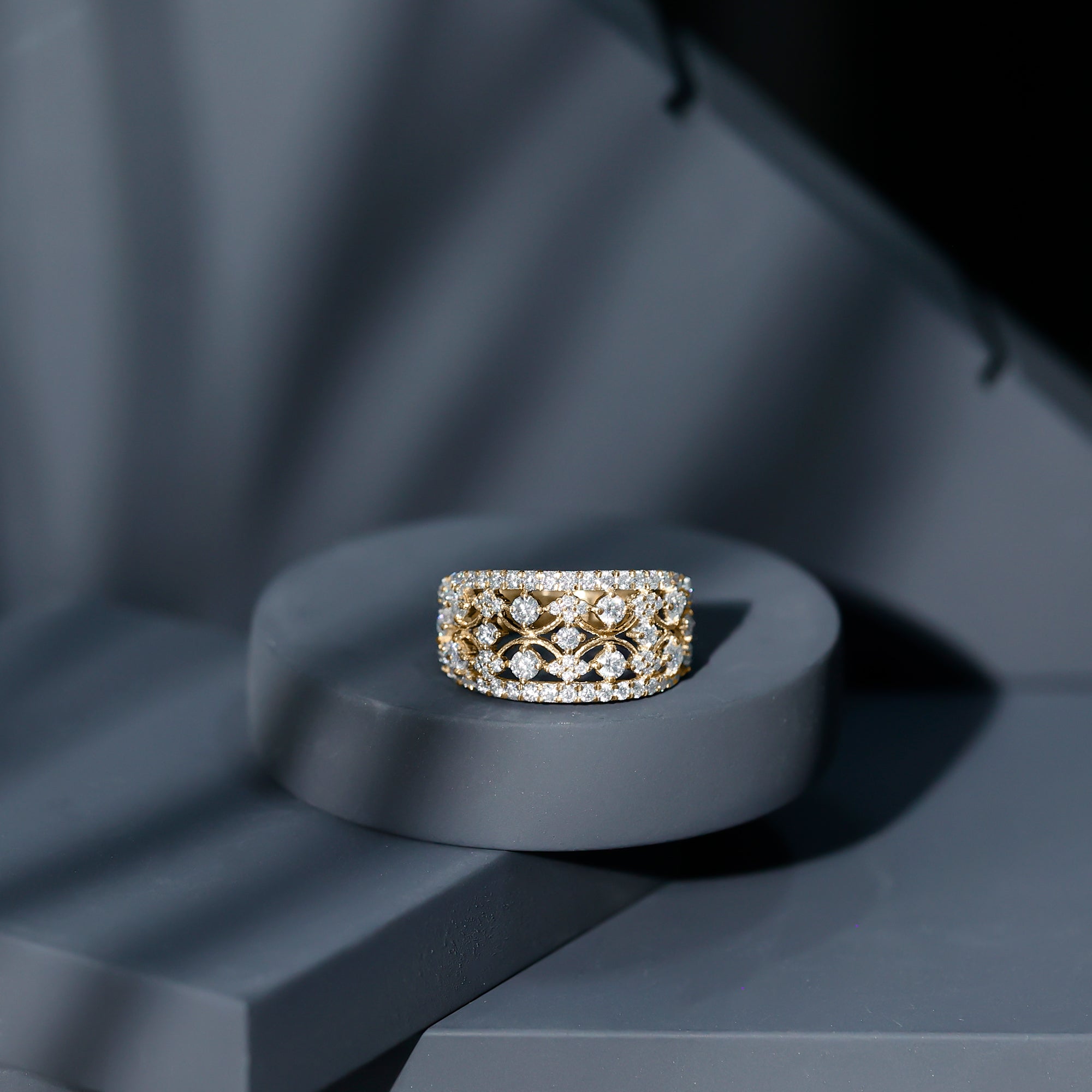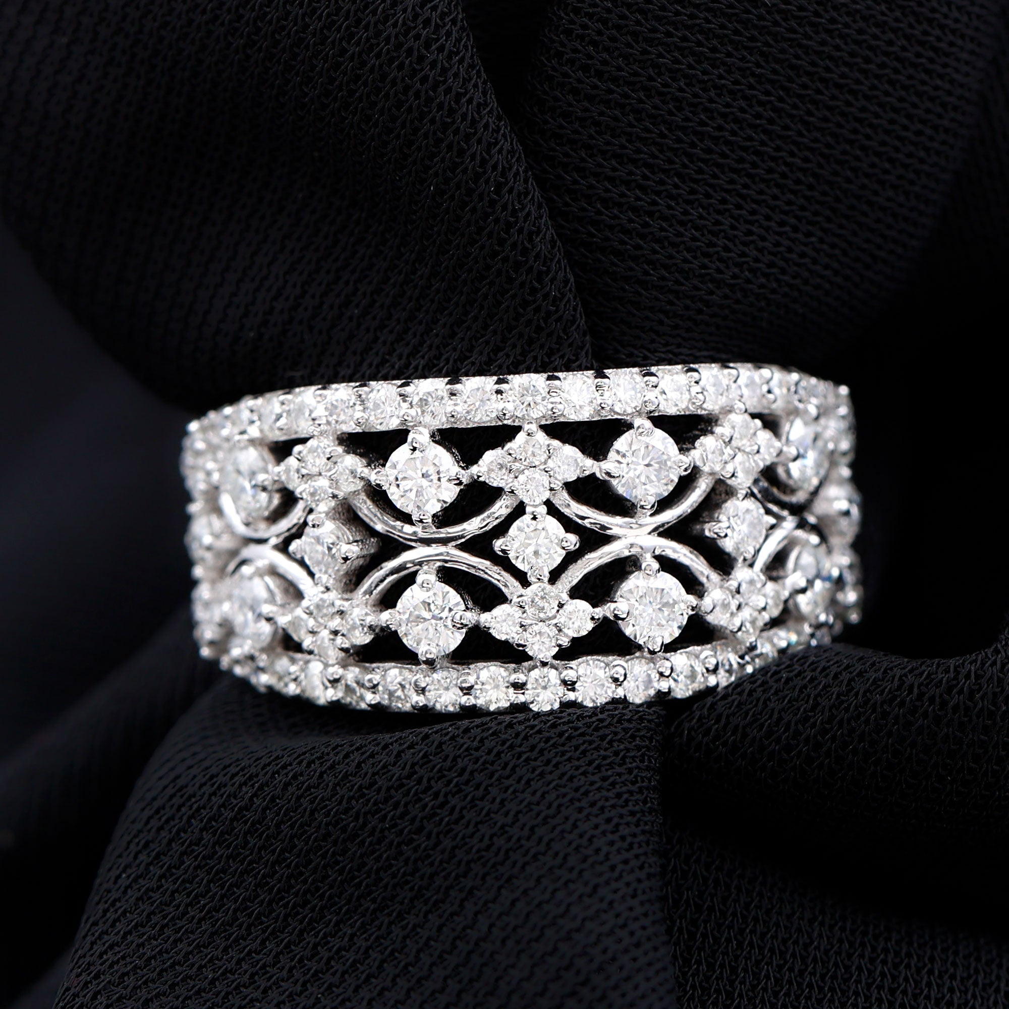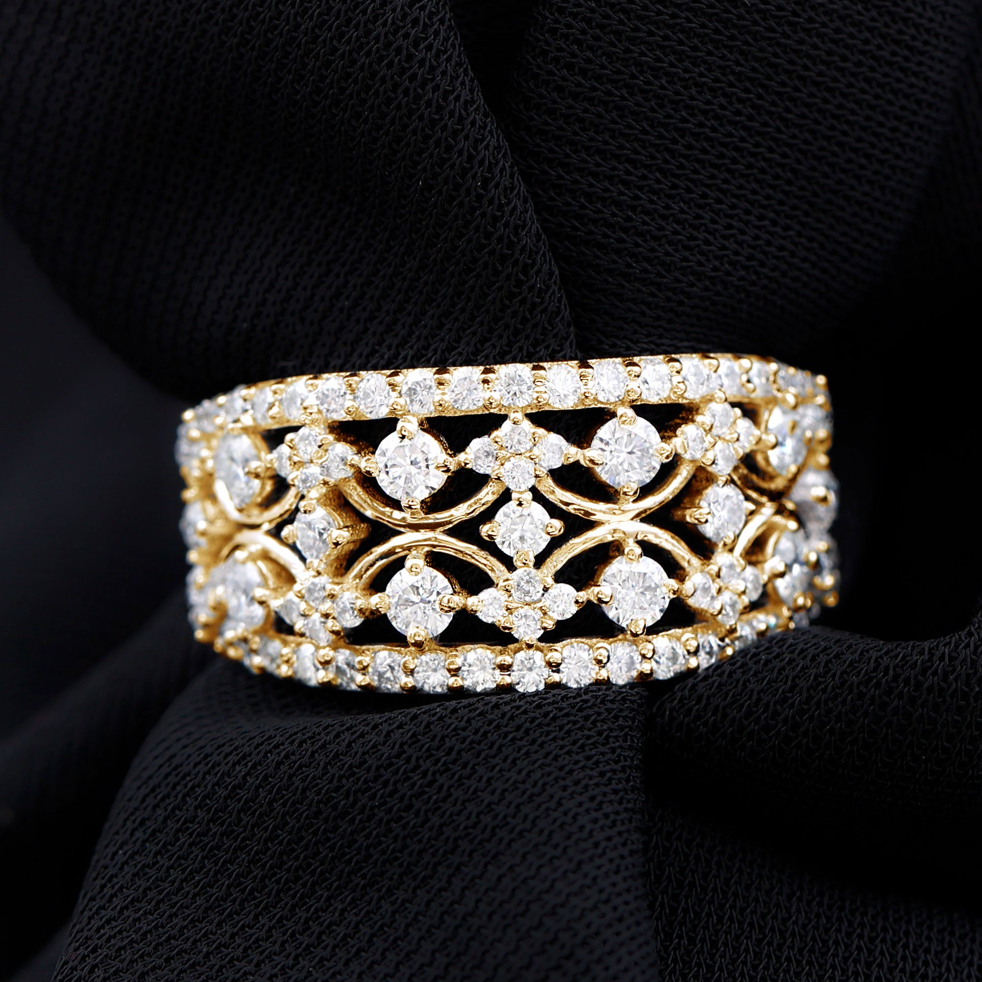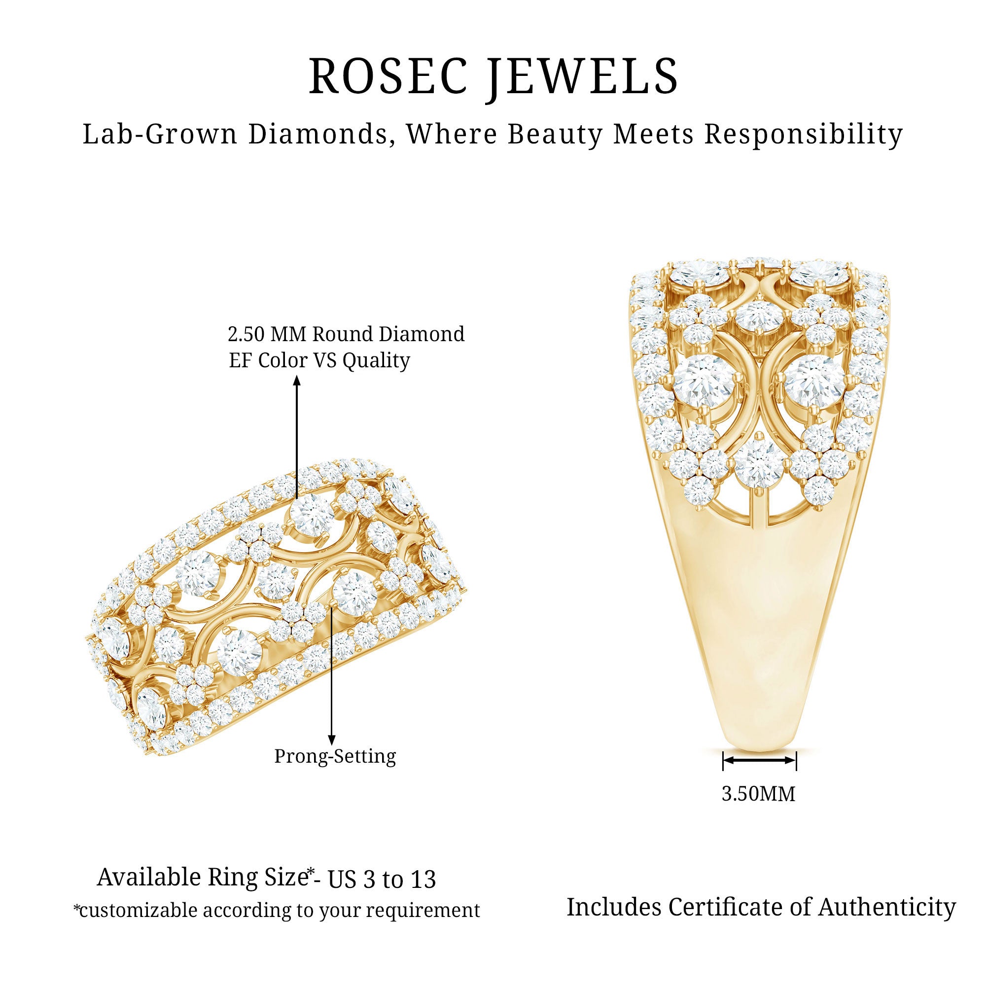 Say hello to the Diamond Vintage Band that looks straight out of a royal love story. Exquisitely crafted with timeless elegance, this Vintage Anniversary Ring is a true work of art. Every detail of the design reflects classic sophistication blended with classic craftsmanship, making it a perfect symbol of enduring love. The Wedding Band for Women showcases a wide silhouette with a regal presence, adorned with intricate curved patterns complemented by the dazzling sparkle of round cut lab grown diamonds set in prong setting. The open work design allows light to dance through every curve, enhancing the brilliance of every stone. The lab created diamond boosts EF color and VS clarity, offering a remarkable brightness that elevates the luxurious feel of the Anniversary Wedding Band. It is the perfect choice for someone who appreciates artistry, heritage, and a bold statement of everlasting beauty.