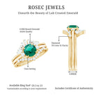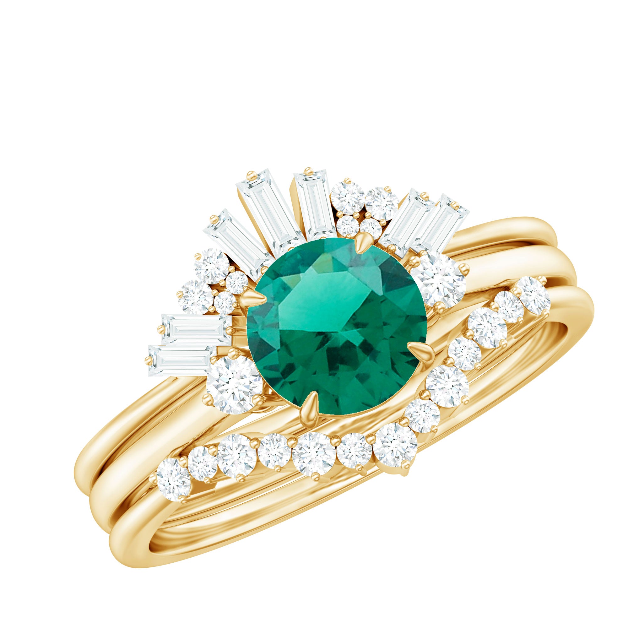 Step into timeless elegance with this Vintage Inspired Wedding Bridal Ring Set, a perfect harmony of classic beauty and modern craftsmanship. The centerpiece is a graceful Three Stone Engagement Ring, featuring a 6 mm Round Shape Lab Created Emerald of AAAA Quality that glows with rich green hues. Flanked by delicate Diamond stone on each side, it captures the charm of vintage design with a fresh, eco-friendly twist. Complementing the engagement ring are two Curved Enhancer Bands, each uniquely adorned with dazzling Diamond stones. One enhancer sparkles with a mix of Baguette and Round Diamond stones, creating a stunning contrast and intricate detail. The other enhancer is adorned with shimmering Round Diamond stones, adding a graceful curve that hugs the center ring perfectly. This Lab Emerald Engagement Ring with Enhancer is about versatility and meaning. Available in various ring sizes, this Wedding Engagement Ring Set fits comfortably and can be worn together or separately to suit any occasion. Presented in a stylish jewelry box, this Wedding Ring Set for Women makes a thoughtful gift or an unforgettable promise of love. Celebrate your story with these sparkling rings that blend vintage charm, sustainability and elegance all in one.