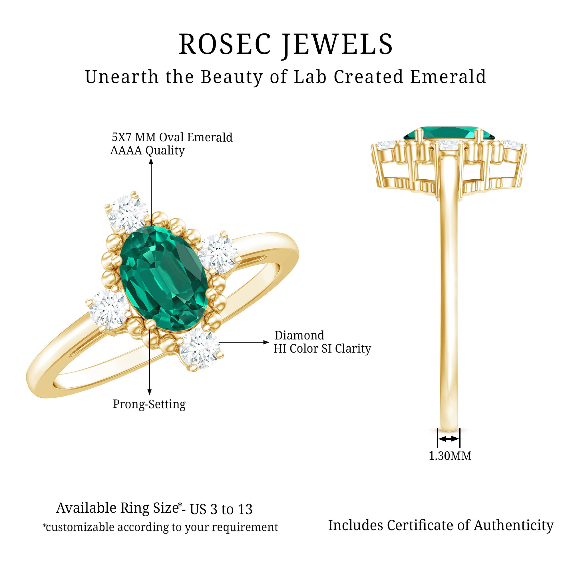 A reminiscent of bygone romance, this Vintage Looking Engagement Ring makes a perfect choice for anyone who want an engagement ring with a touch of history for their special day. At the center of this romantic design is a stunning 5X7 mm Oval Shape Lab Created Emerald of AAAA Quality in Prong Setting, glowing with rich green color. The Lab Emerald is surrounded by a vintage inspired design. Dazzling HI-SI Diamond stones are carefully placed around the design, adding sparkle and elegance. This Oval Engagement Ring blends old-world charm with modern values. The Lab Created Emerald stone is ethically sourced and known for its lush green color. Whether you are drawn to the vintage aesthetic or simply want a ring that stands out from the crowd, this Lab Emerald Diamond Engagement Ring is a true statement of love and individuality. Graceful and full of meaning, this Lab Emerald Solitaire Ring is a piece of jewelry that will make anyone fall in love.