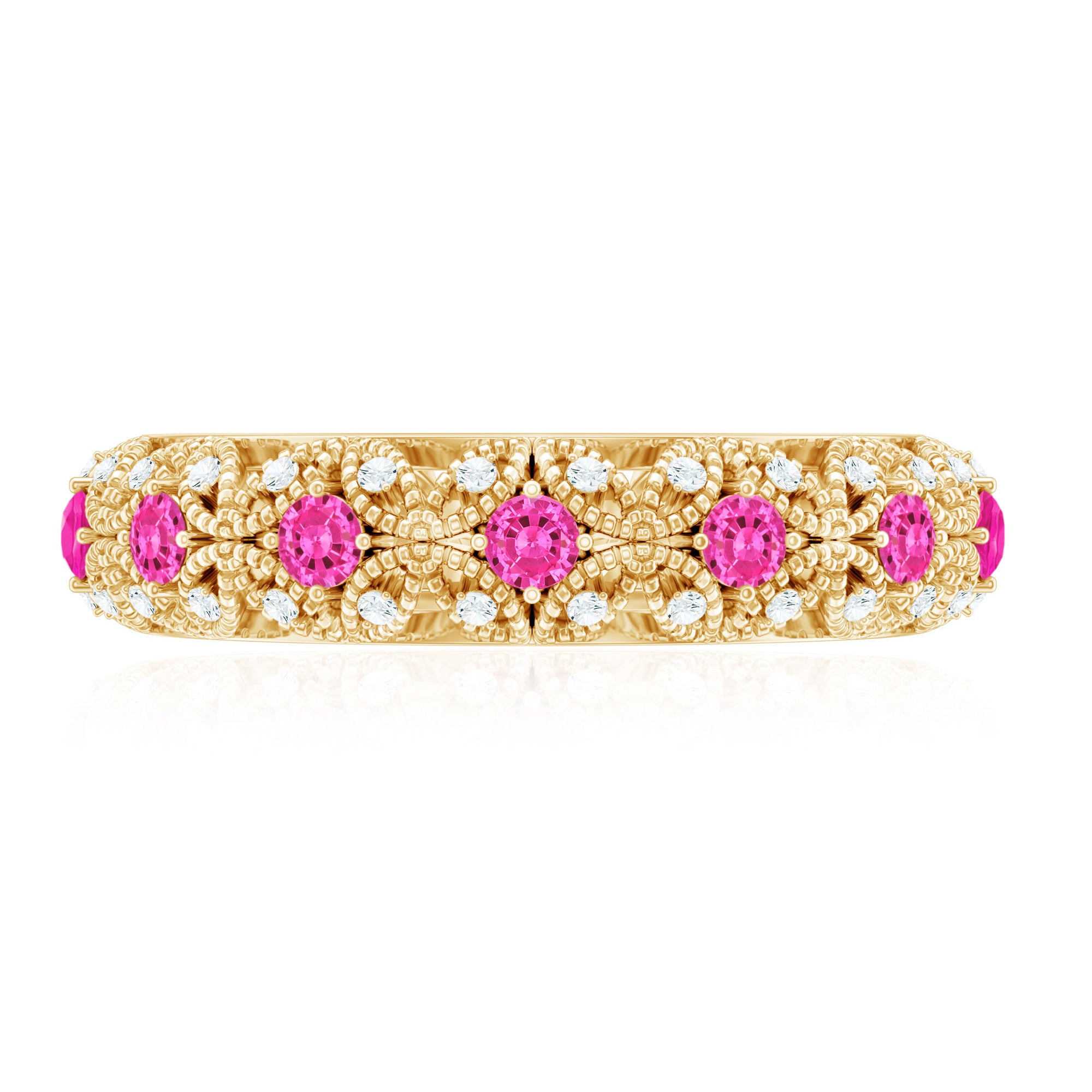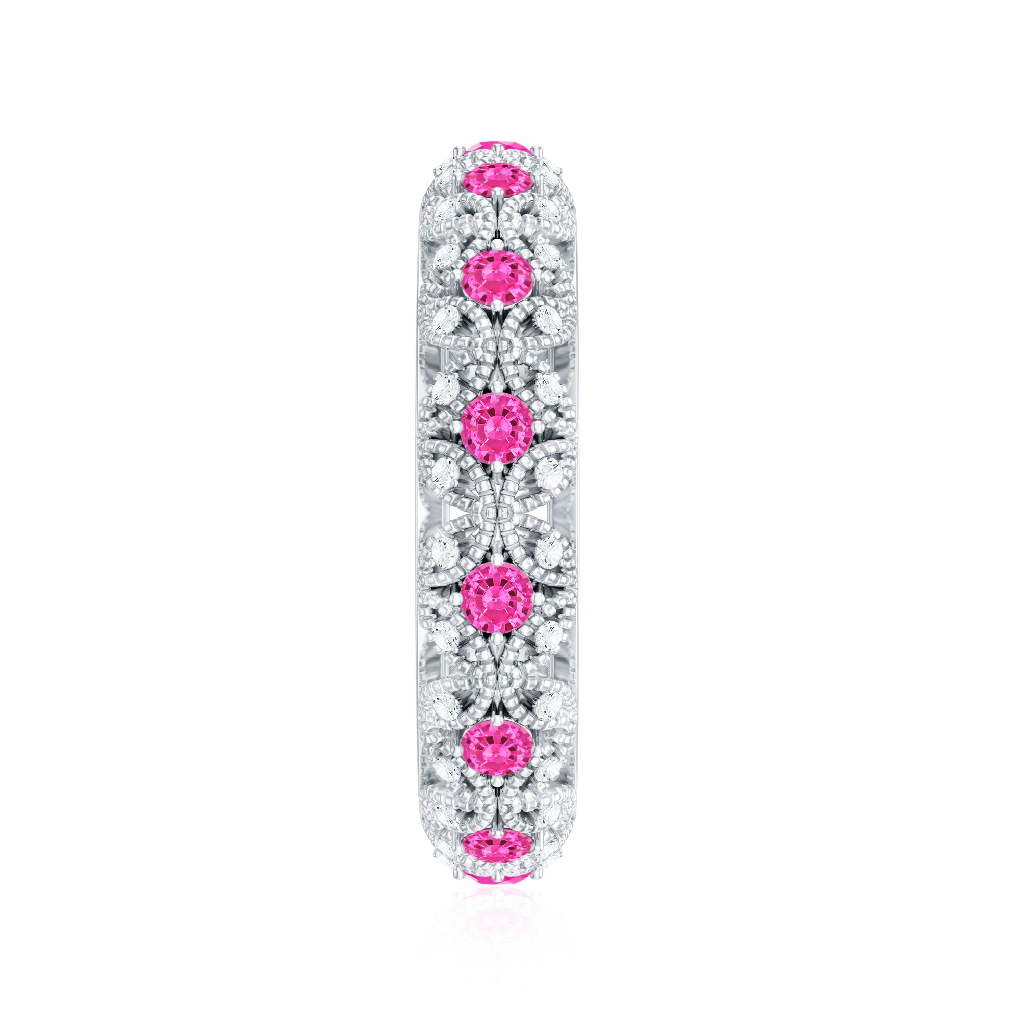 Step back in time with our Vintage Inspired Wedding Band, a masterpiece of nostalgia and timeless elegance. The band is adorned with round Lab Grown Pink Sapphires and glistening Diamond stones, meticulously set in delicate milgrain flower patterns. This Pink Sapphire and Diamond Band exudes vintage charm and sophistication, making it the perfect choice for brides who appreciate classic beauty and craftsmanship. This Sapphire Wedding Band will elevate the style with the adorable shine of HI-SI Quality Diamond and AAAA Quality Lab Made Pink Sapphire. This beautiful band will accentuate her figure and always remind her of your love whenever she looks at her finger. Grab this Vintage Anniversary Band for your special one and make the day memorable for the rest of your life.