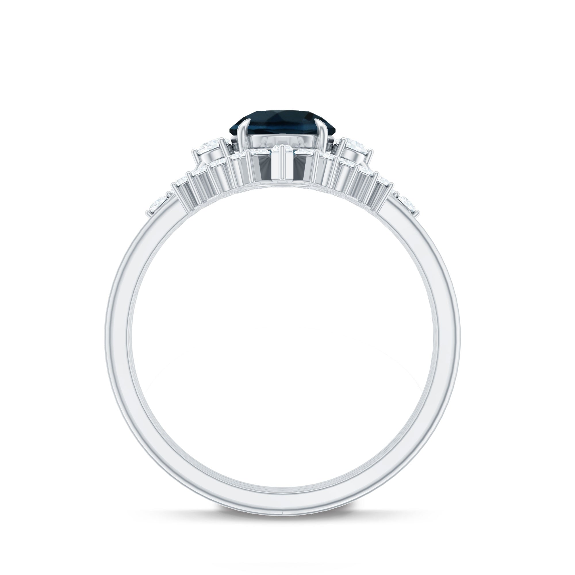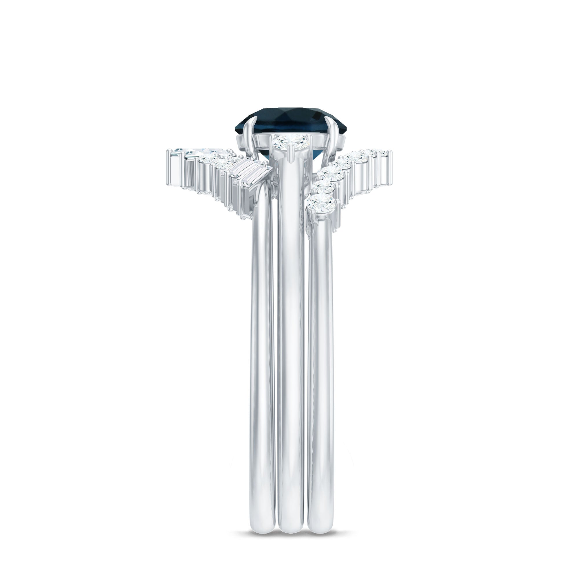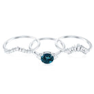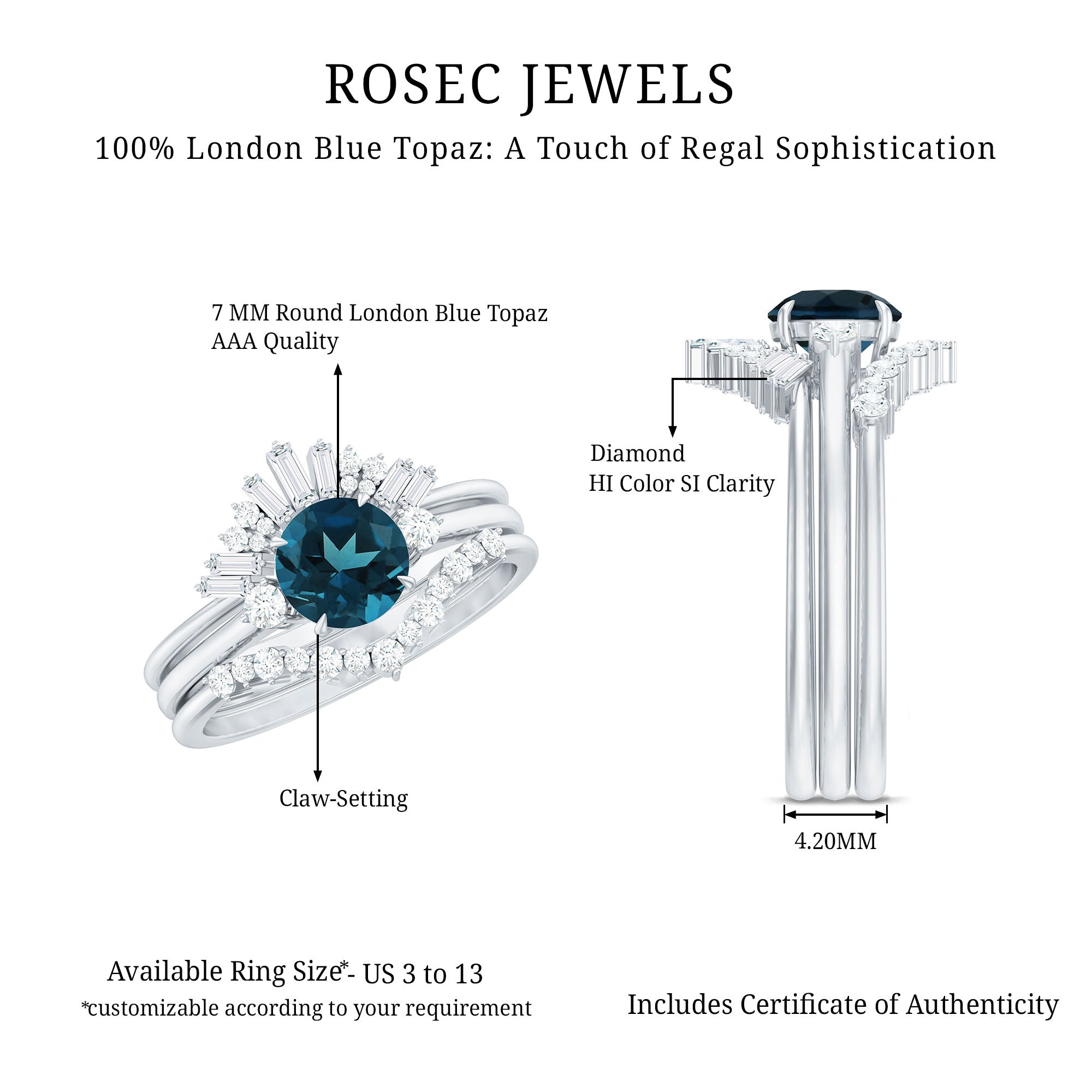 Resembling a relic from bygone days, this London Blue Topaz Bridal Ring Set narrates a tale of everlasting love and beauty. It features a 7 MM round cut London Blue Topaz, securely held in a claw setting. Flanking each side, a radiant diamond contributes the ideal amount of sparkle, enhancing the balance and elegance of the engagement ring. What distinguishes this Blue Topaz Wedding Ring Set is the inclusion of two enhancer bands. One band showcases a combination of round and baguette diamonds, exuding a striking sparkle that is both bold and timeless. The other band is adorned with round diamonds, adding a touch of grace. Collectively, they beautifully frame the central blue topaz ring, creating a stacked appearance that is both dramatic and romantic. This Trio Bridal Ring Set is designed for brides who appreciate a vintage aesthetic while desiring a hint of modernity. Whether you cherish heirloom details or simply seek a ring that makes a statement, this Engagement Ring with Enhancers offers an exquisite fusion of classic elegance and contemporary sparkle. A genuine testament to love, style, and enduring beauty.