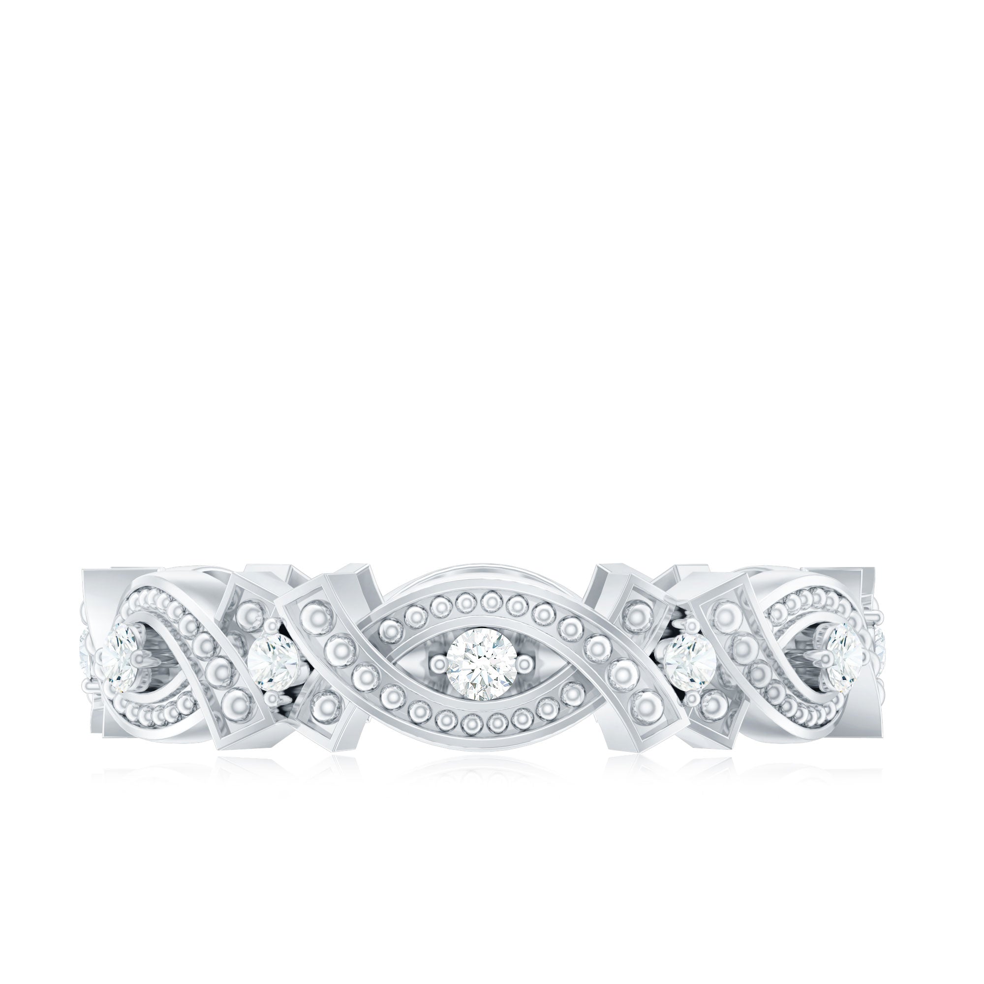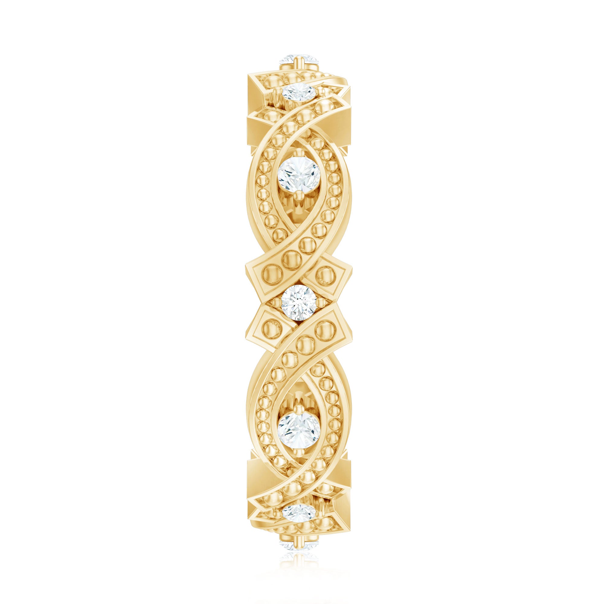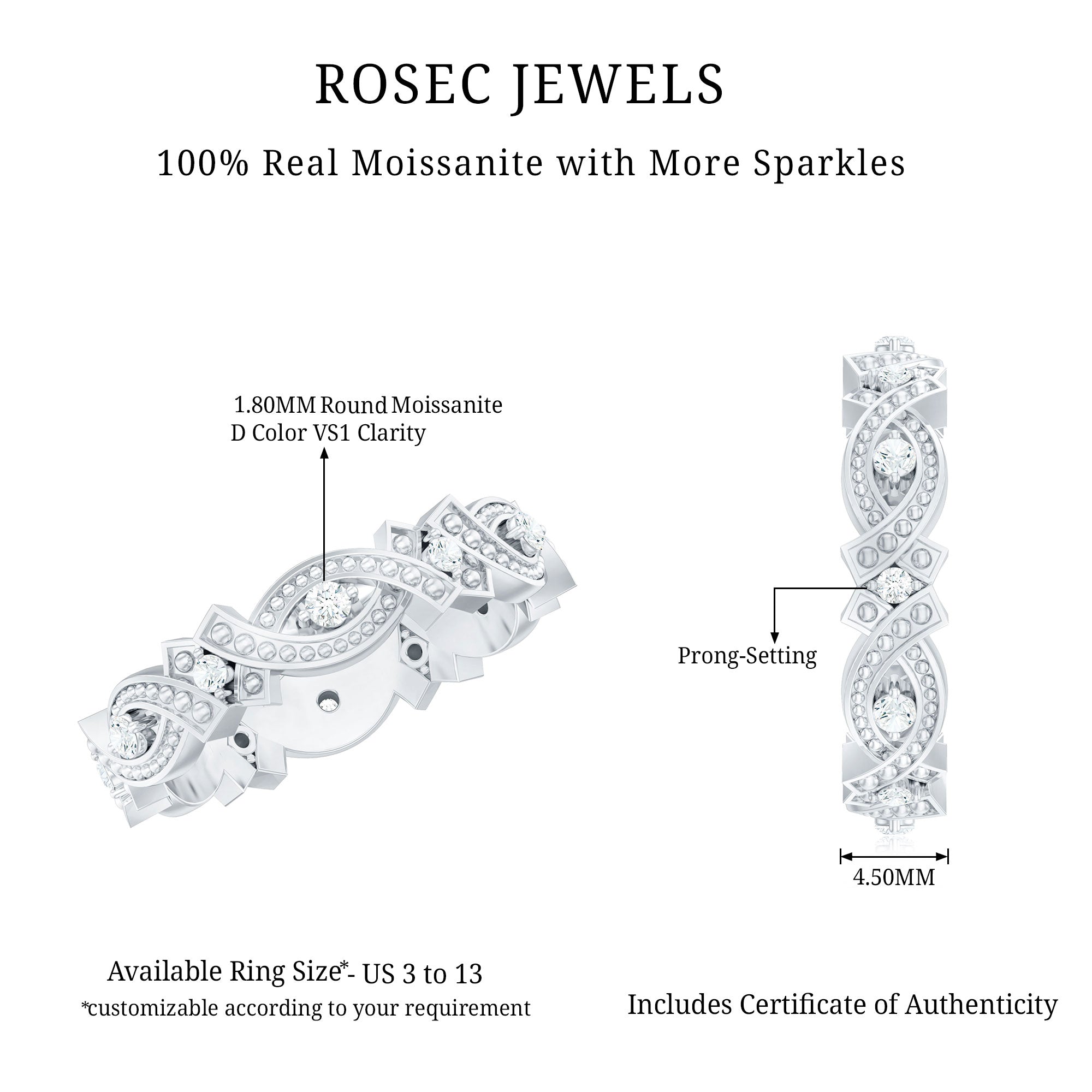 Step into the charm of a bygone era with this Vintage Style Wedding Band, a ring that beautifully marries antique aesthetics with modern brilliance. Designed with a distinct old-world appeal, this Full Eternity Band features round moissanite stones that sparkle with timeless fire, each one cradled securely in 2-prong setting. What truly defines this Moissanite Anniversary Band is its intricate beaded detailing, a signature touch of vintage artistry. Tiny metal beads dance along gracefully curved patterns, framing each D-VS1 quality moissanite. The contrast between the shimmering moissanite and the textured metal work adds depth and visual catch, giving the band a sense of character and history. Whether worn to mark a meaningful anniversary or simply as a statement of timeless style, this Vintage Moissanite Band feels like a treasure passed down through generations. It is a piece of art that tells a story. Elegant yet strong, detailed yet wearable, it is perfect for someone who finds beauty in tradition and meaning in design.