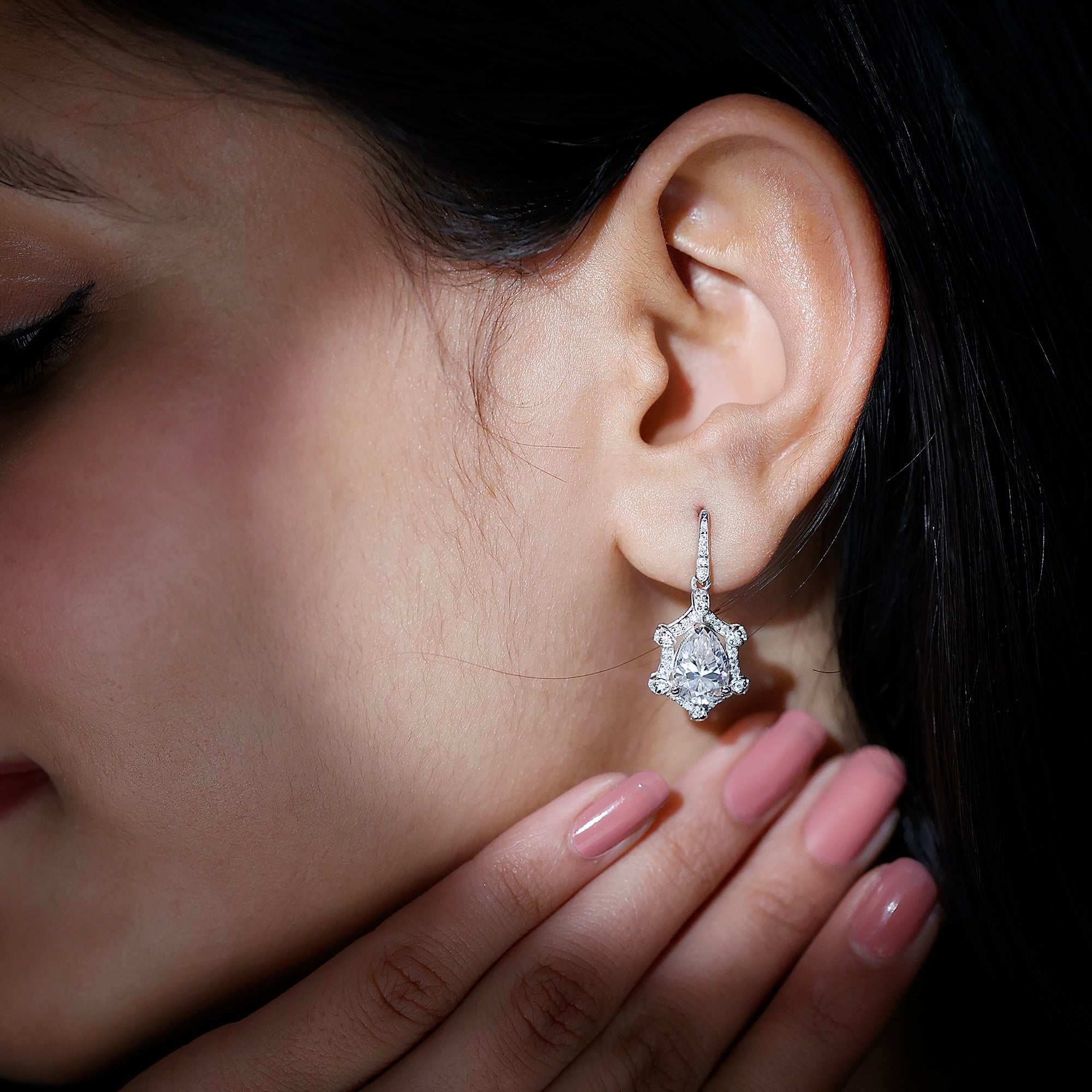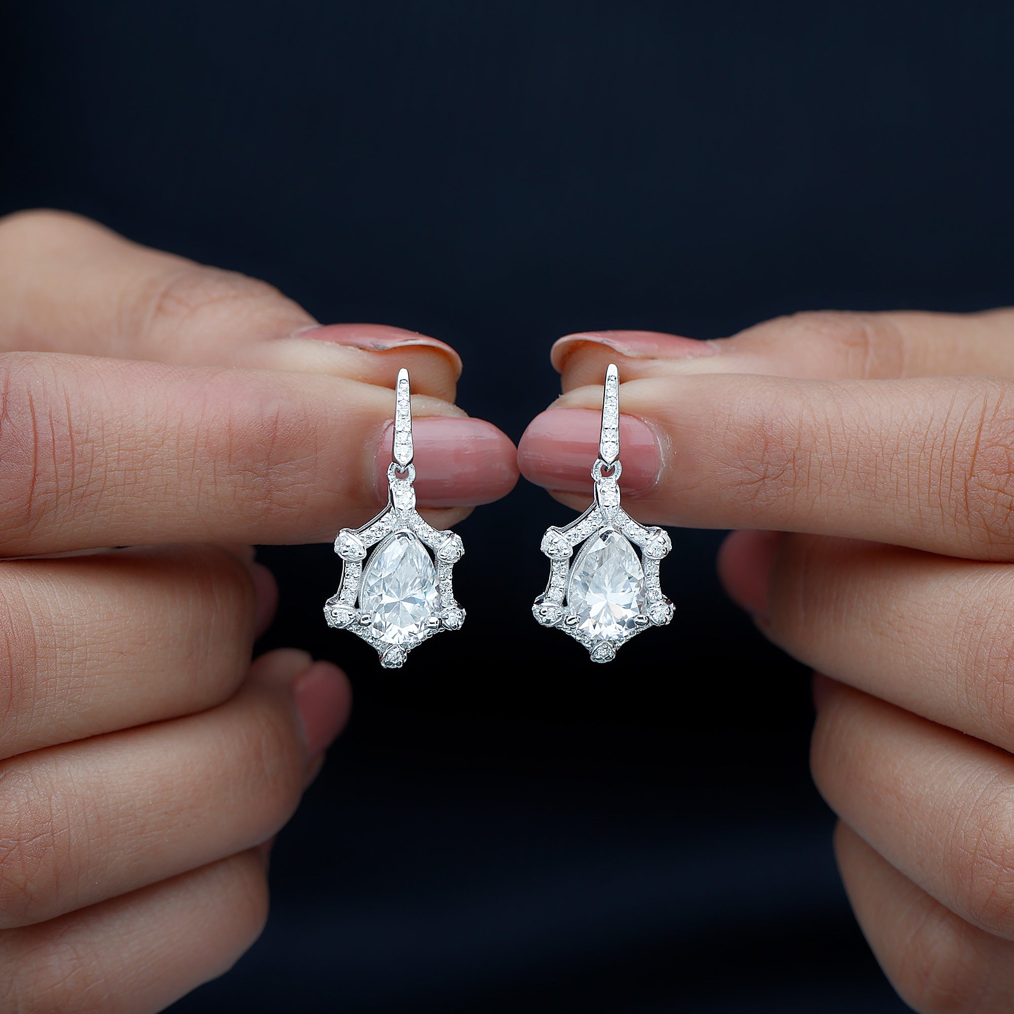 Brighten up your big day with the timeless sparkle of these stunning Wedding Drop Earrings. Featuring a beautiful 7X10 MM pear shaped moissanite in the center set in prong setting, these Silver Drop Earrings are designed to capture the light and everyones attention. Surrounding the center stone is a delicate halo of shimmering round cut stones, adding a vintage style touch to the overall design. Handcrafted in 14k White Gold Plated Silver and comes with secure screw back closure that ensures they stay comfortable in place throughout all your celebrations. Perfect for brides who dream of combining old world charm with modern sparkle, these Moissanite Earrings are a classic choice to complete your special look.
