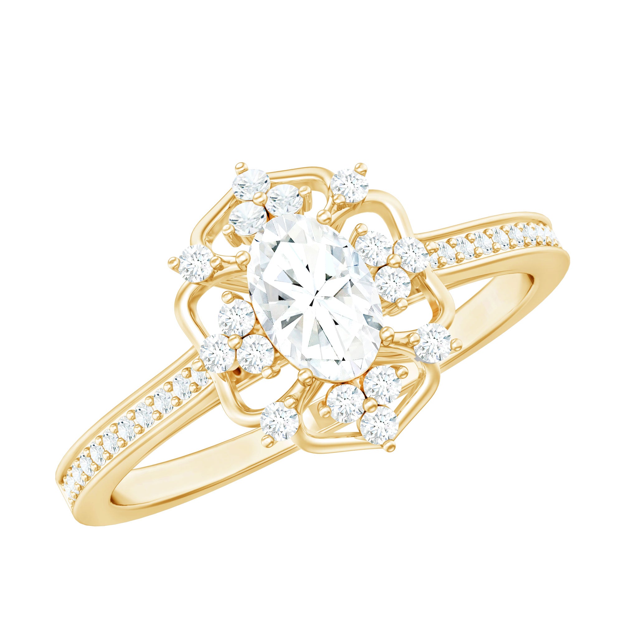 This Vintage Moissanite Engagement Ring is a timeless expression of elegance, love, and intricate craftsmanship. At its heart, the Floral Engagement Ring showcases a dazzling 4X6 MM oval shaped moissanite, graded D color and VS1 clarity, set securely in prong setting. Enhancing the center stone is a stunning arrangement of round moissanite stones, forming a graceful floral pattern that gives the Oval Engagement Ring a romantic appeal. The band features round moissanite stones, adding even more brilliance and visual interest to the design. This Art Deco Moissanite Ring is not just a piece of jewelry, it is a story of love, romance, and thoughtful design. Whether you are planning the perfect proposal, looking for a meaningful gift, or simply celebrating your own journey, this Moissanite Ring for Women is crafted to leave a lasting impression. It is a perfect choice for brides who love vintage charm, floral elegance, and a ring that stands out in both craftsmanship and symbolism. A piece made to be admired, cherished, and passed down through generations.