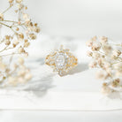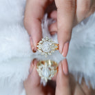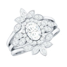 Infuse your love story with timeless elegance and floral inspired beauty through this exquisite Moissanite Wedding Ring Set. Designed for the bride who adores vintage romance with a hint of whimsy, this 3 Piece Bridal Set radiates charm and sophistication. At its heart lies a 5X7 MM oval cut moissanite, secured in a graceful claw setting and encircled by a sparkling halo. Leaf-like side stone detailing enhances the organic, nature-inspired design, blending flower power aesthetics with heirloom appeal. The engagement ring is flanked by two matching curved ring guards, each adorned with shimmering round moissanite stones over delicate marquise motifs. These bands wrap the center ring with seamless brilliance, creating a cohesive and dazzling look that is hard to miss. Whether worn all together for a bold statement or individually for a timeless vibe, this versatile Vintage Bridal Ring Set offers endless styling possibilities. Handcrafted with precision, this Oval Wedding Set pairs romantic design with modern craftsmanship. Elegant, radiant, and full of meaning, this floral bridal ring set is the perfect way to celebrate your unique love story. From YES to I DO and every moment in between, let this set be a lasting symbol of nature, love, and beauty blooming together forever.