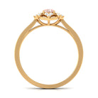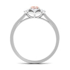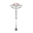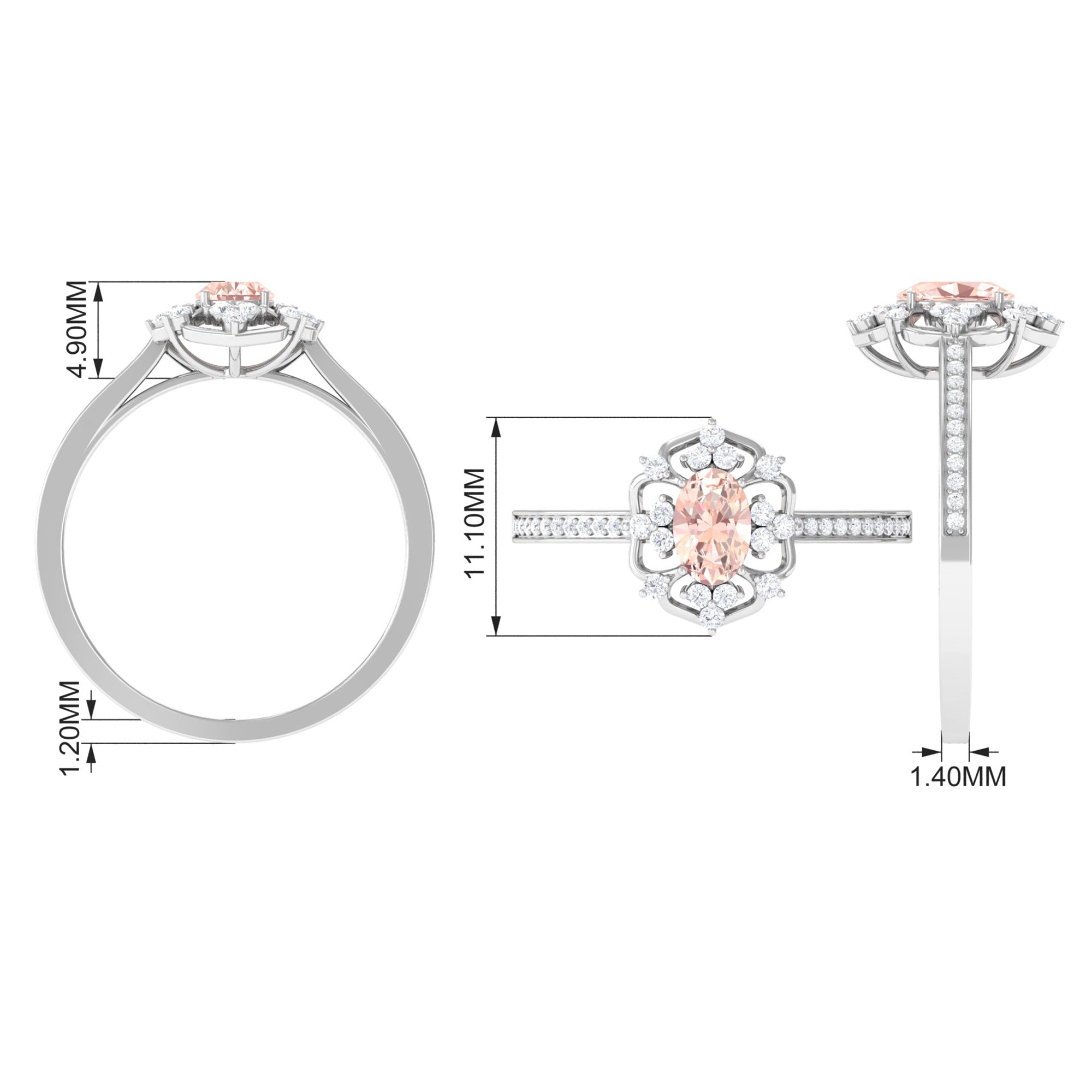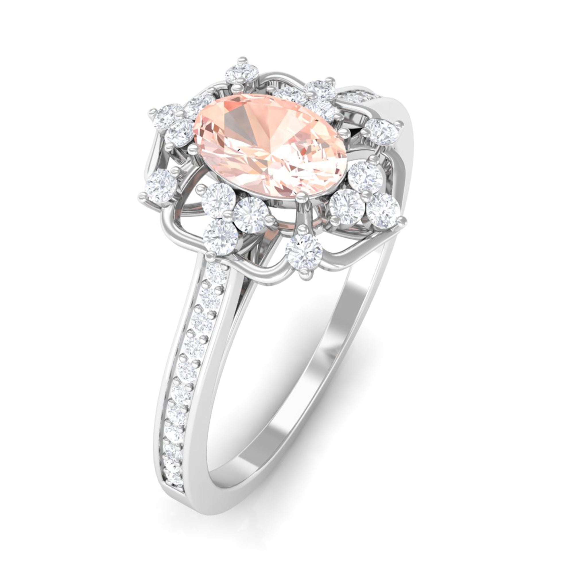 A center oval morganite, round Diamond, and intricate motifs are put together to create this engagement ring that gives off a vintage inspired elegance. The gemstones are brilliantly held in prongs, that beautify the overall design of the ring. The shank is studded with pave set round Diamond for a touch of extravagance. The blush pink hue of morganite makes it a delightful sight to hold on to for the rest of your life.