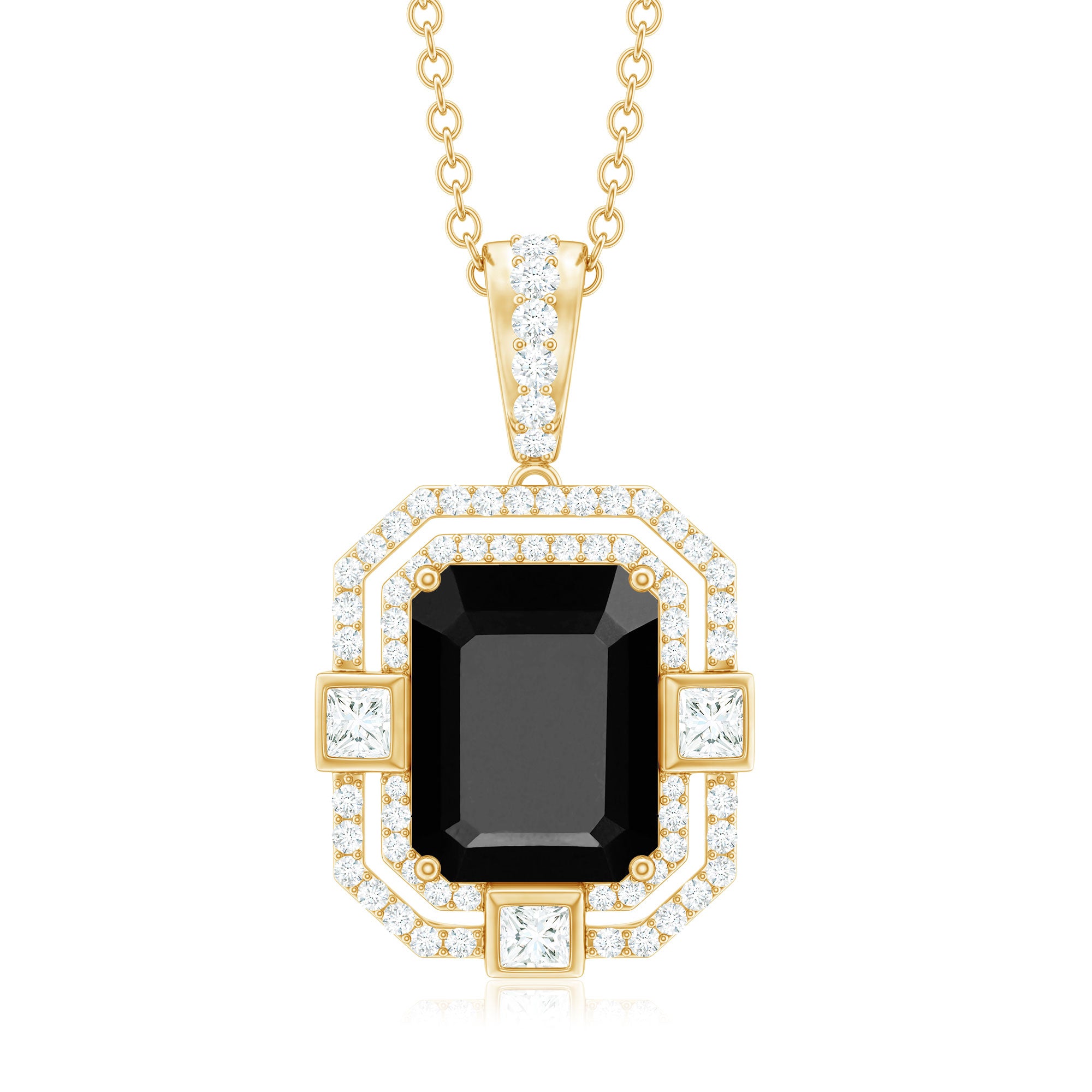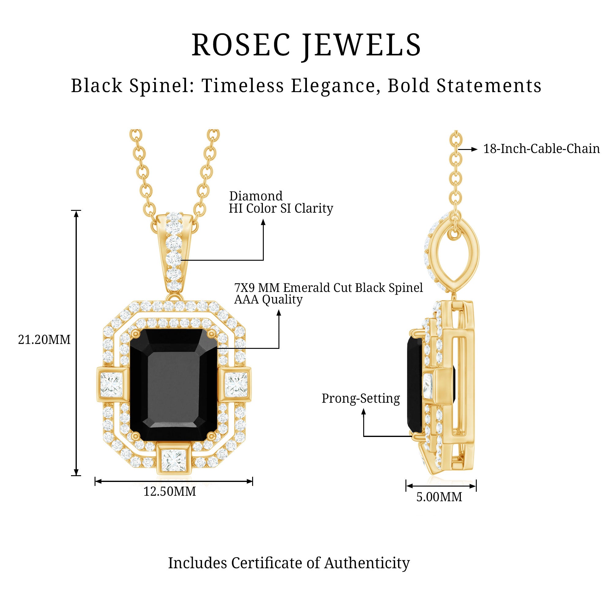 Leave a lasting impression on everyone with this Vintage Style Pendant adorned with Emerald Cut Black Spinel gracefully set in prong setting while the shimmer of Diamonds highlights the beauty of the centerpiece. Capture the attention with the mesmerizing allure of this Black Spinel Pendant that transforms your simple look into a completely glamorous and different look. Gift this captivating Halo Pendant to your loved ones on their special day and make that day unforgettable for them.