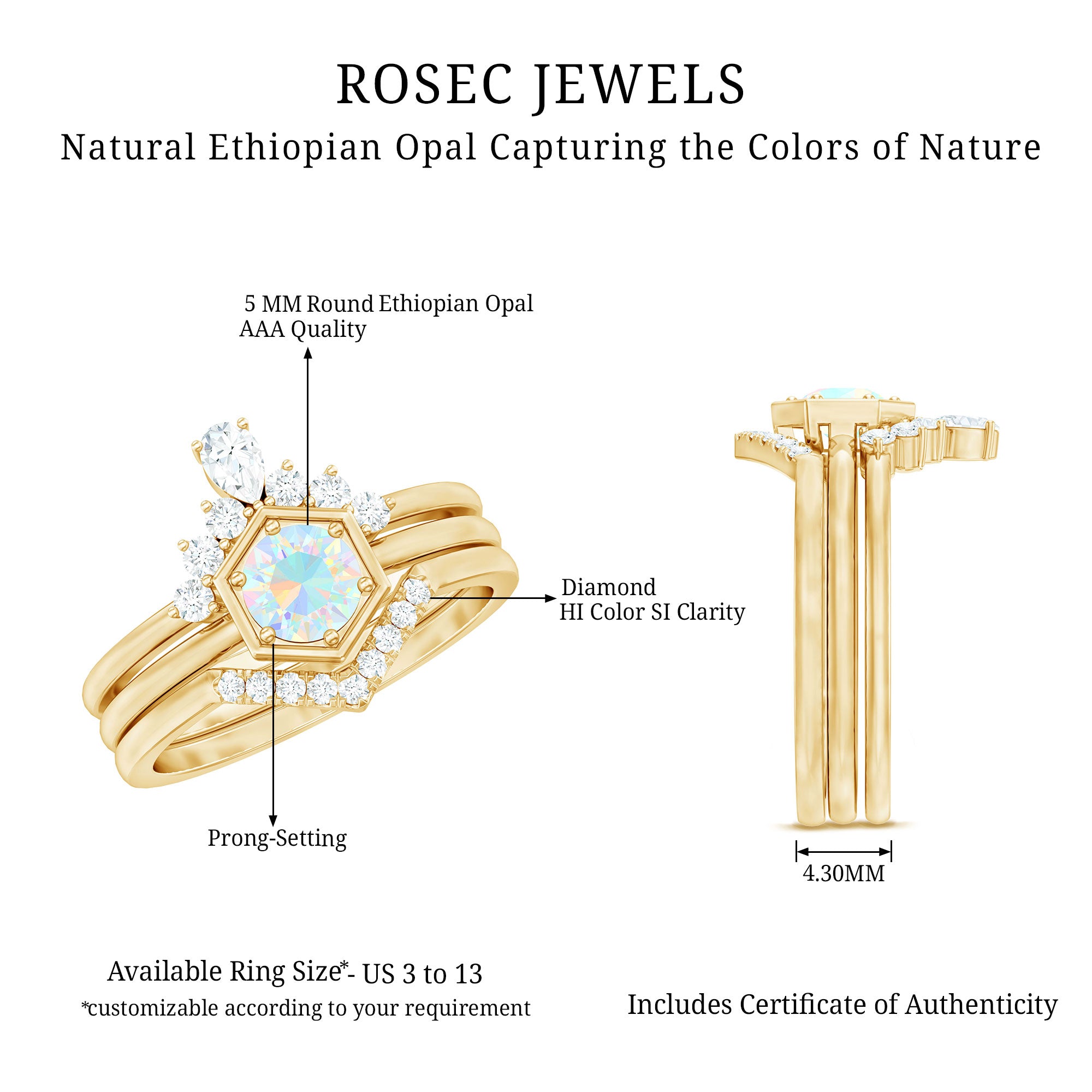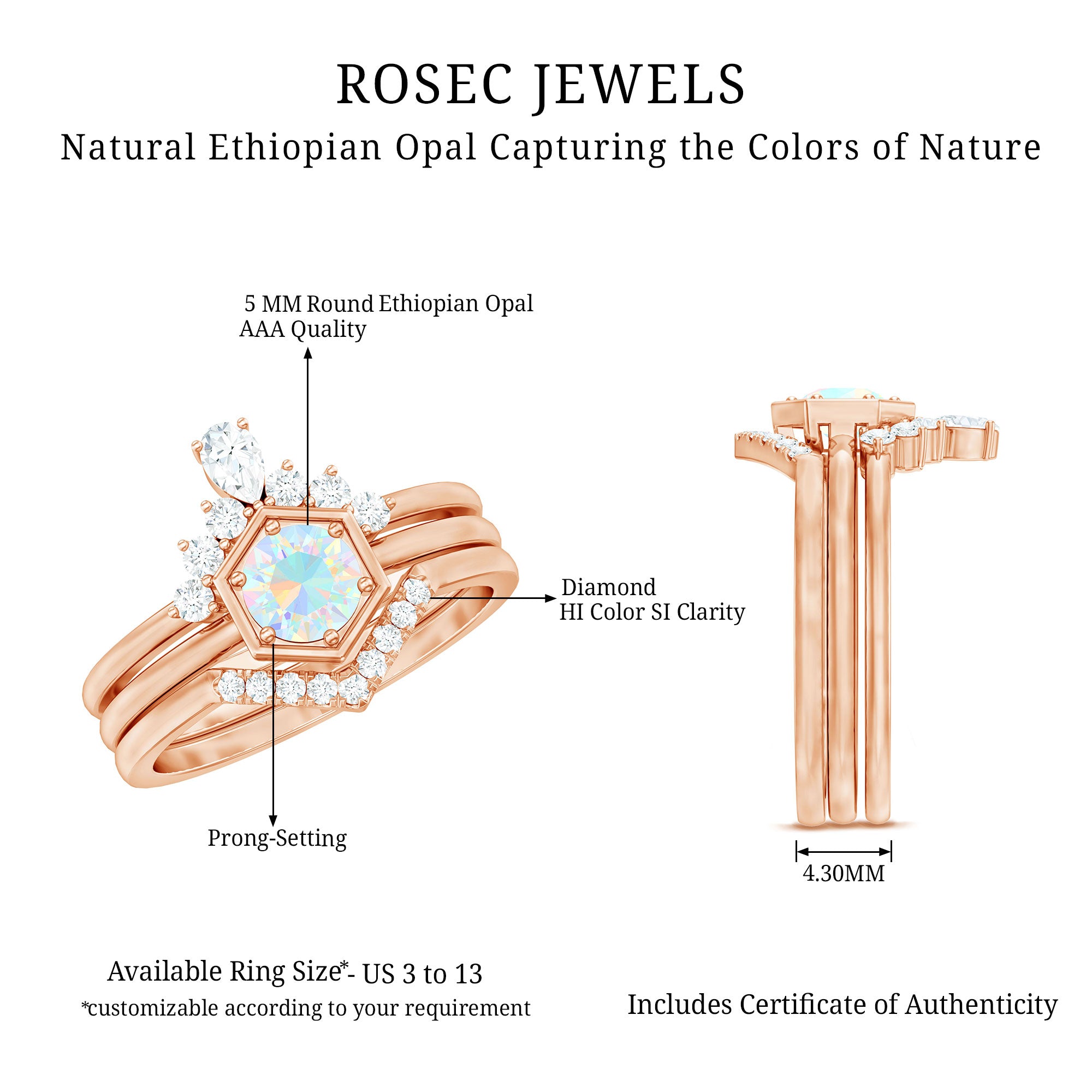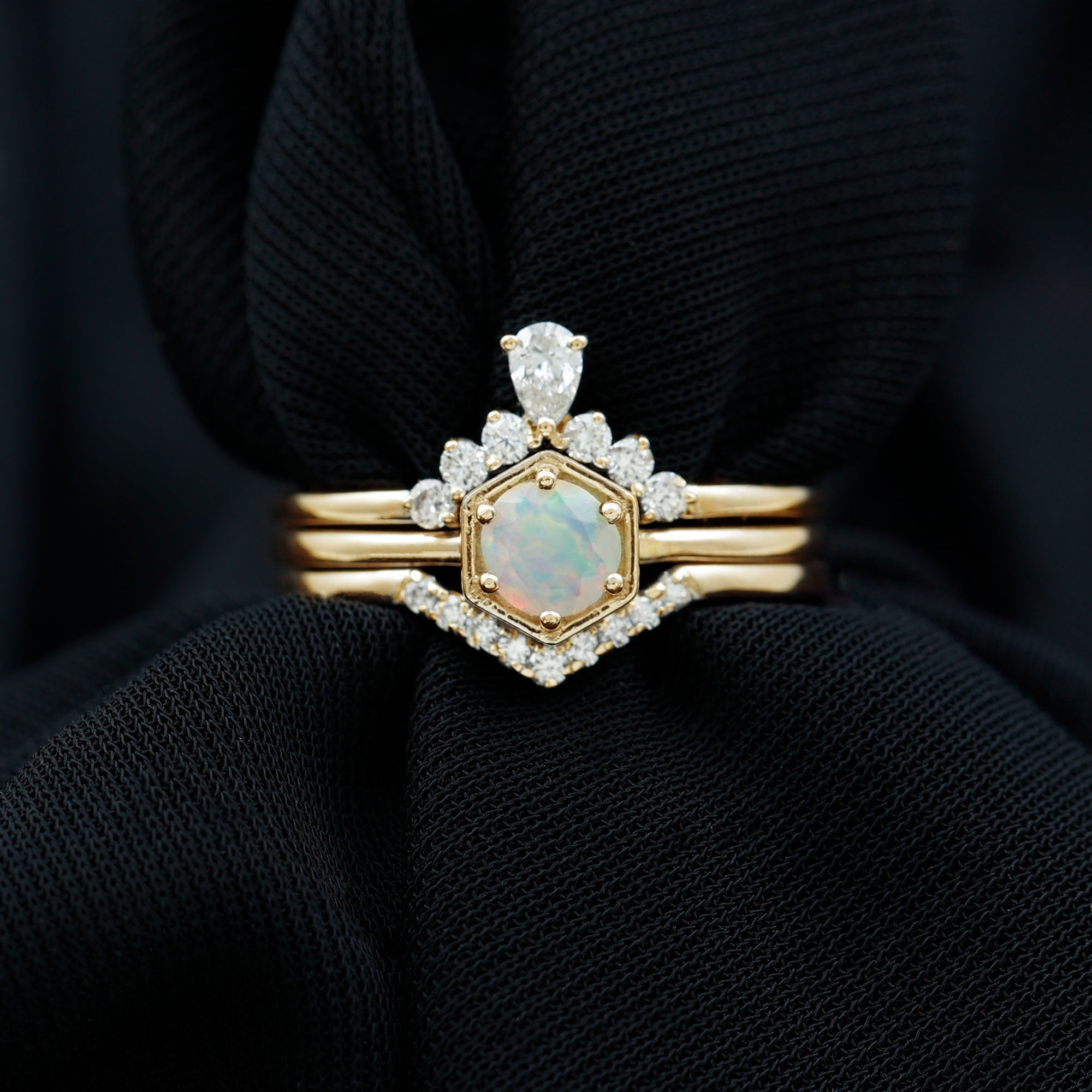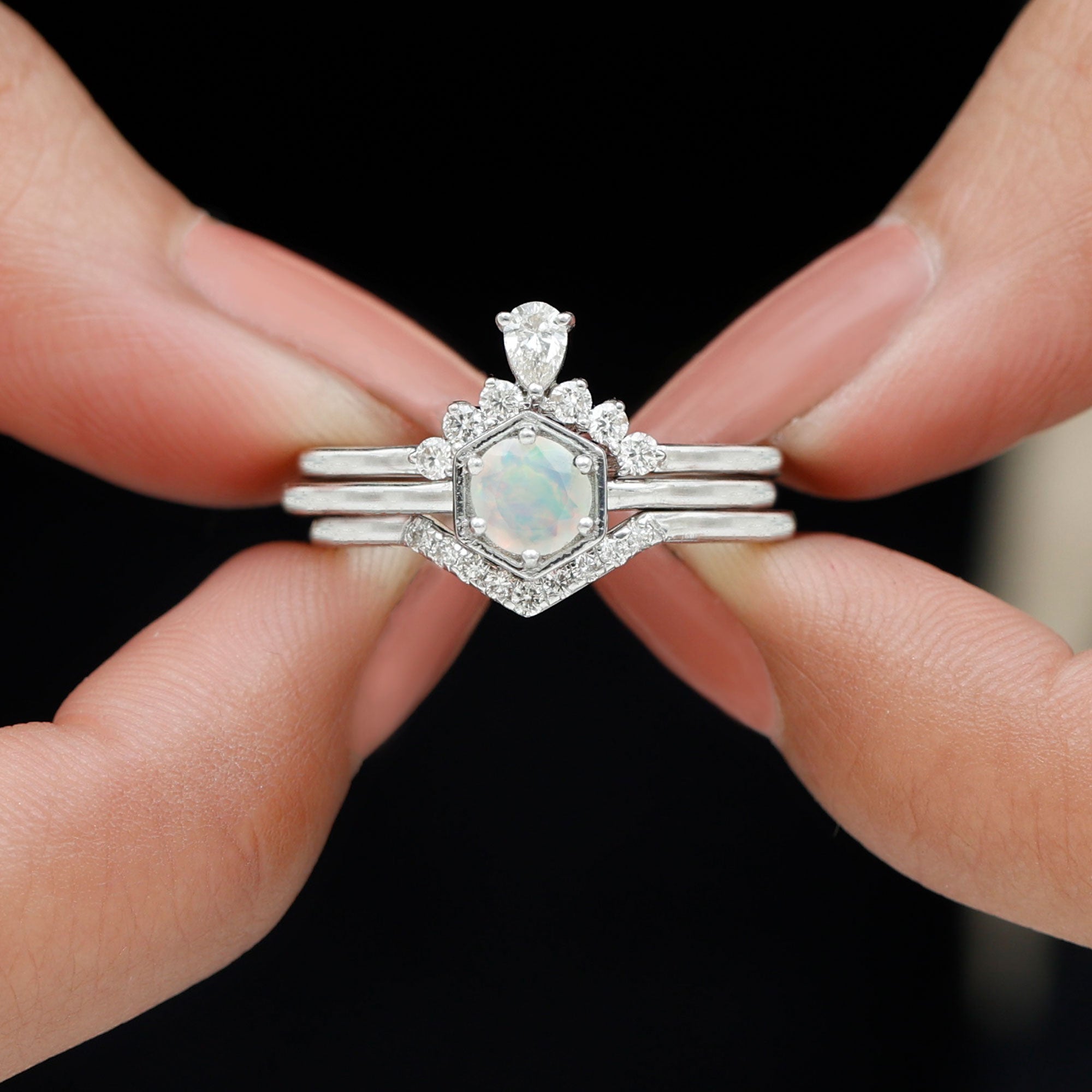 Step into a world of timeless elegance with this Wedding Engagement Ring Set, designed for the woman who treasures both classic beauty and modern flair. The center Solitaire Engagement Ring features a captivating 5 mm Round Shape Ethiopian Opal, set in Prong Setting within a striking hexagonal frame that highlights its mesmerizing play of colors. Complementing the Opal, two delicate V Shape Enhancer Rings frame the ring, each adorned with its own sparkling Diamond stones. One enhancer features a mix of Pear and Round Diamond stones, while the other features dainty Round Diamond stones for a touch of refined brilliance. Together, this Opal Wedding Ring Set creates a layered, opulent look that is both romantic and bold. Perfect for the woman who loves vintage charm with a contemporary twist, this Opal Bridal Ring Set symbolizes a love story that is both rare and beautiful. Carefully crafted and presented in a luxurious jewelry box, this 3 Piece Wedding Ring Set is available in a variety of sizes for the perfect fit. Whether you are saying I do or celebrating an unforgettable moment, this Wedding Bridal Ring Set is a radiant reminder of your eternal bond.