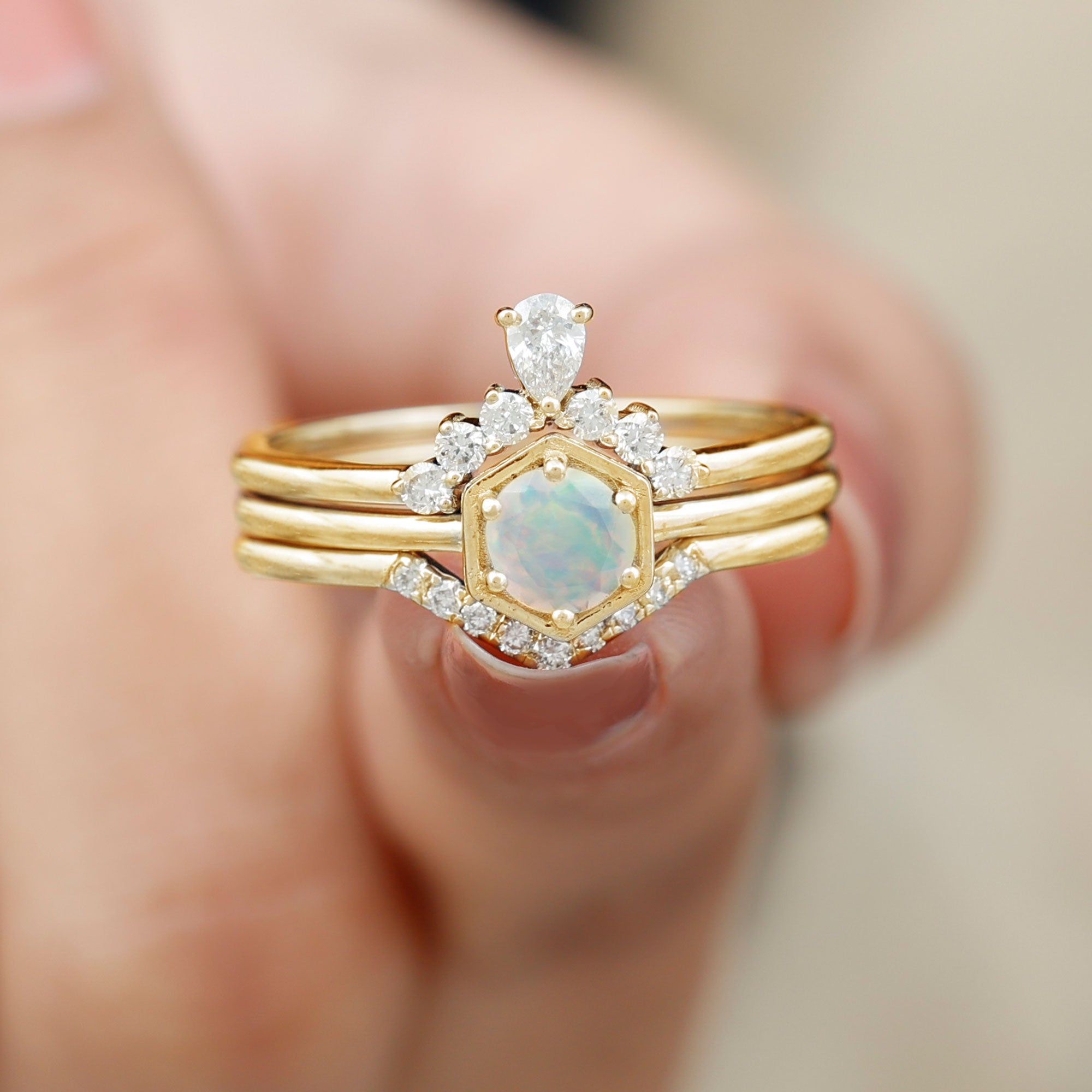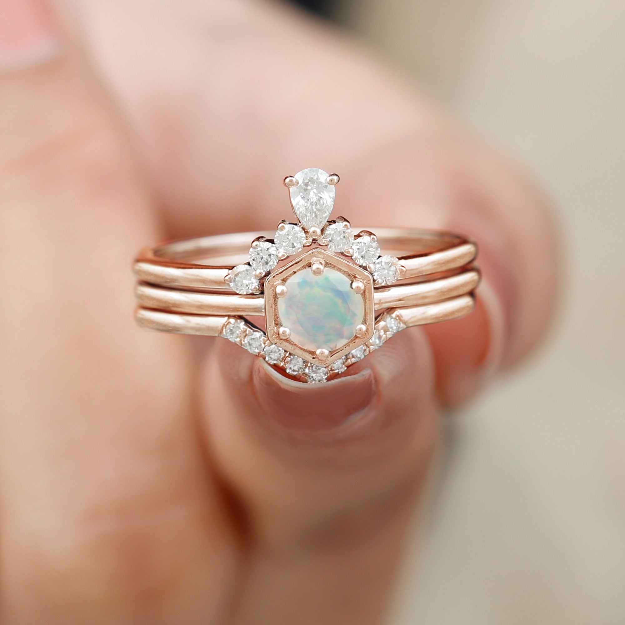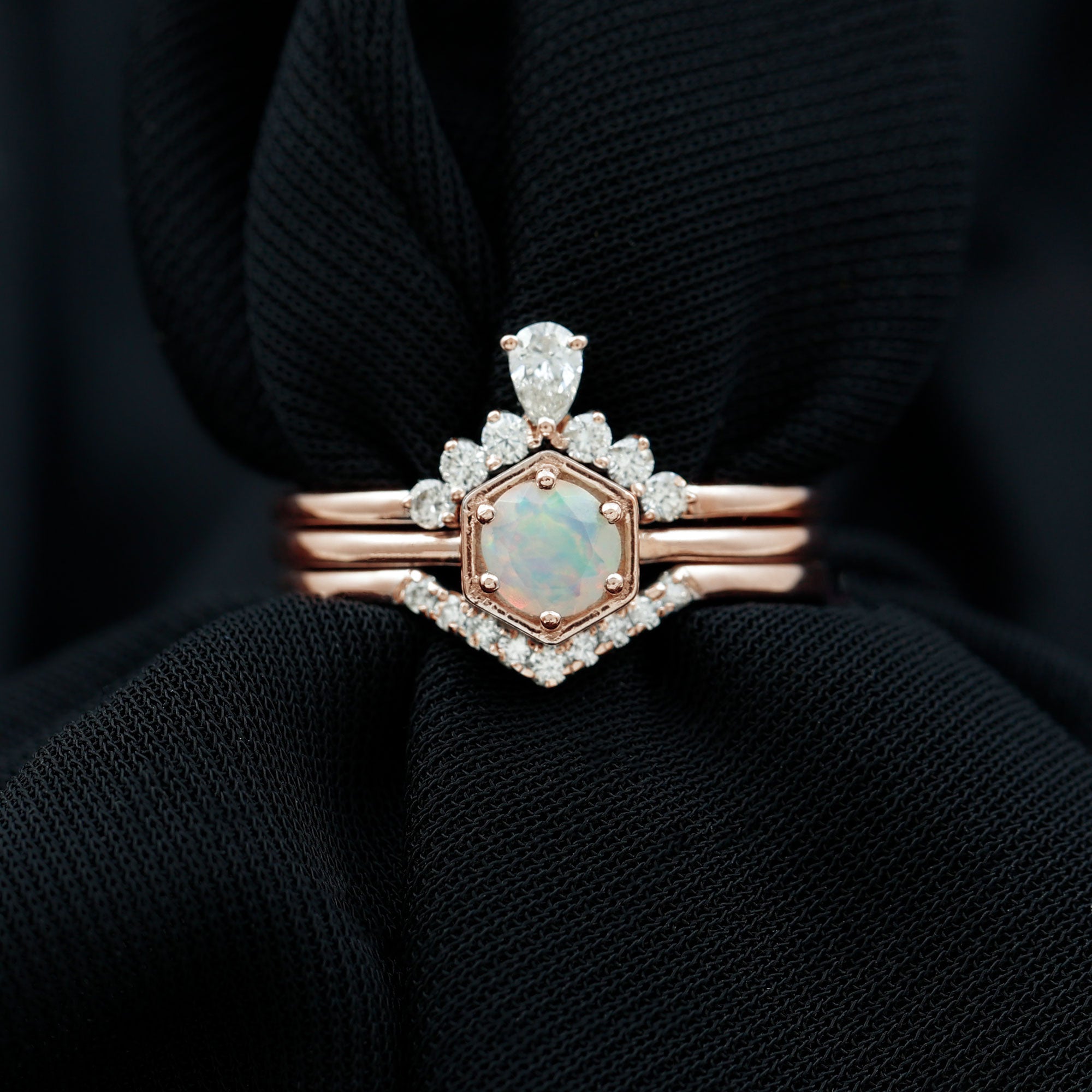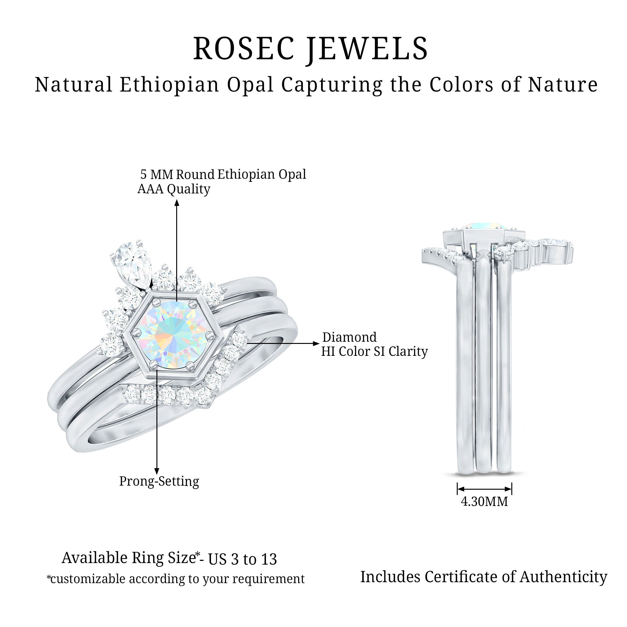 Step into a world of timeless elegance with this Wedding Engagement Ring Set, designed for the woman who treasures both classic beauty and modern flair. The center Solitaire Engagement Ring features a captivating 5 mm Round Shape Ethiopian Opal, set in Prong Setting within a striking hexagonal frame that highlights its mesmerizing play of colors. Complementing the Opal, two delicate V Shape Enhancer Rings frame the ring, each adorned with its own sparkling Diamond stones. One enhancer features a mix of Pear and Round Diamond stones, while the other features dainty Round Diamond stones for a touch of refined brilliance. Together, this Opal Wedding Ring Set creates a layered, opulent look that is both romantic and bold. Perfect for the woman who loves vintage charm with a contemporary twist, this Opal Bridal Ring Set symbolizes a love story that is both rare and beautiful. Carefully crafted and presented in a luxurious jewelry box, this 3 Piece Wedding Ring Set is available in a variety of sizes for the perfect fit. Whether you are saying I do or celebrating an unforgettable moment, this Wedding Bridal Ring Set is a radiant reminder of your eternal bond.
