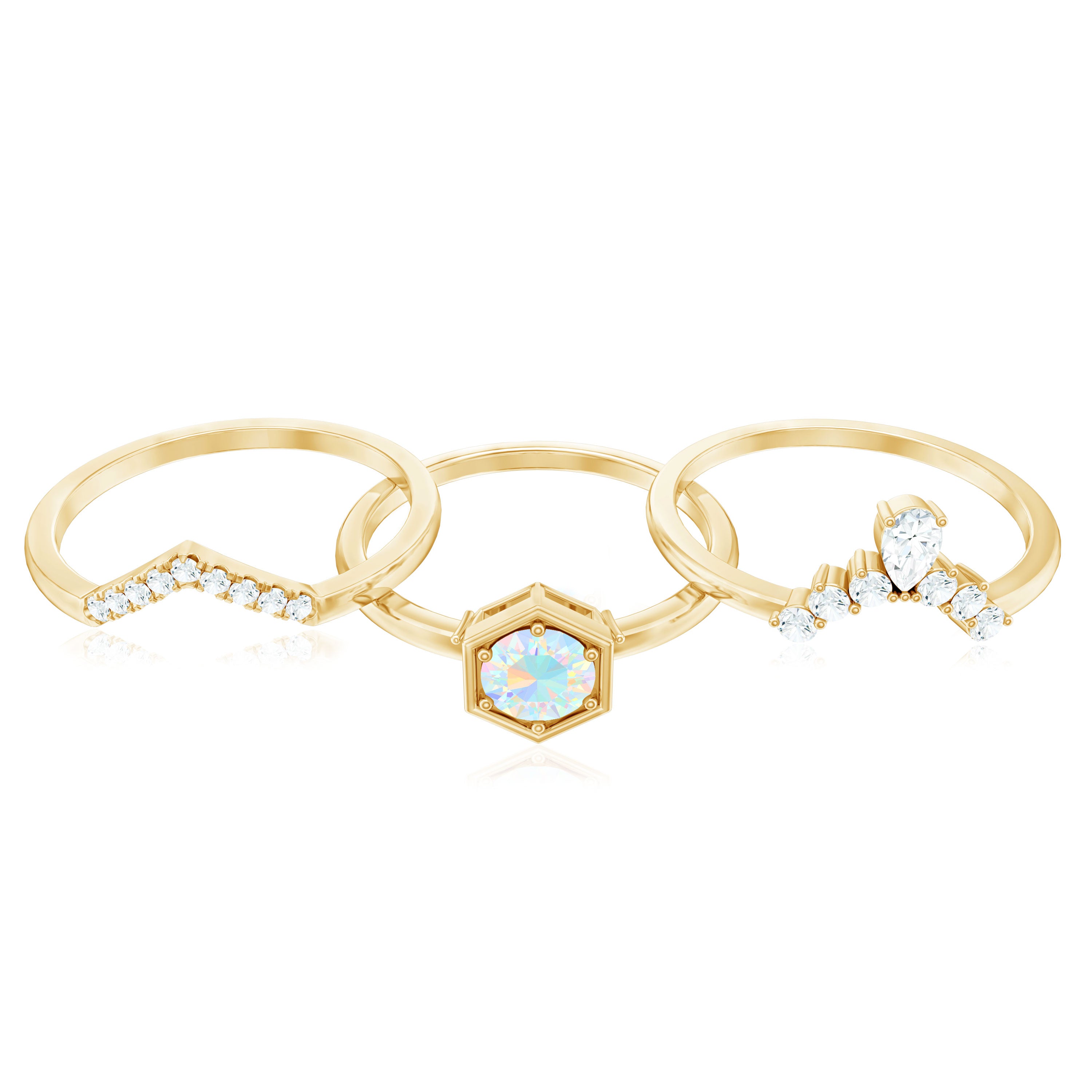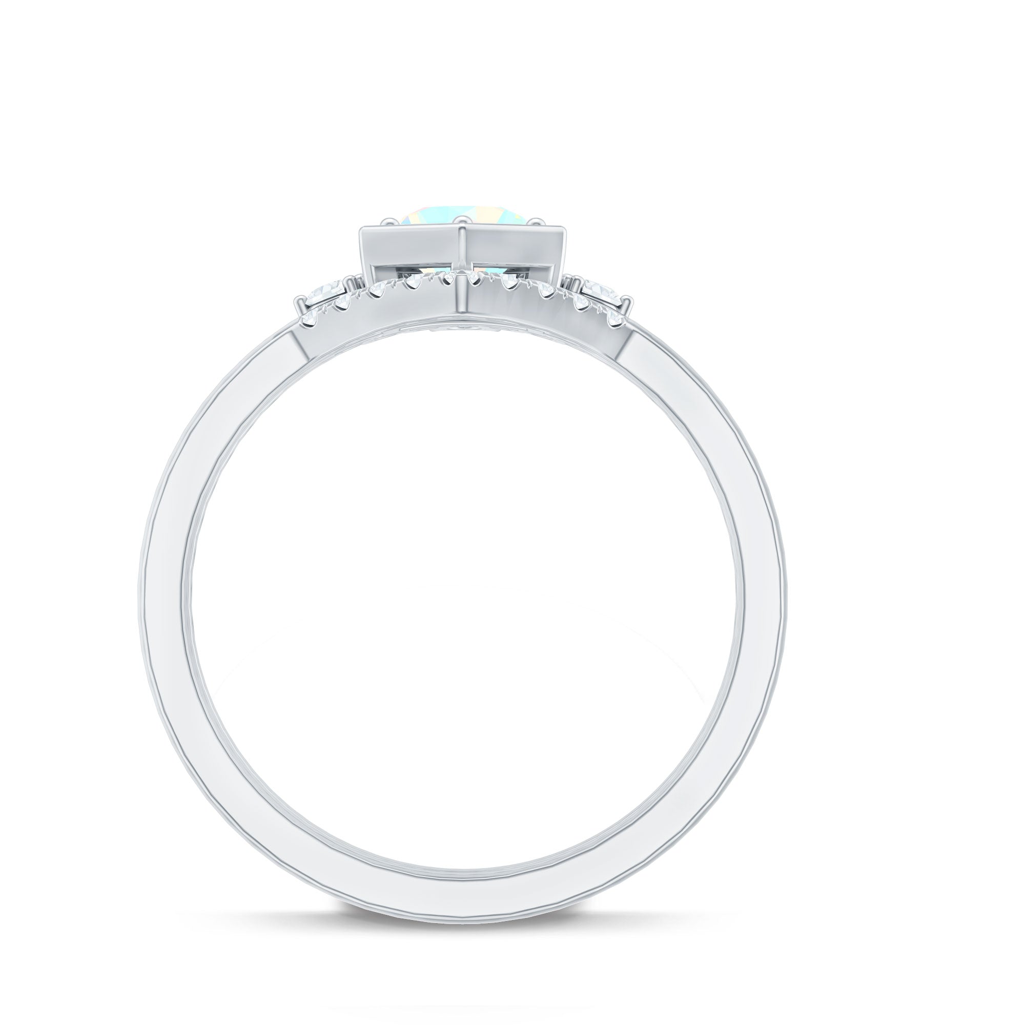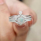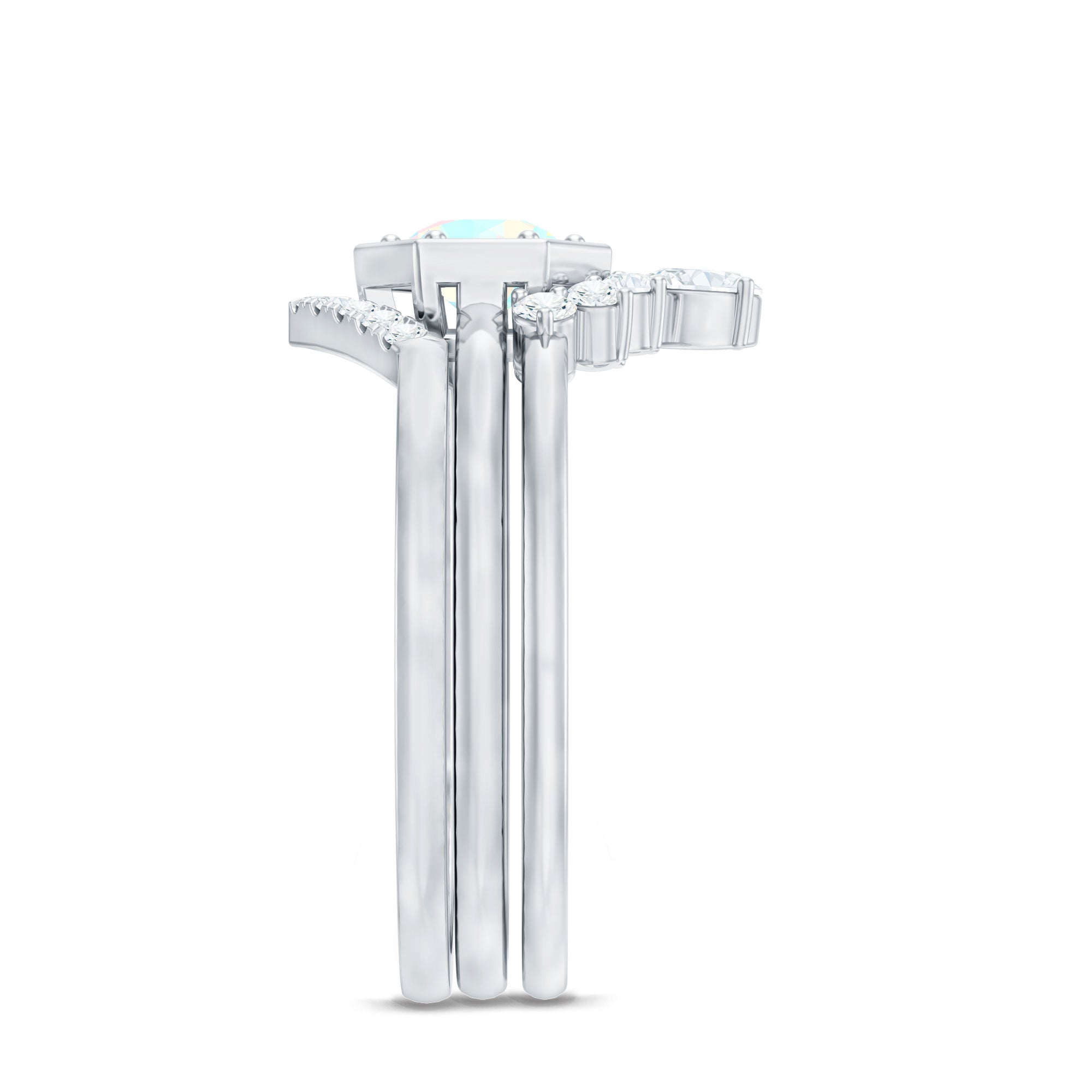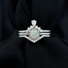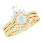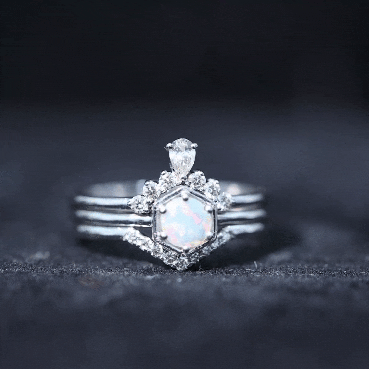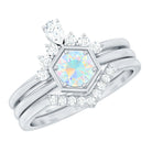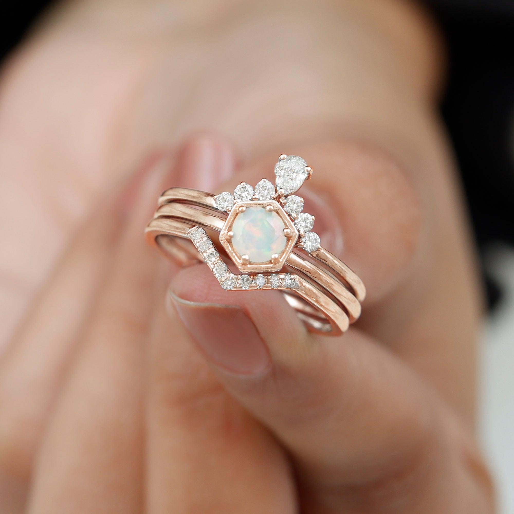 Step into a world of timeless elegance with this Wedding Engagement Ring Set, designed for the woman who treasures both classic beauty and modern flair. The center Solitaire Engagement Ring features a captivating 5 mm Round Shape Ethiopian Opal, set in Prong Setting within a striking hexagonal frame that highlights its mesmerizing play of colors. Complementing the Opal, two delicate V Shape Enhancer Rings frame the ring, each adorned with its own sparkling Diamond stones. One enhancer features a mix of Pear and Round Diamond stones, while the other features dainty Round Diamond stones for a touch of refined brilliance. Together, this Opal Wedding Ring Set creates a layered, opulent look that is both romantic and bold. Perfect for the woman who loves vintage charm with a contemporary twist, this Opal Bridal Ring Set symbolizes a love story that is both rare and beautiful. Carefully crafted and presented in a luxurious jewelry box, this 3 Piece Wedding Ring Set is available in a variety of sizes for the perfect fit. Whether you are saying I do or celebrating an unforgettable moment, this Wedding Bridal Ring Set is a radiant reminder of your eternal bond.