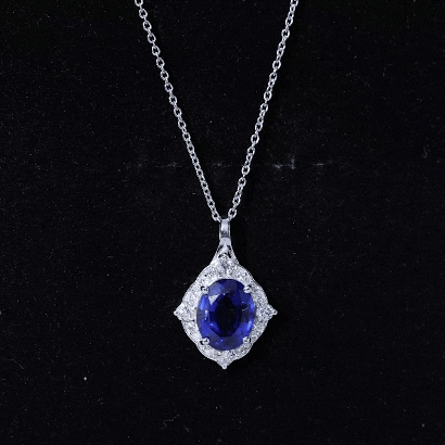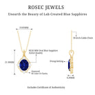 A scintillating Diamond halo gracefully surrounds an oval created blue sapphire, commanding attention and admiration. Additional round Diamond stones adorn the created blue sapphire, enhancing its glamorous allure. Held securely in place by prongs, this pendant forms a captivating and enchanting ensemble that transports you to a world of elegance and sophistication.