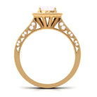 This vintage inspired engagement ring features a stunning oval rose quartz center stone, encircled by a glittering halo of Diamond stones. The soft pink hue of the rose quartz creates a romantic and feminine look, while the bright white Diamond side stones add a touch of glamour and sophistication. The gold beaded details along the band add to the overall elegance and charm of the design. Crafted in gold metal, this ring is a perfect choice for those who appreciate vintage-inspired styles and want a unique and memorable engagement ring.