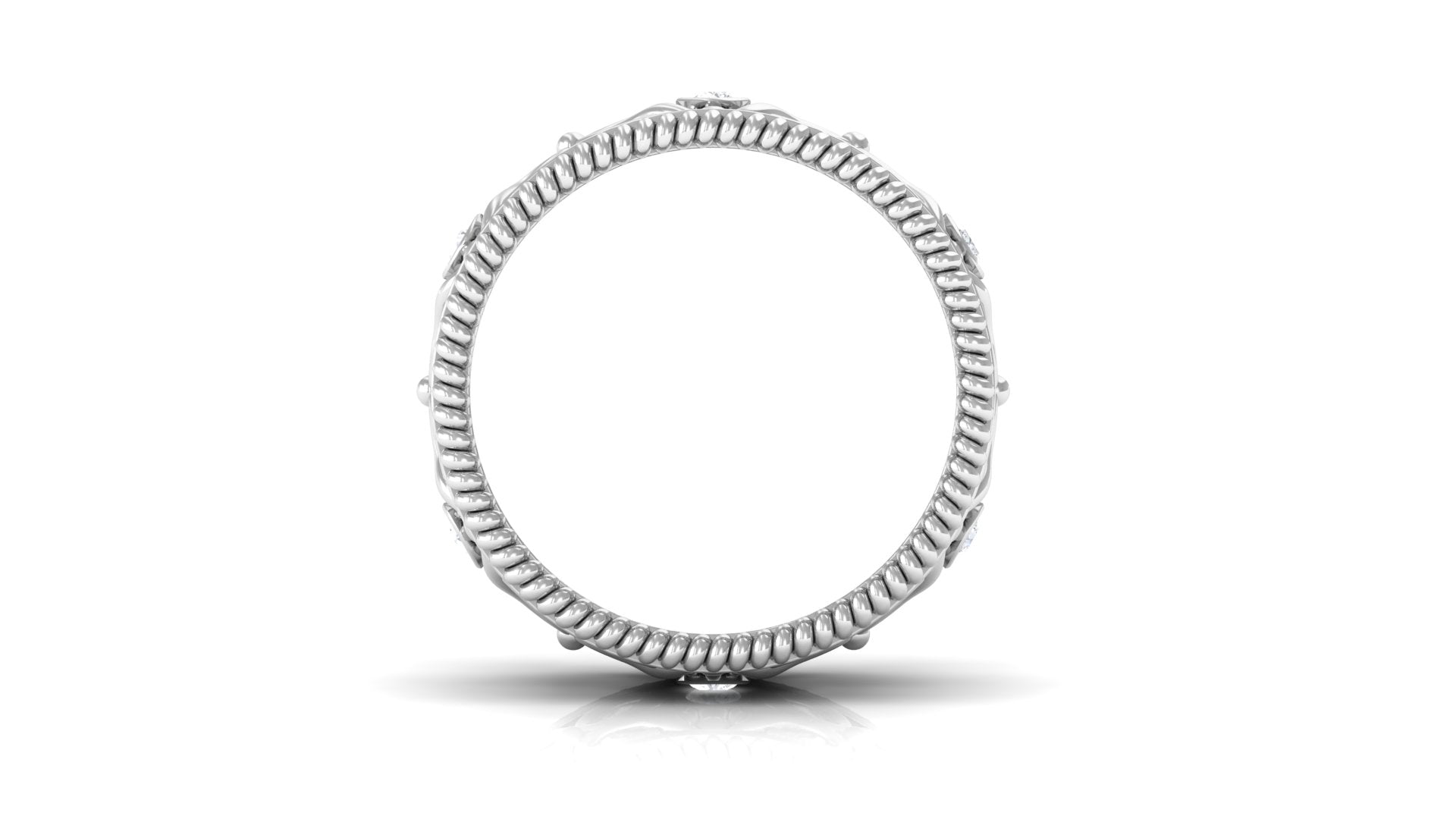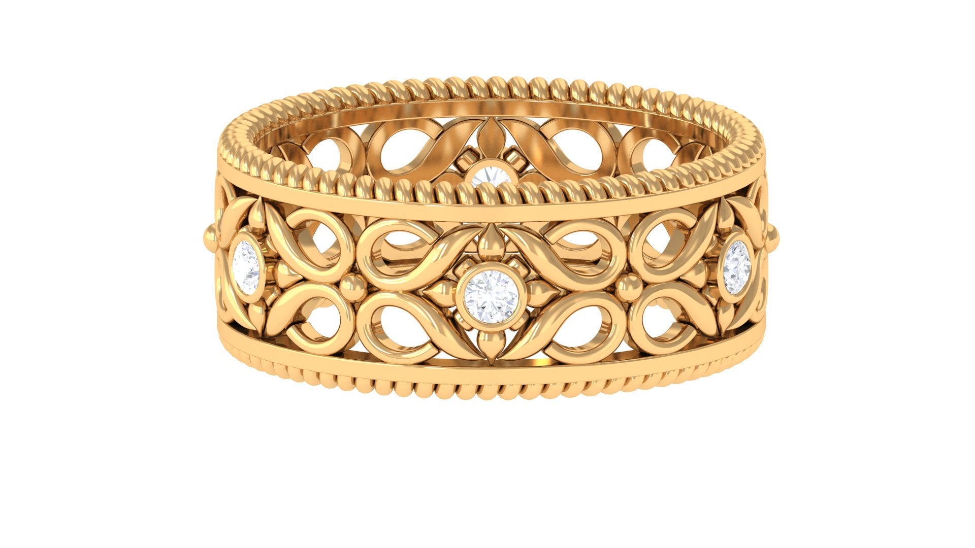 Command attention with our exquisite Filigree Band, adorned with shimmering Round Cut Diamonds in a secure Prong Setting. Whether worn as a statement piece or paired with other rings, this stunning band is sure to steal the spotlight and become a cherished addition to your jewelry collection.