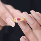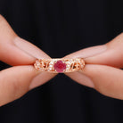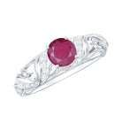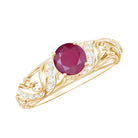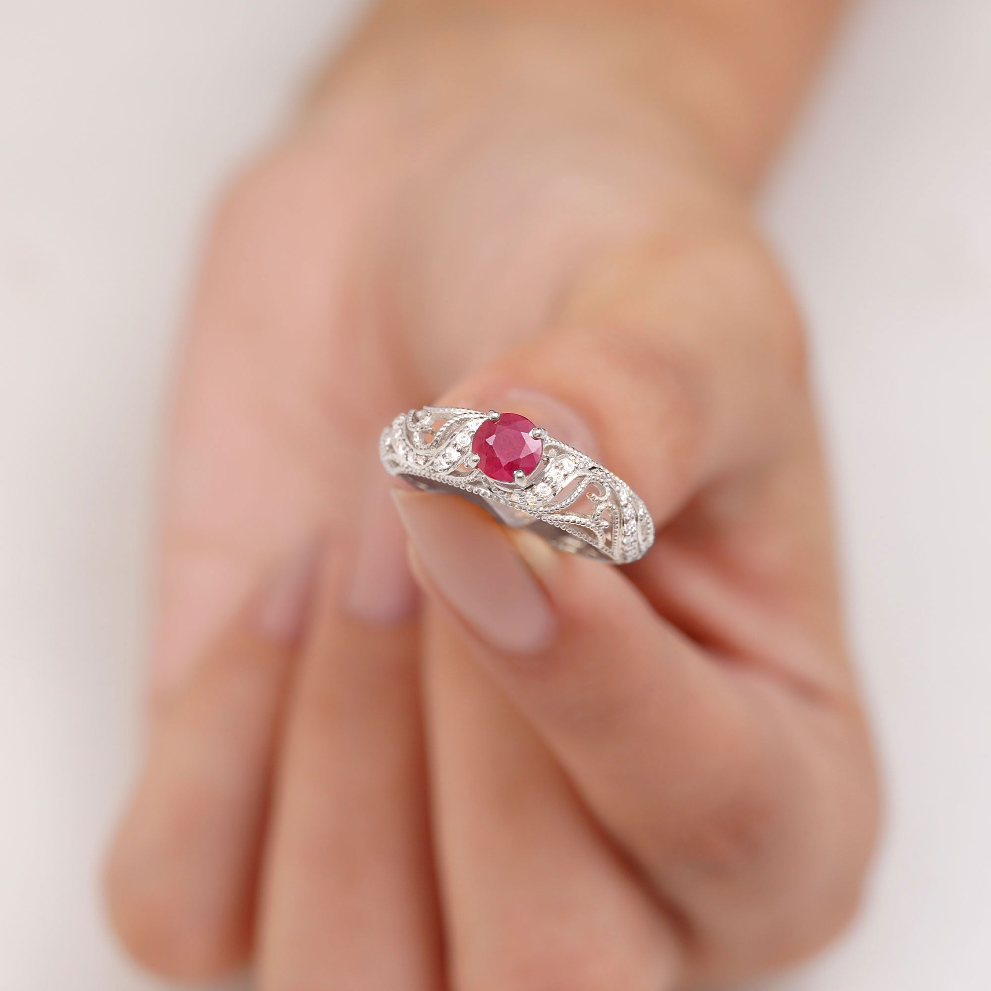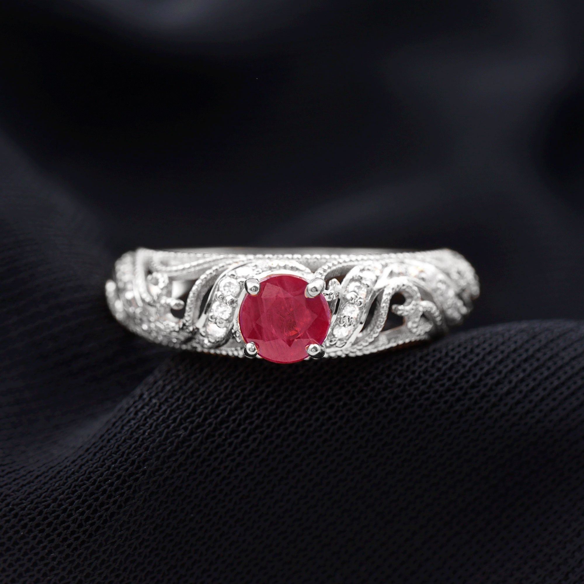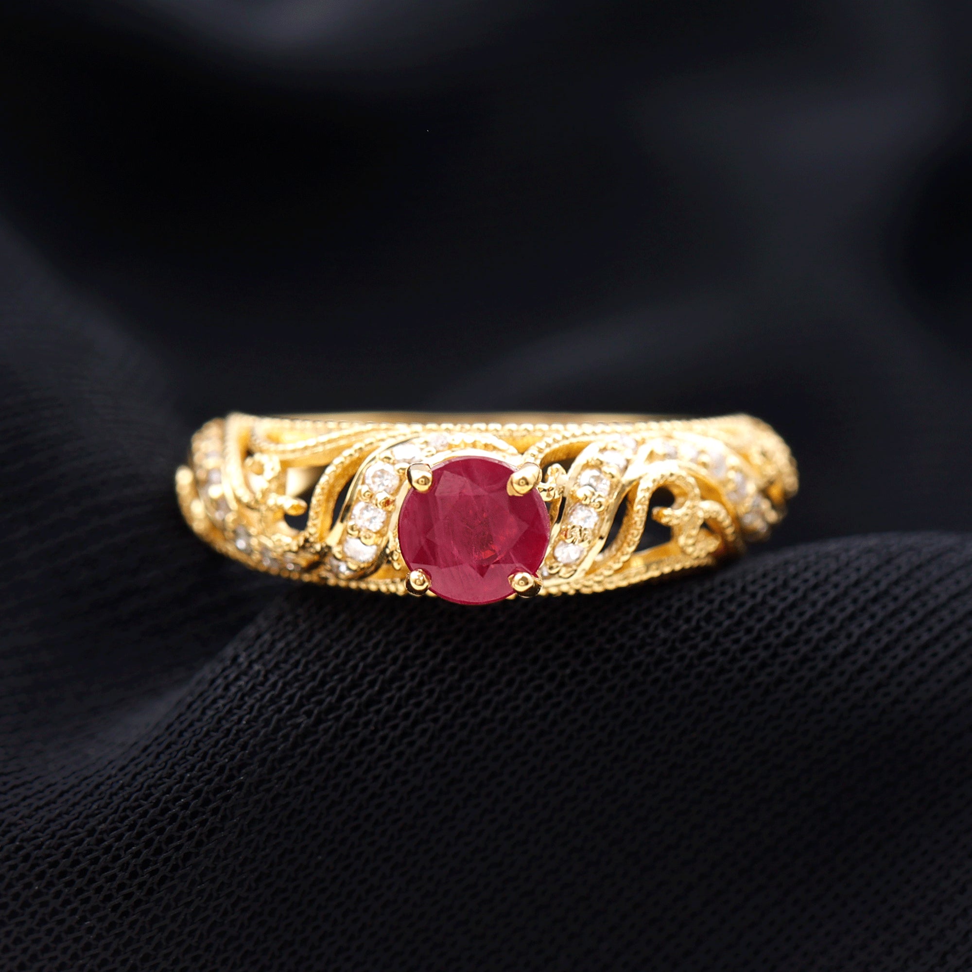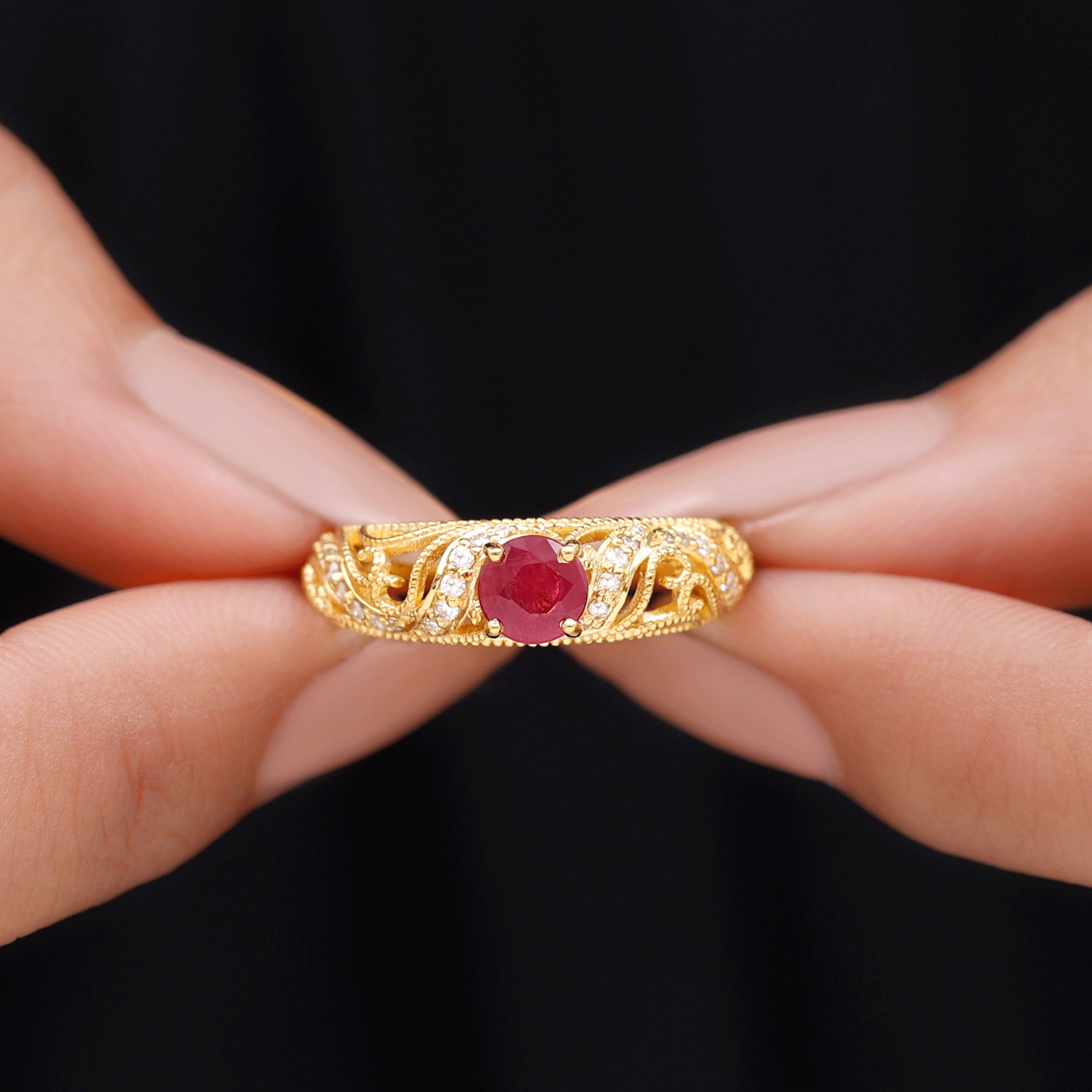 Turn heads with this vintage engagement ring, crafted for a luxurious appeal. The ring features a Round Shape ruby set in a prong setting, accented with Diamond stones and intricate beaded details. This unique and stunning ring is sure to capture attention and make a lasting impression.