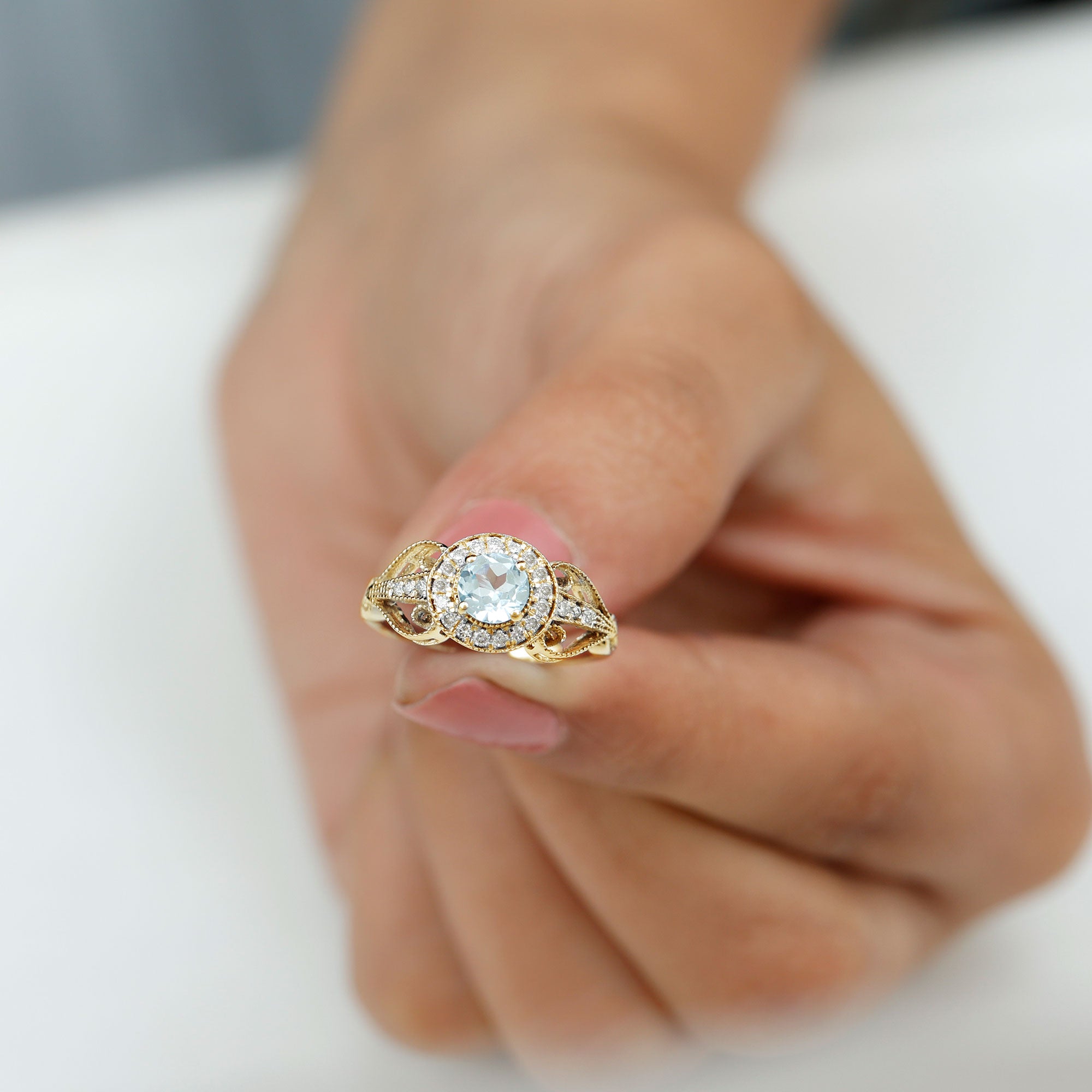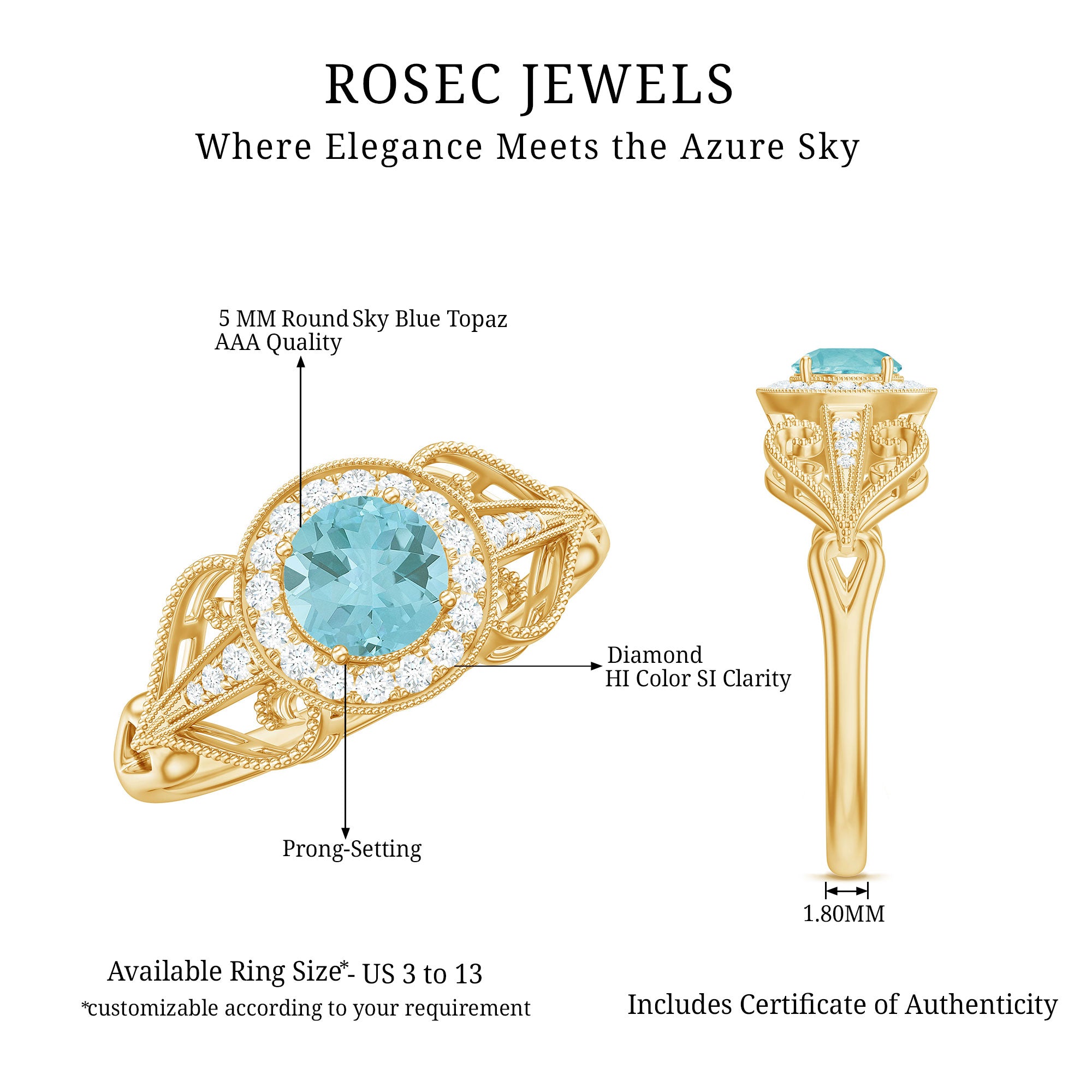 Capture the essence of timeless elegance with this phenomenal and classic Engagement Ring. A stunning Round Shape Sky Blue Topaz takes center stage, embraced by a dazzling halo of Round Shape Diamond that enhances the beauty of the shank. This beautiful Engagement Ring exudes grace and sophistication, making it the perfect symbol of your eternal love and commitment.