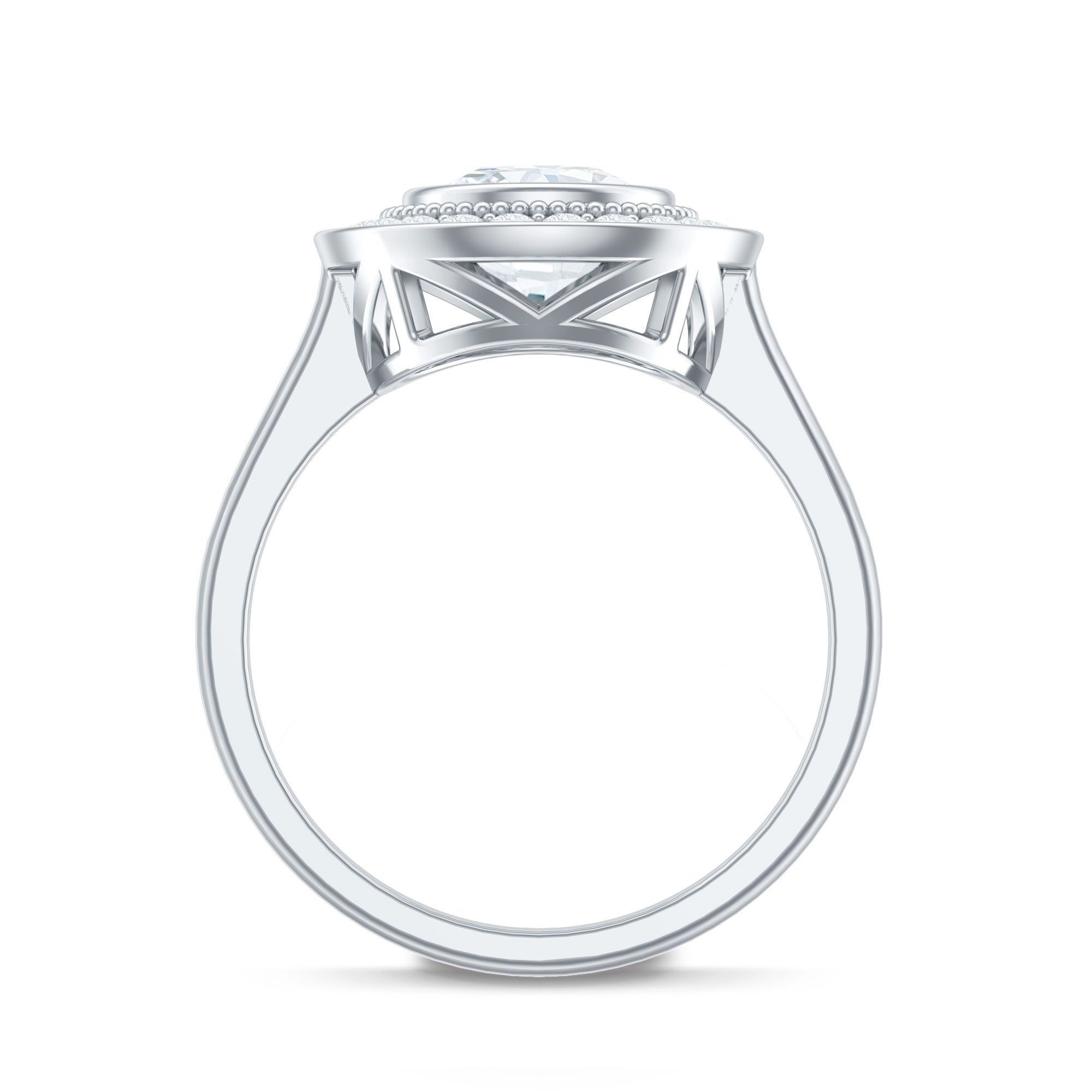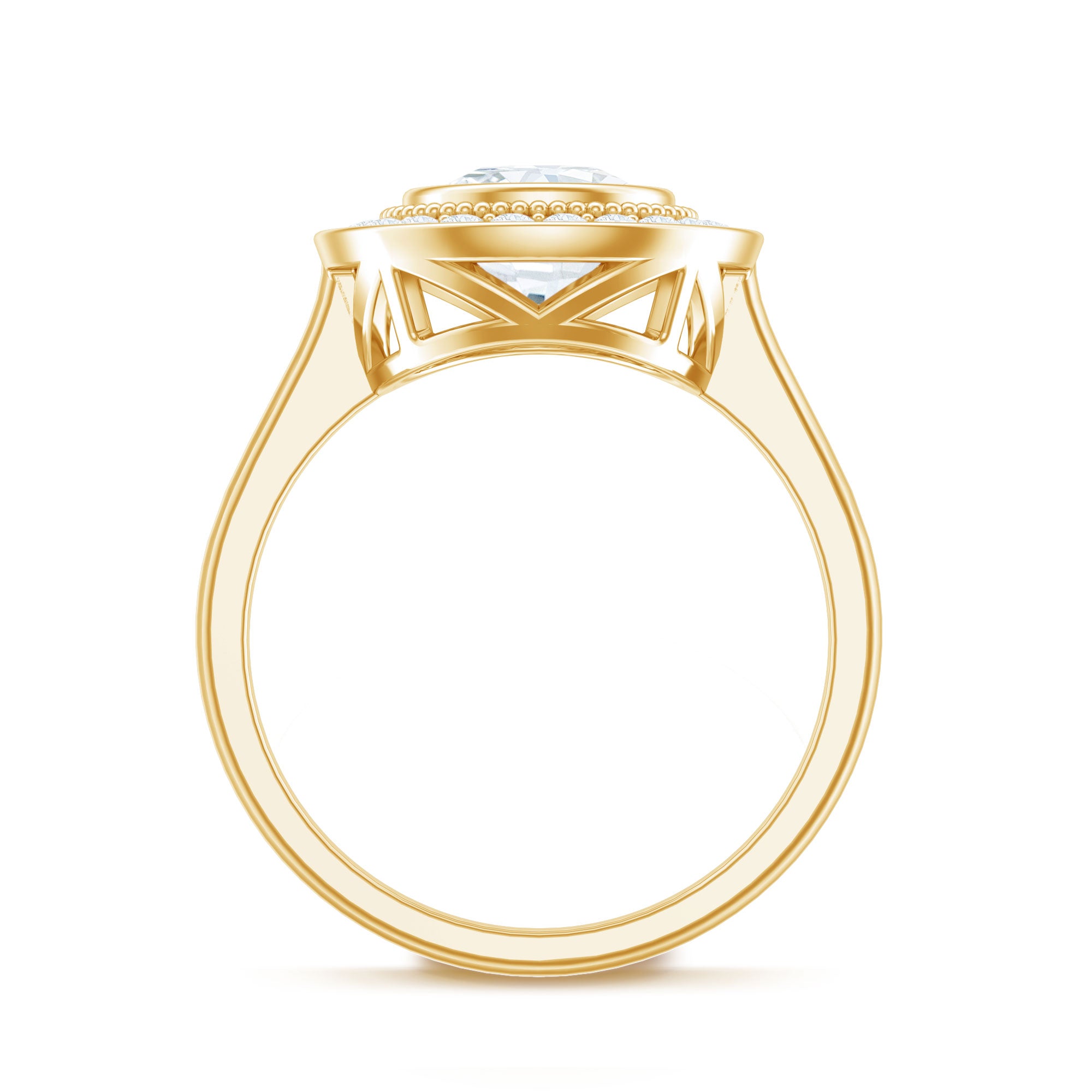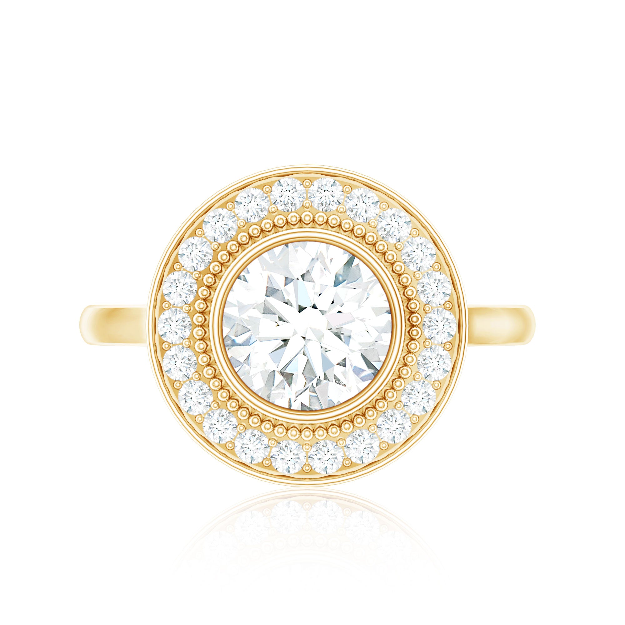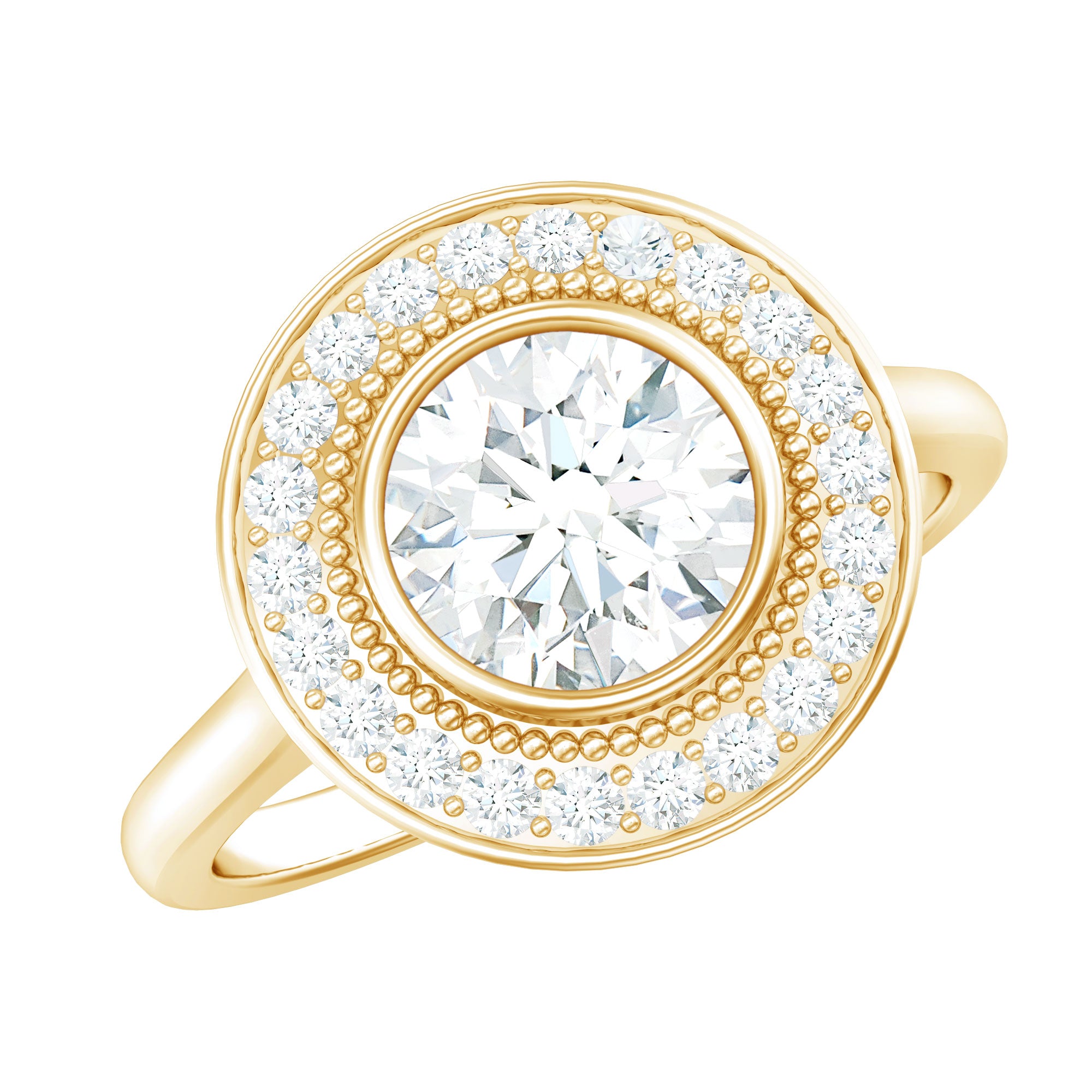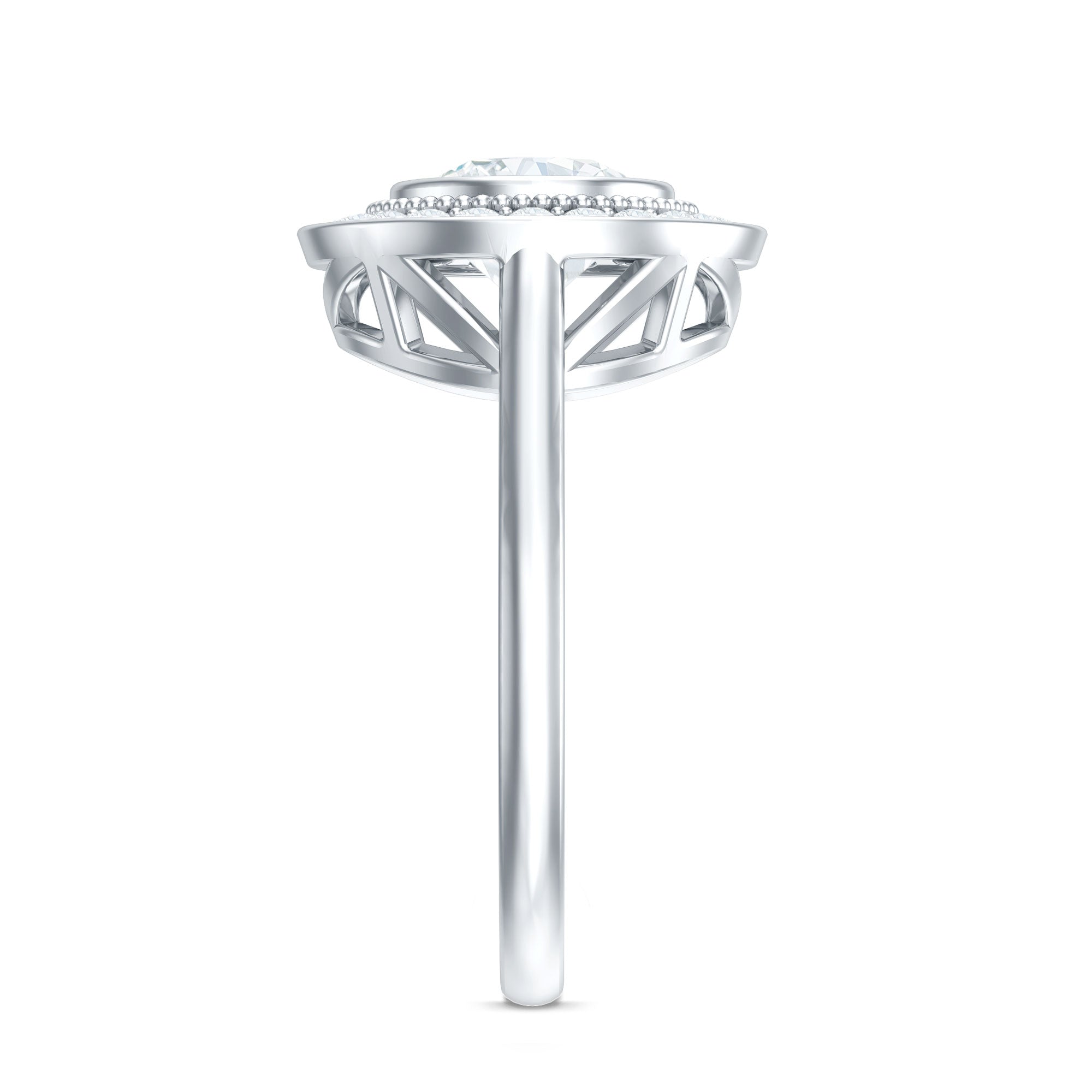 Celebrate your special moments with this elegant Round Moissanite Engagement Ring. Designed with a vintage touch, this beautiful Halo Engagement Ring features a 7 MM round cut moissanite stone as the center of attention. The center stone is set securely in bezel setting, giving it a smooth and classic look. Surrounding the center stone is a halo of small and sparkling round moissanite stones, along with delicate beaded detailing that adds extra charm and shine. The combination of the bezel setting and halo design creates a timeless and graceful style that will never go out of fashion. All the moissanite stones used in this Bezel Set Engagement Ring are of D color and VS1 clarity, offering brilliant sparkle and high quality shine. Each gemstone is certified and carefully checked for quality, so you can feel confident in your purchase. This Round Engagement Ring is perfect for an engagement, anniversary, or any special occasion where you want to make a lasting impression. It comes with a certificate of authenticity and is packaged in a beautiful jewelry box, ready to gift or keep safe when not worn. A classic piece designed to shine for a lifetime.