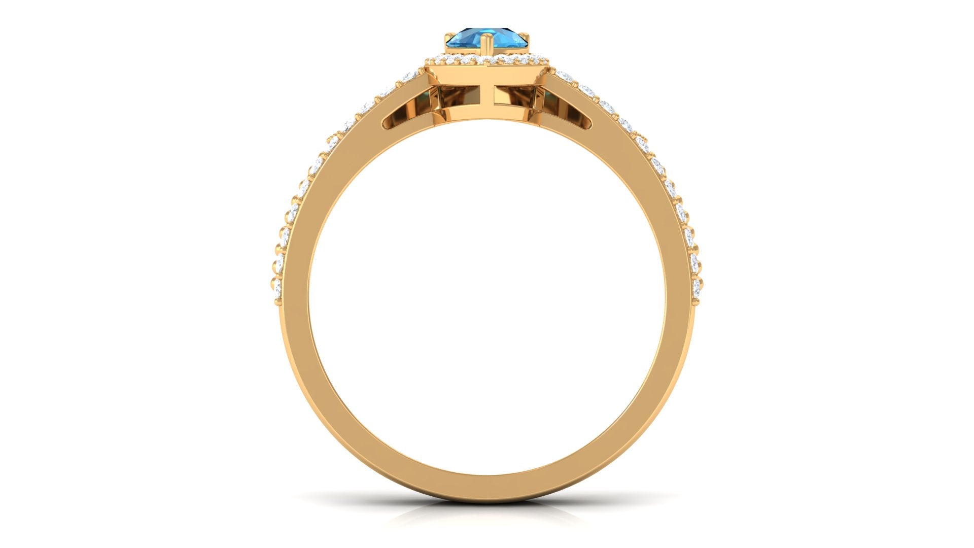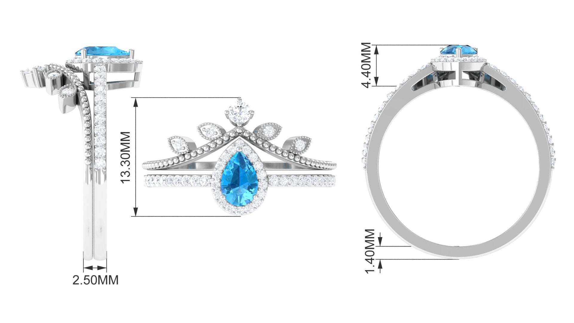 Leave her in awe with your impeccable choice of this exquisite ring set. The bridal set features a 5X7 mm pear-cut Swiss Blue Topaz, delicately held in a prong setting. The ring set is enhanced by a halo of round, gleaming Diamond stones that encircle the Swiss Blue Topaz, adding a captivating sparkle. The chevron band, adorned with more radiant Diamond stones, beautifully complements the centerpiece. Present her with this remarkable ring set and watch her marvel at its exquisite craftsmanship and timeless elegance.