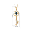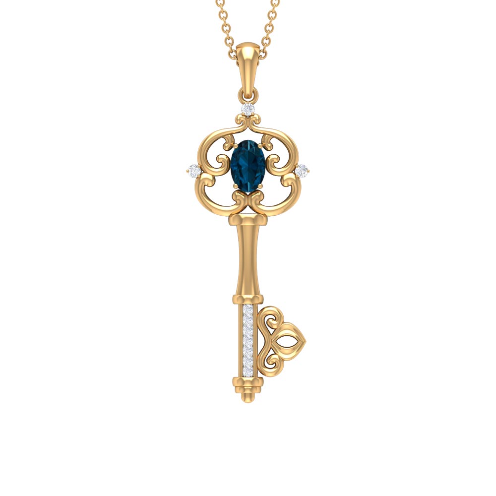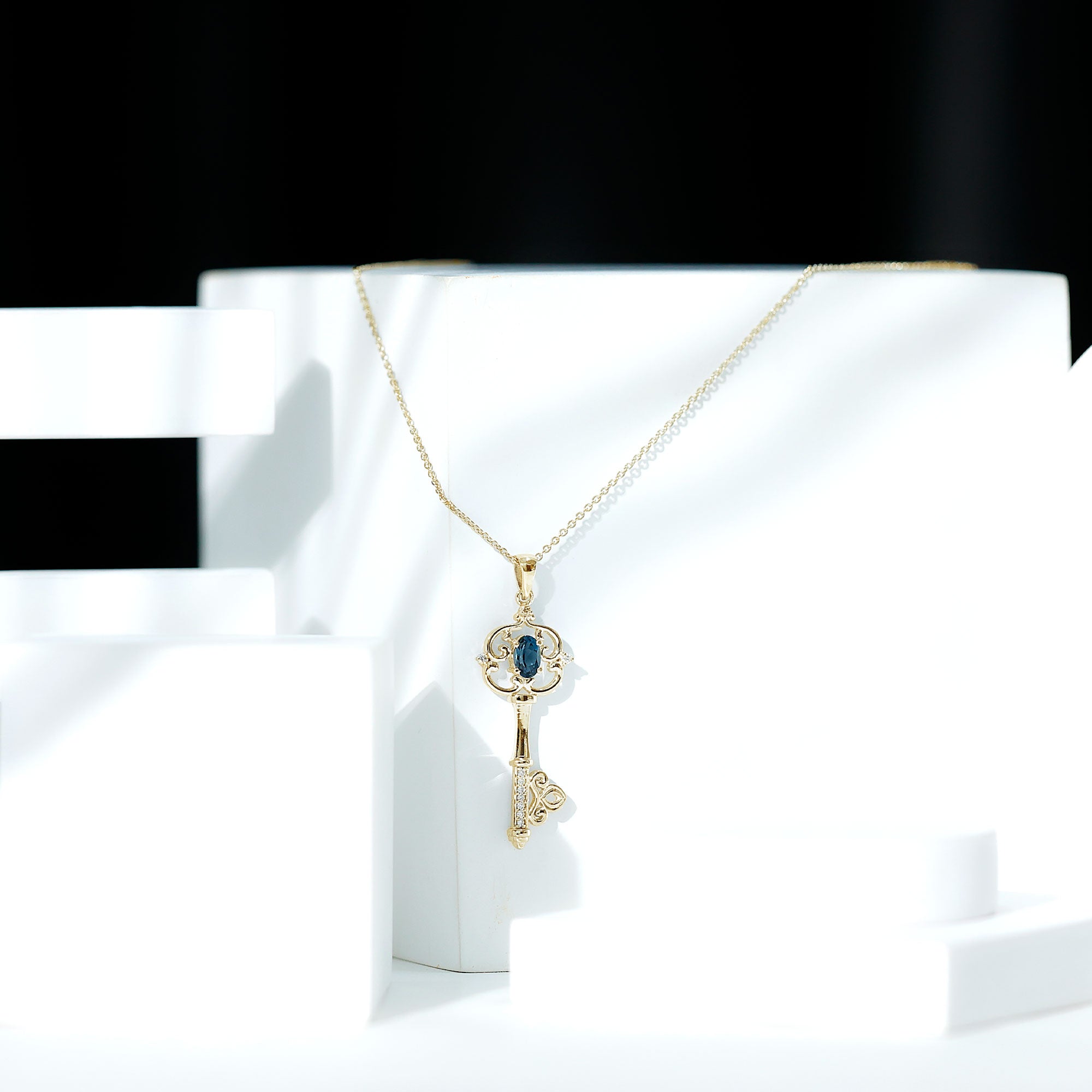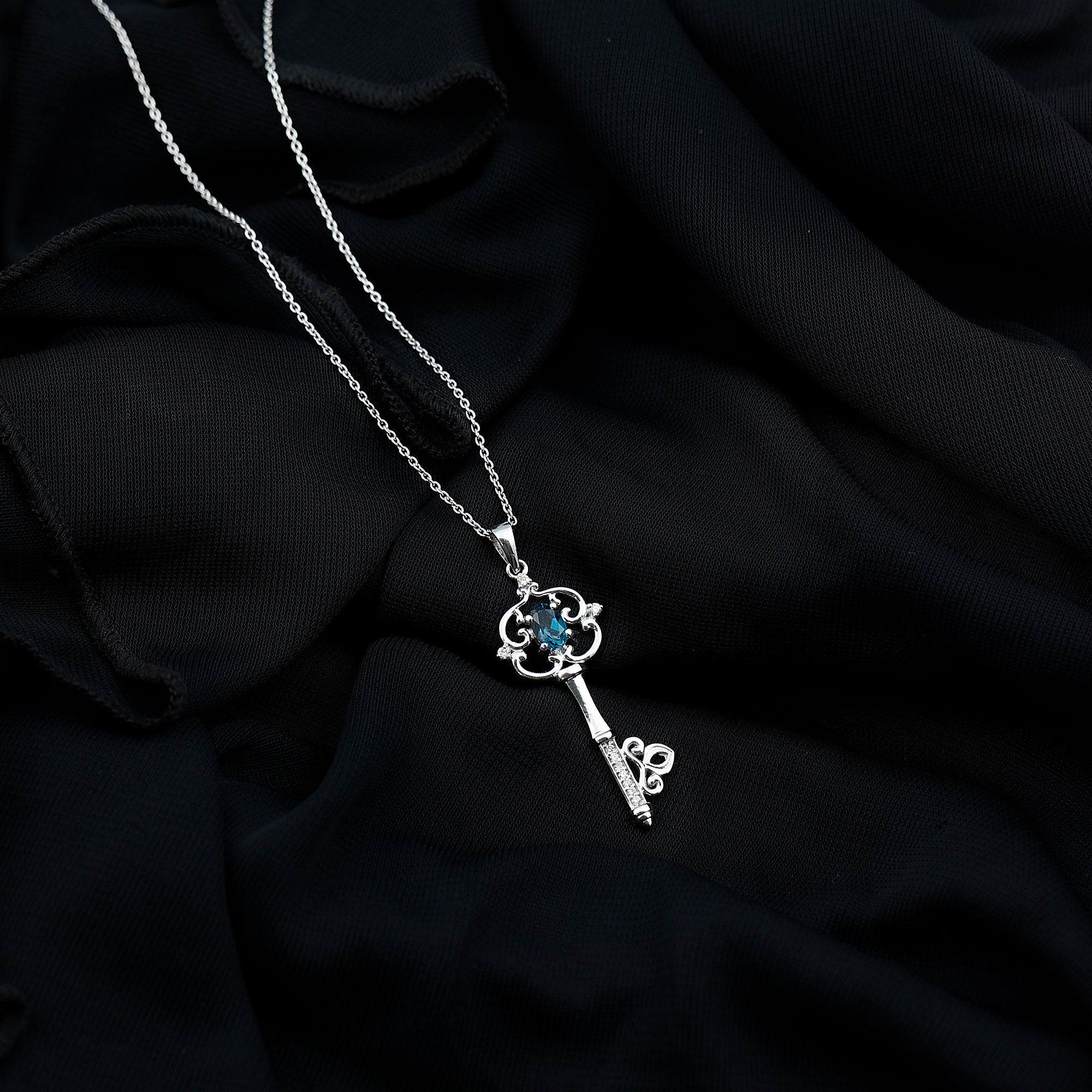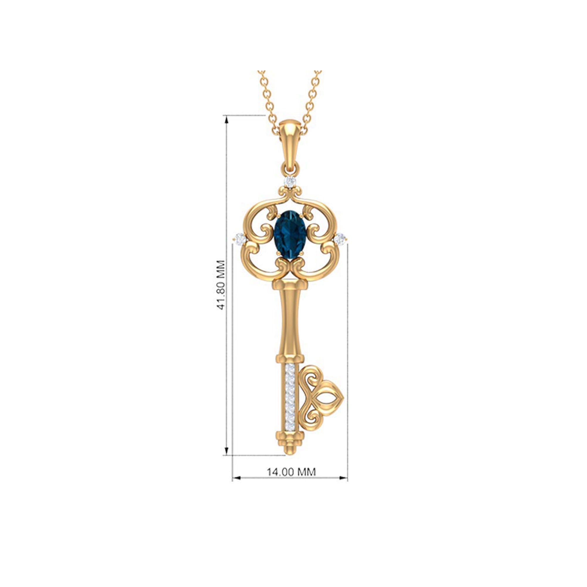 Every key unlocks something special, and maybe this one will unlock her heart for you. Dont wait, gift her this beautiful Key Charm Pendant when you express the feeling of love. Handcrafted with intricate details, the Classic Pendant features a beautifully sculpted key design, a 4X6 MM oval shaped London Blue Topaz sits gracefully in a prong setting framed by a vintage-inspired pattern and small shimmering stones. The sparkling round diamonds are set in a neat row at the bottom and an extra touch of sparkle to the overall design, making this Vintage Pendant Necklace even more catching.