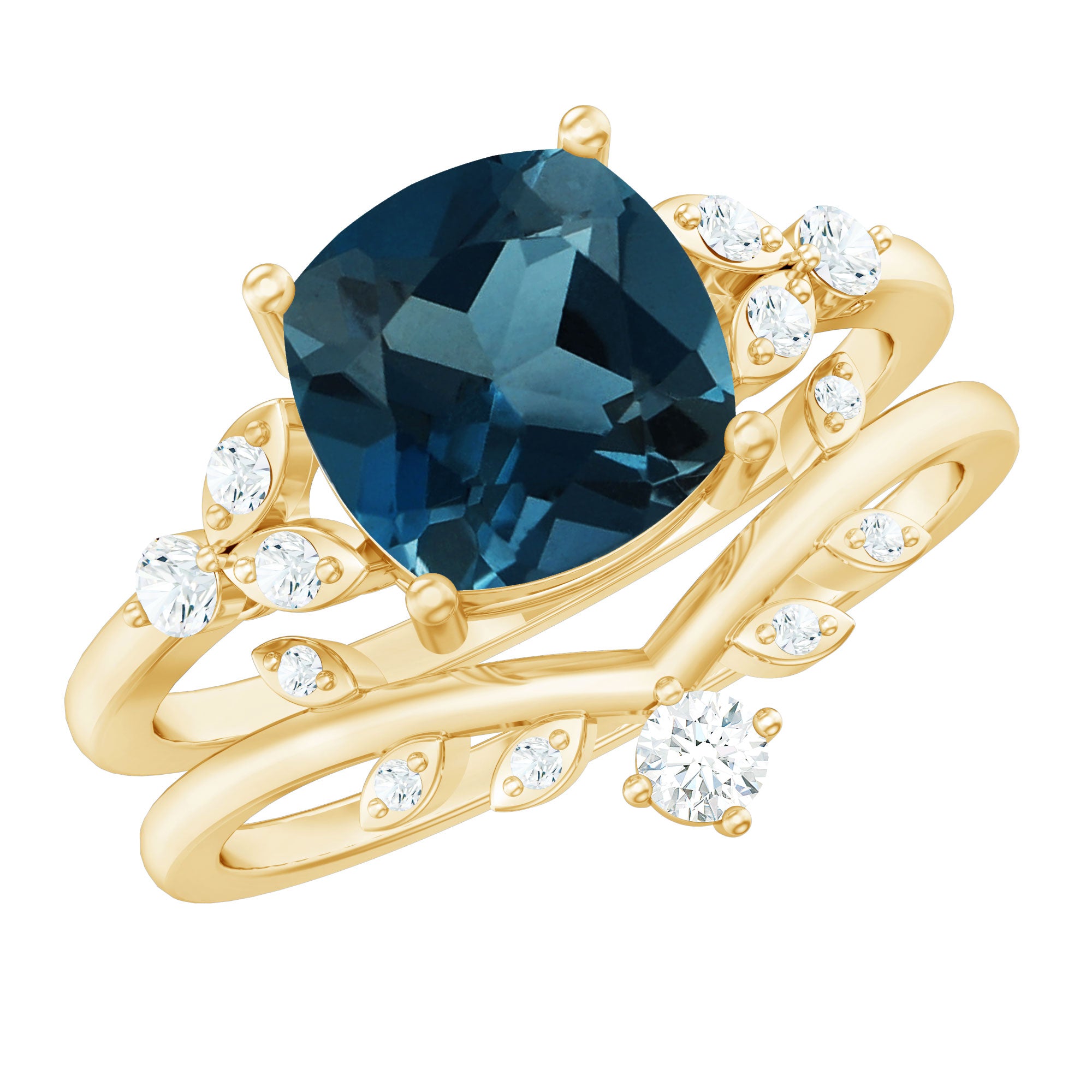 This London Blue Topaz Ring Set is crafted to enhance beauty, brilliance, and elegance during one of the most significant moments in your life. The set comprises an engagement ring and a complementary curved band, designed to fit together flawlessly. At the center of the engagement ring is a breathtaking 8 MM Cushion cut London Blue Topaz, securely held in a prong setting. Encircling the central stone is a floral-inspired arrangement of round Diamond stones on both sides, which adds a delicate touch to the striking center. The accompanying curved ring is both simple and sophisticated. It showcases a series of round diamond stones that gently curve to align with the engagement ring. Whether worn together or individually, both rings present a polished and timeless look. This Blue Topaz Wedding Ring Set is ideal for a bride seeking a classic design with an added touch of sparkle. Whether you are making a proposal or celebrating a special occasion, this Cushion Cut Engagement Ring with Wedding Band encapsulates the moment with grace and thoughtfulness.