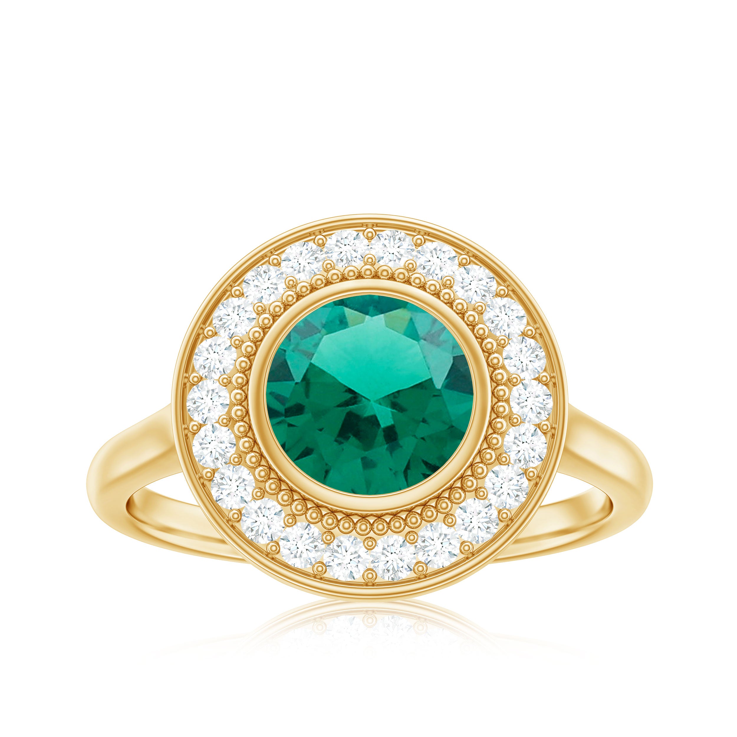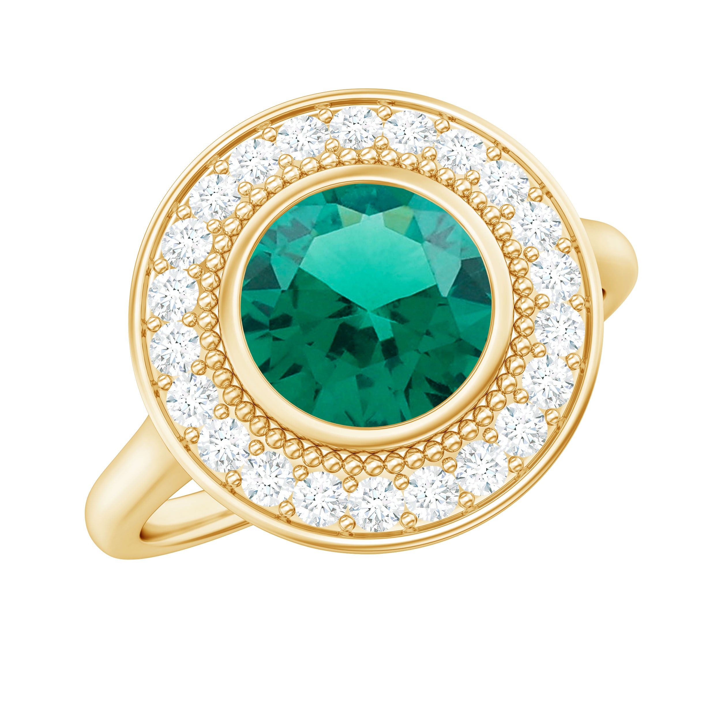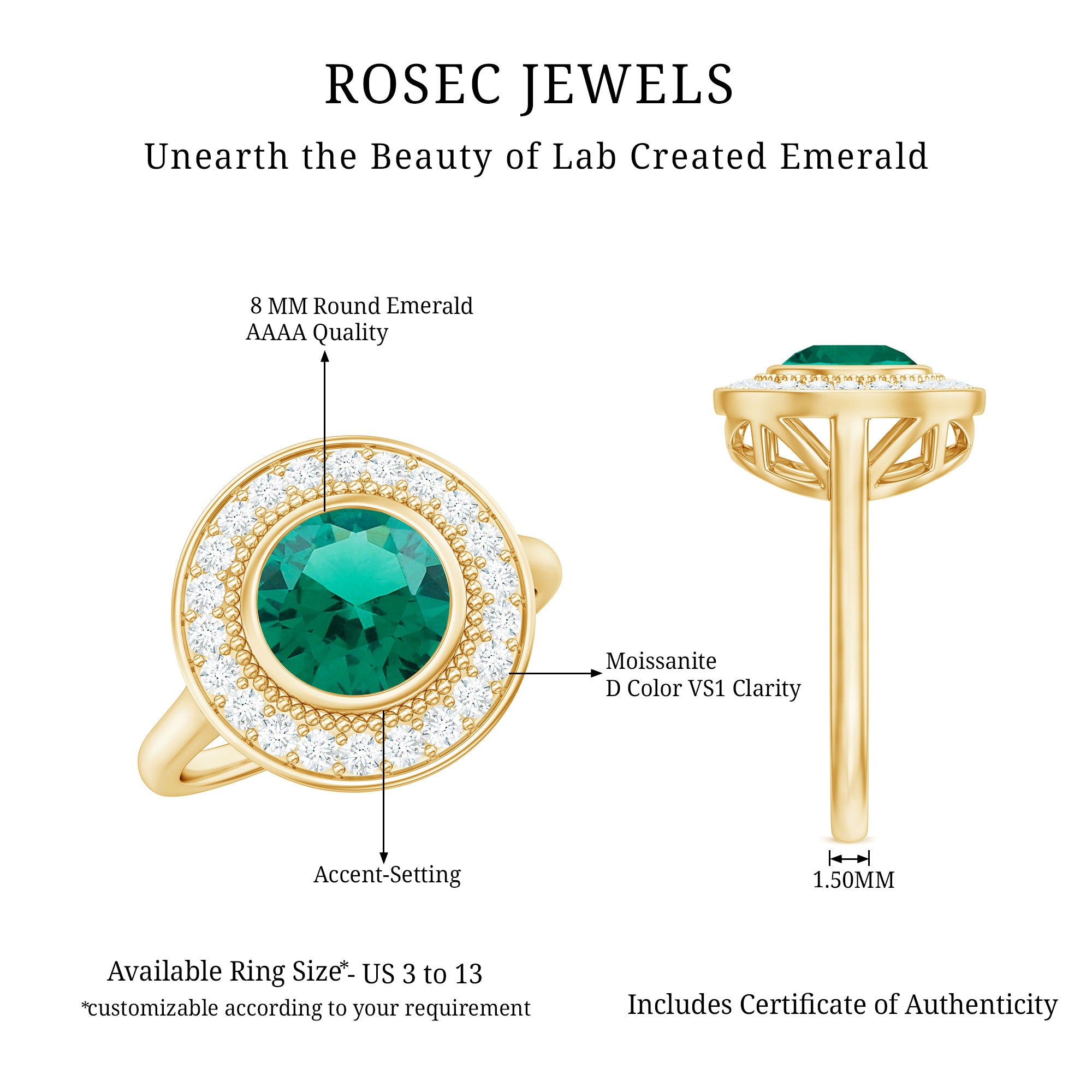 Step back in time with a touch of modern brilliance in this Vintage Inspired Engagement Ring. At the heart of the design, a vibrant 8 mm Lab Created Emerald set in Bezel Setting radiates deep green hues, symbolizing growth and renewal. Surrounding it is a stunning Halo of sparkling Moissanite stones that add dazzling light and shimmer, perfectly complementing the beauty of the Lab Emerald. The intricate Beaded Detailing around the center stone gives this Lab Grown Emerald Ring a delicate texture and a handcrafted feel, evoking the charm of antique jewelry with a fresh and contemporary twist. Available in various ring sizes, this Halo Engagement Ring with Emerald is designed to fit comfortably and beautifully, making it a meaningful choice for your special moment. Presented in a gorgeous jewelry box, this Lab Emerald Moissanite Ring is ready to become a cherished symbol of your love and commitment. Whether you are looking for an engagement ring or a statement piece full of history and sparkle, this Vintage Emerald Engagement Ring balances classic elegance with ethical luxury. Celebrate your story with a ring that feels timeless yet unique.