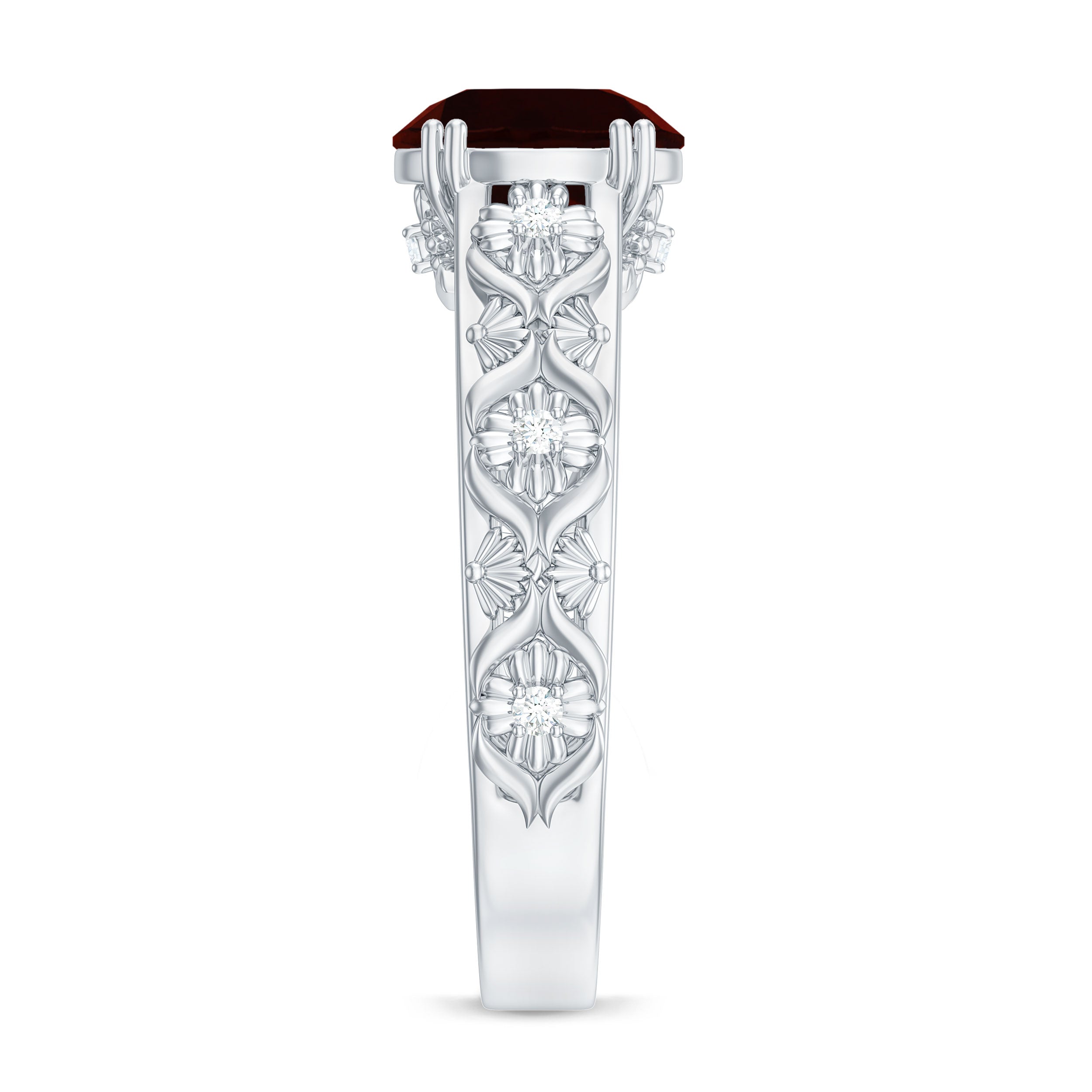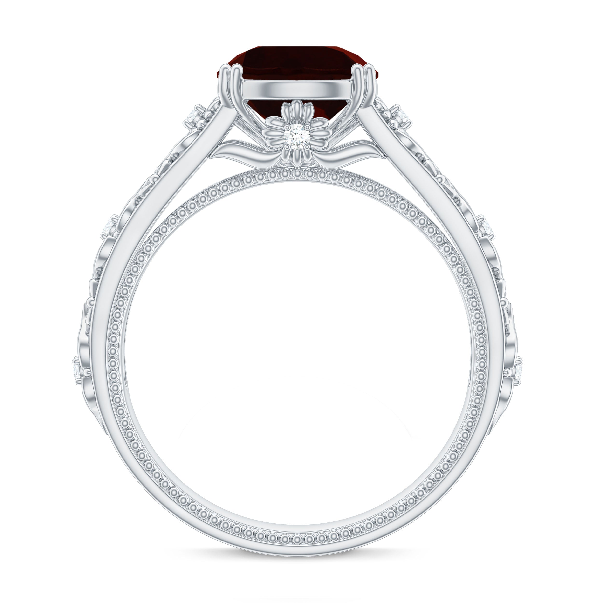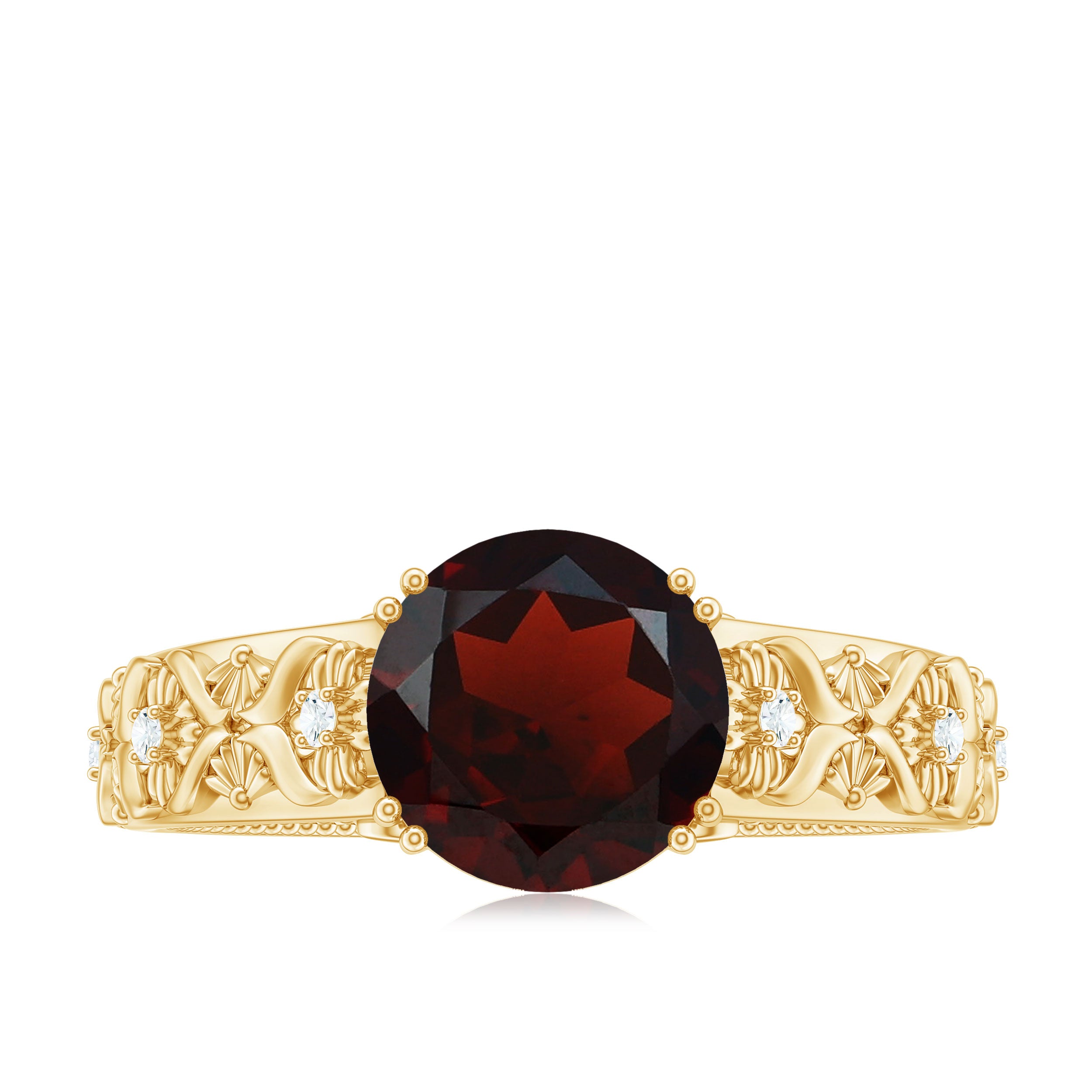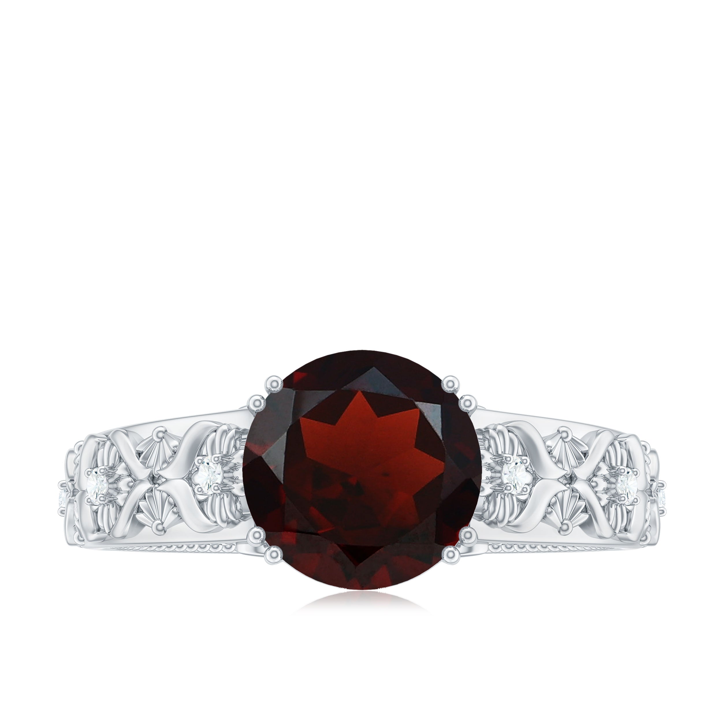 Capture attention with the enchanting beauty of this Vintage Looking Engagement Ring, a reminiscent of your timeless love story. At its center is an 8 mm Round Shape Garnet set in Double Prong Setting, rich in color and full of warmth, symbolizing passion, devotion and the promise of forever. The band is thoughtfully designed with nature inspired detailing, adding a graceful touch that makes this Garnet Diamond Ring feel truly one-of-a-kind. Dainty Diamond stones sparkle along the band, offering a soft shimmer that enhances the deep red glow of AAA Quality Garnet without overpowering its natural charm. Elegant yet full of shine, this Garnet Engagement Ring is perfect for someone who loves romance, history and the beauty of meaningful design. Presented in a signature jewelry box and available in various ring sizes, this Red Garnet Ring is a heartfelt expression of eternal love. Whether for an engagement, anniversary or a symbolic gesture of commitment, this vintage inspired treasure captures the essence of a bond meant to last a lifetime.