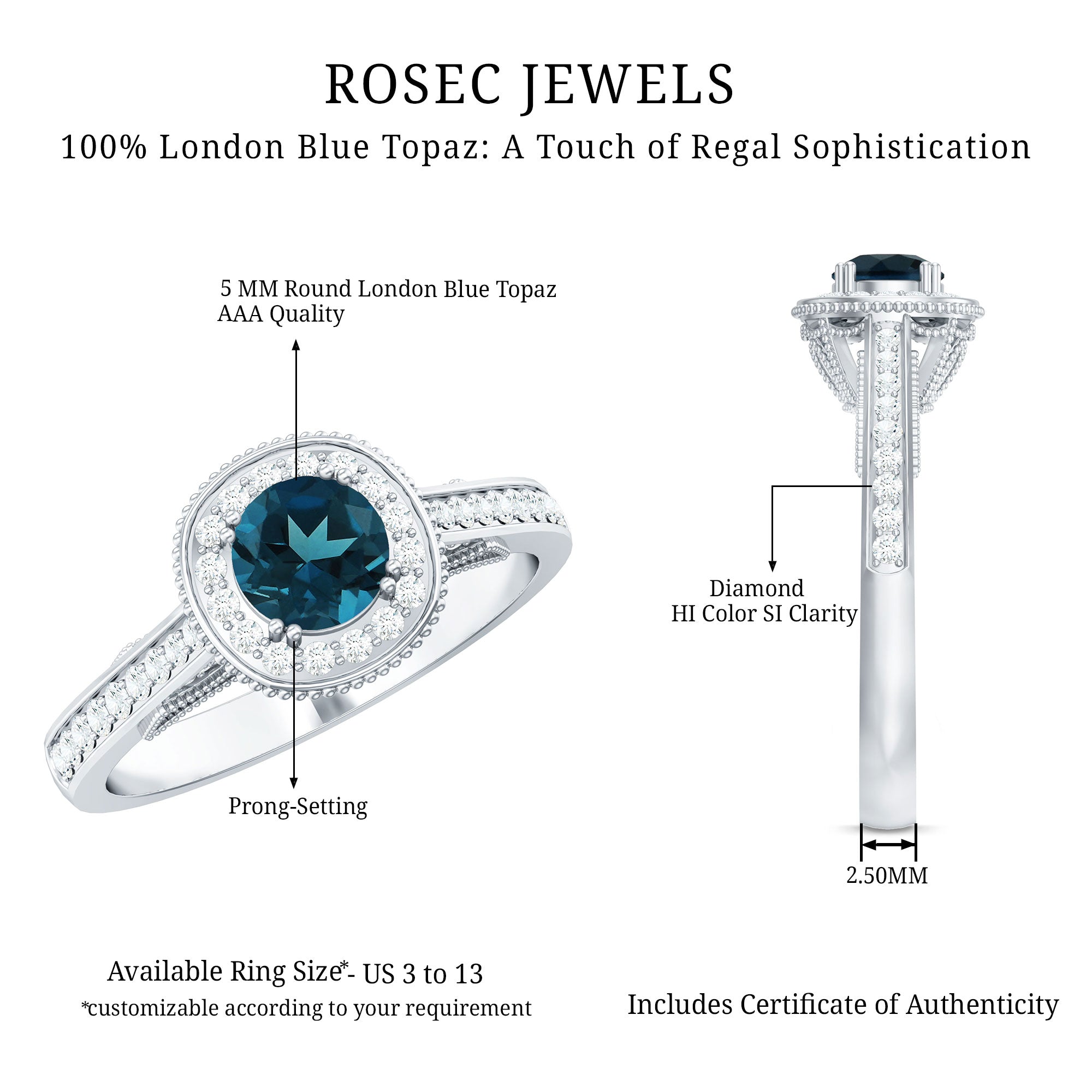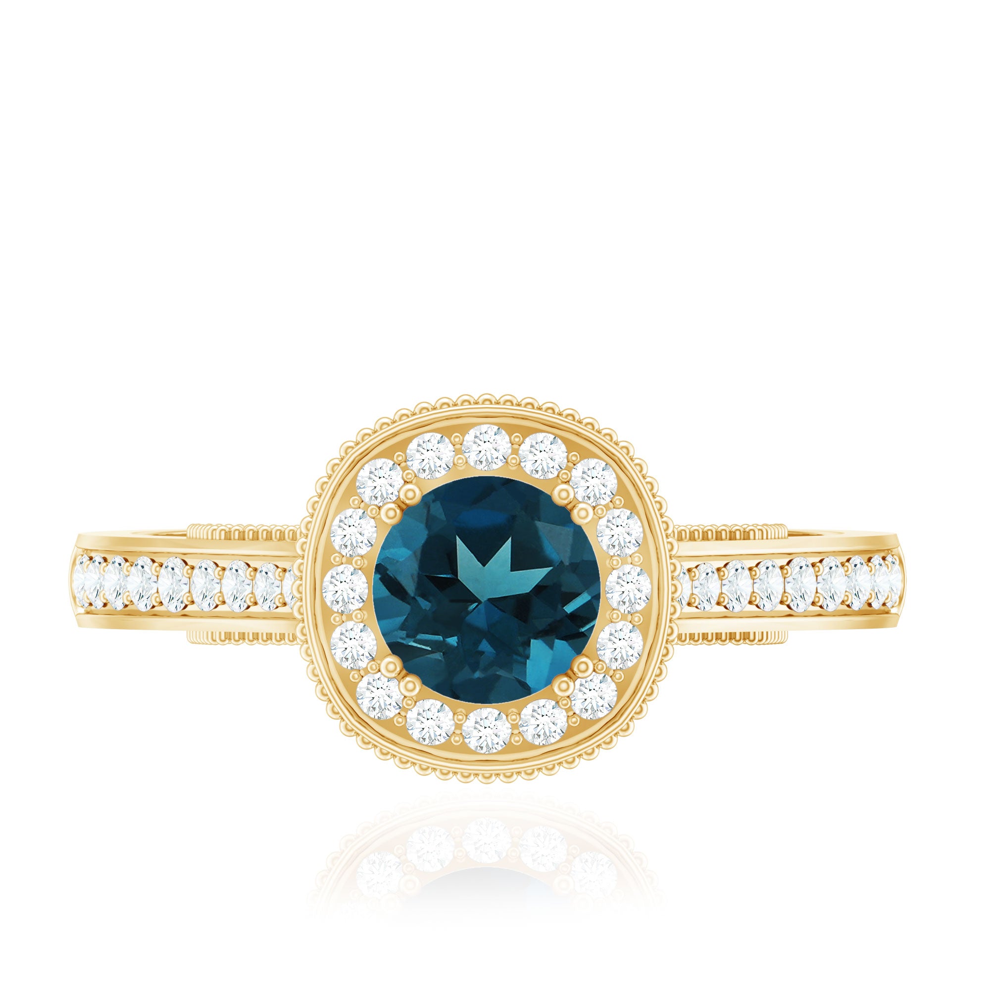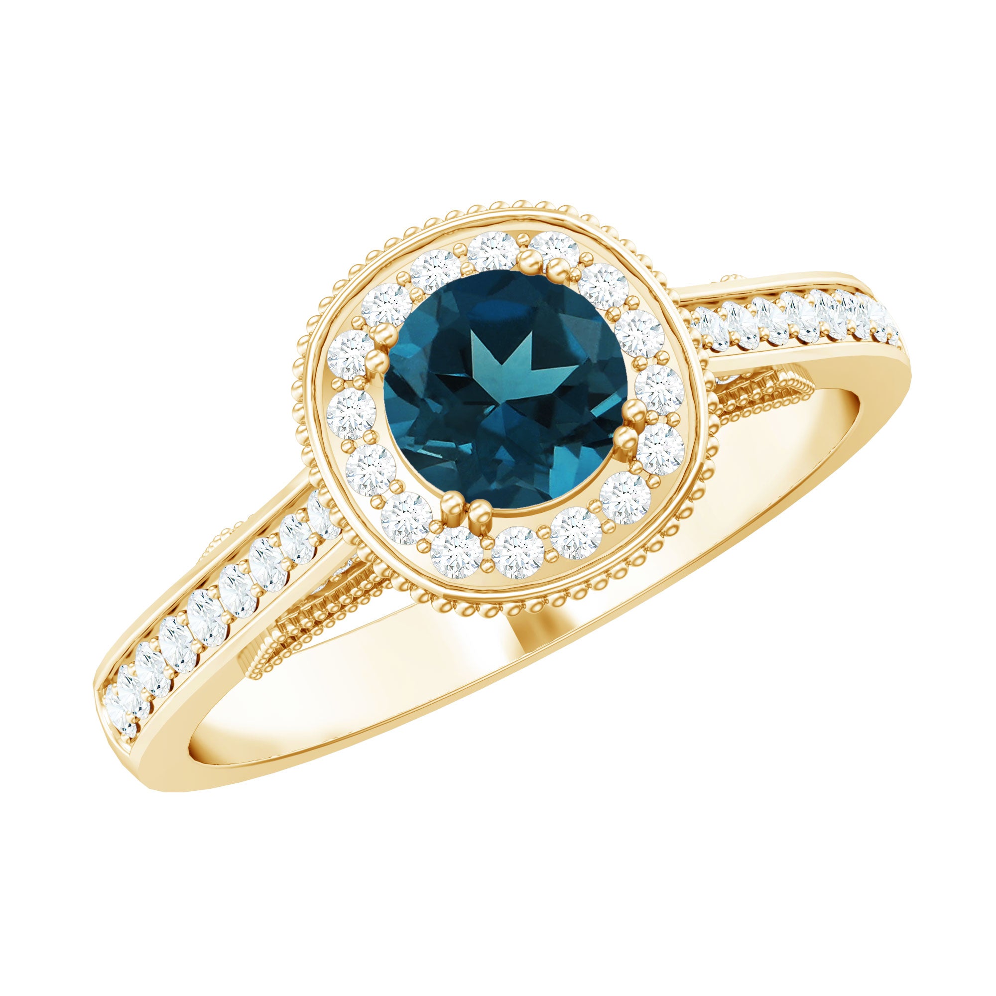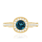 Bring home a piece that has the essence of the past with this charming Vintage London Blue Topaz Ring, thoughtfully crafted to reflect classic beauty with a romantic feel. It is embellished with a 5 MM round cut London Blue Topaz, held securely in prong setting. A sparkling diamond halo surrounds the center stone, adding gentle brilliance and enhancing the overall look. The band features delicate beadwork and small side diamonds, inspired by antique designs from the Art Deco era. These fine details give the London Blue Topaz Engagement Ring a vintage charm that is perfect for someone who loves unique and thoughtful jewelry with a story. This Blue Topaz and Diamond Ring is not just beautiful, it is also meaningful. The gemstone is believed to symbolize loyalty and deep emotional connection, making it a lovely choice for engagements or other special milestones. Available in a range of metal colors, purities, and ring sizes, you can personalize this Antique Looking Engagement Ring to suit your style or make it even more special for a loved one. Whether worn every day or saved for special occasions, this Halo Engagement Ring will always feel special. Arriving in an elegant jewelry box, it is ready to be gifted or cherished.
