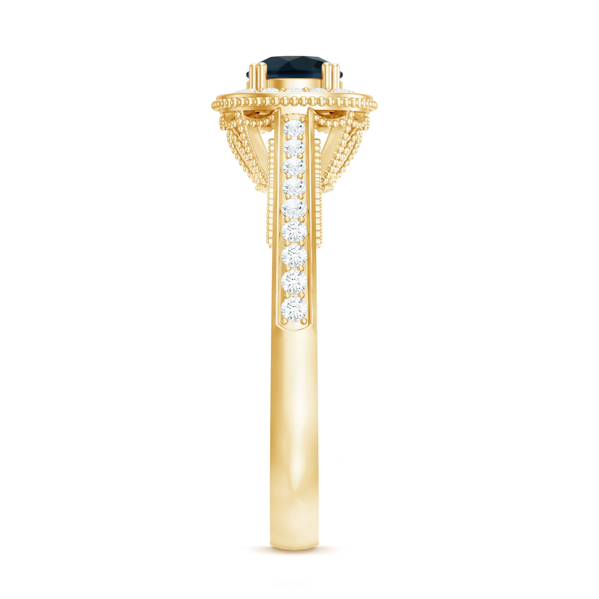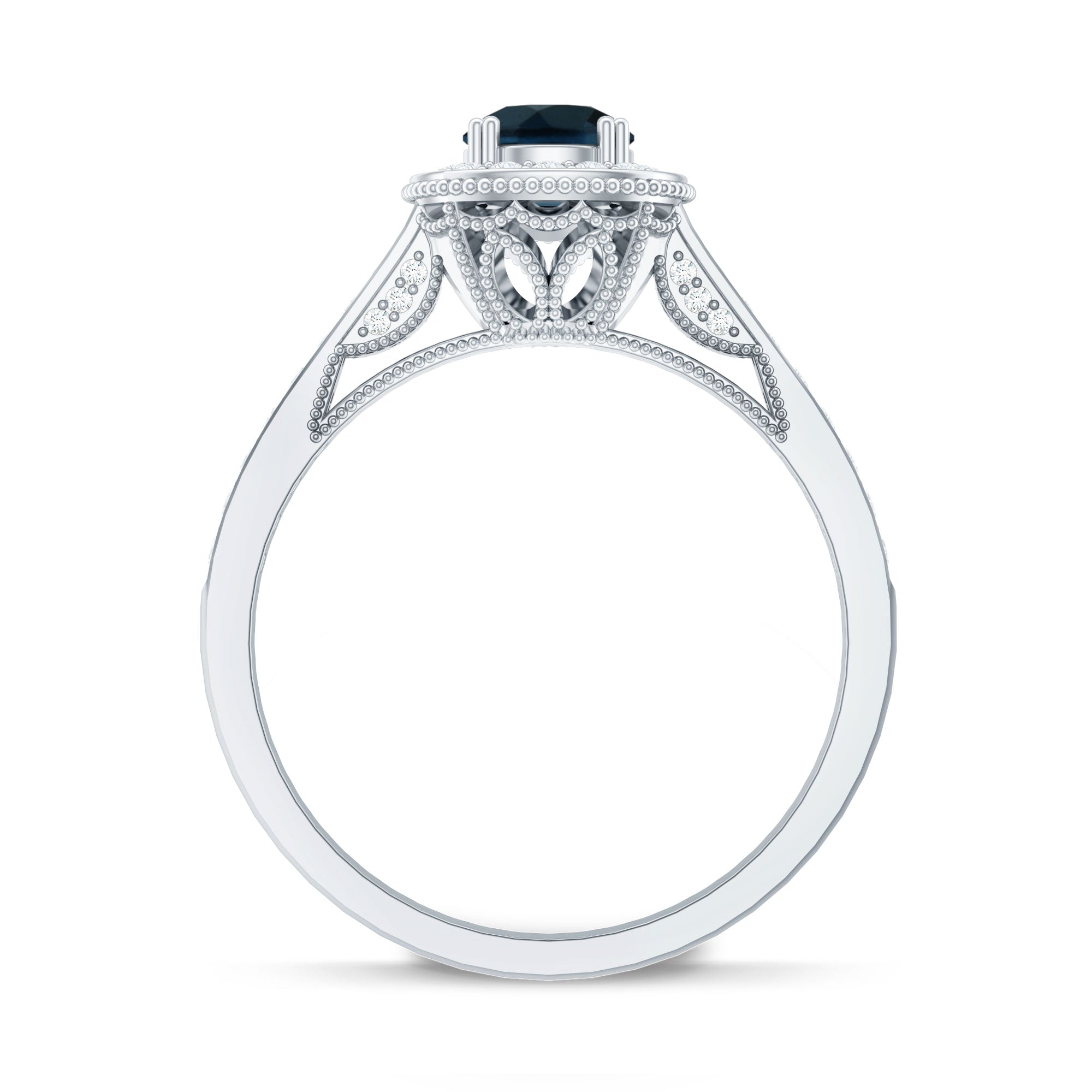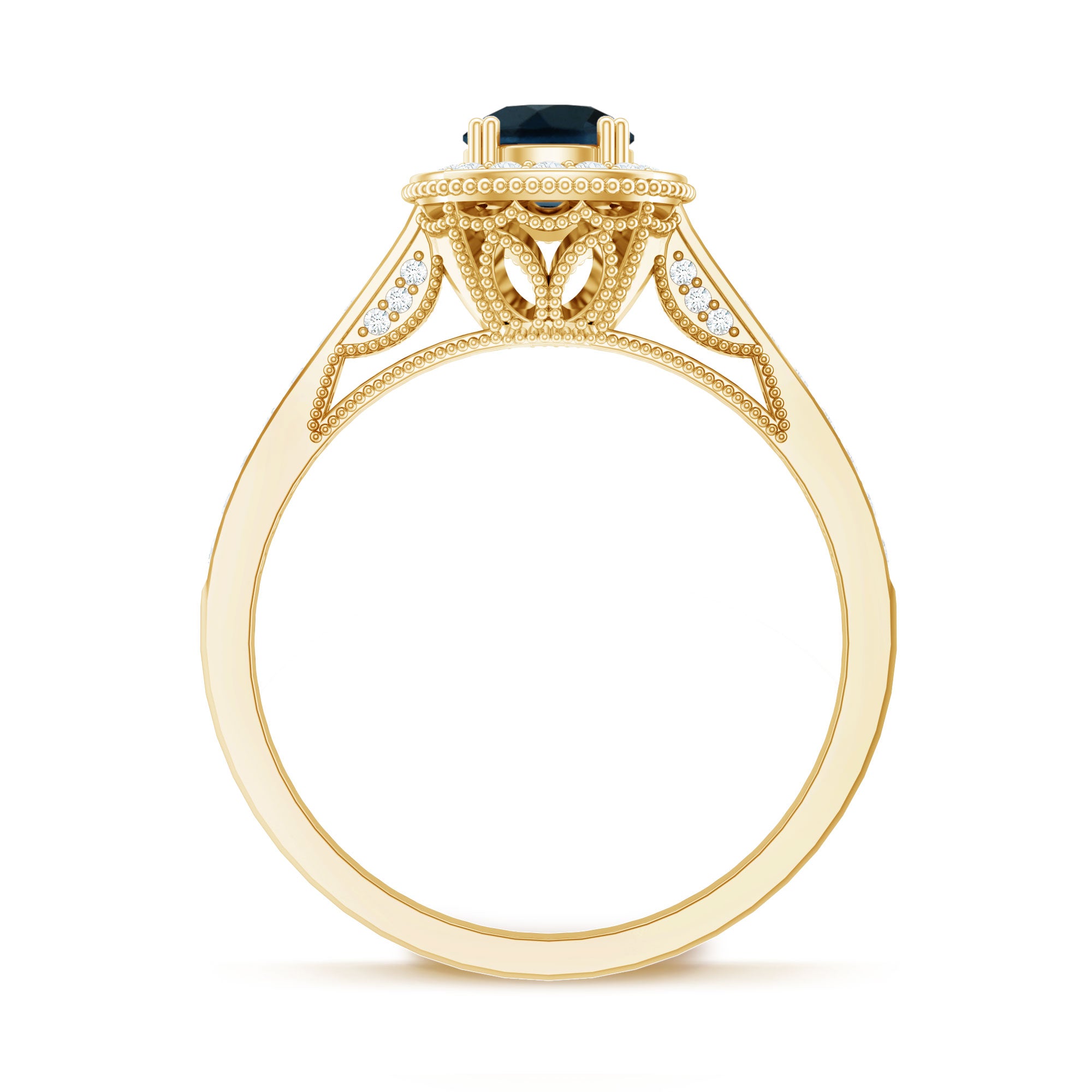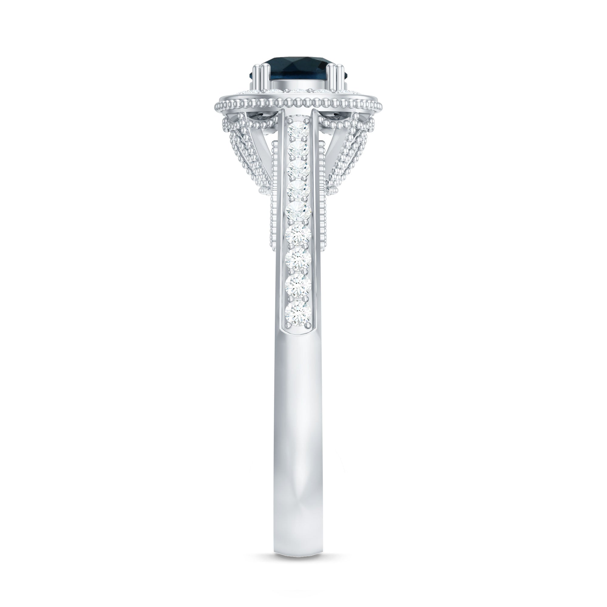 Bring home a piece that has the essence of the past with this charming Vintage London Blue Topaz Ring, thoughtfully crafted to reflect classic beauty with a romantic feel. It is embellished with a 5 MM round cut London Blue Topaz, held securely in prong setting. A sparkling diamond halo surrounds the center stone, adding gentle brilliance and enhancing the overall look. The band features delicate beadwork and small side diamonds, inspired by antique designs from the Art Deco era. These fine details give the London Blue Topaz Engagement Ring a vintage charm that is perfect for someone who loves unique and thoughtful jewelry with a story. This Blue Topaz and Diamond Ring is not just beautiful, it is also meaningful. The gemstone is believed to symbolize loyalty and deep emotional connection, making it a lovely choice for engagements or other special milestones. Available in a range of metal colors, purities, and ring sizes, you can personalize this Antique Looking Engagement Ring to suit your style or make it even more special for a loved one. Whether worn every day or saved for special occasions, this Halo Engagement Ring will always feel special. Arriving in an elegant jewelry box, it is ready to be gifted or cherished.