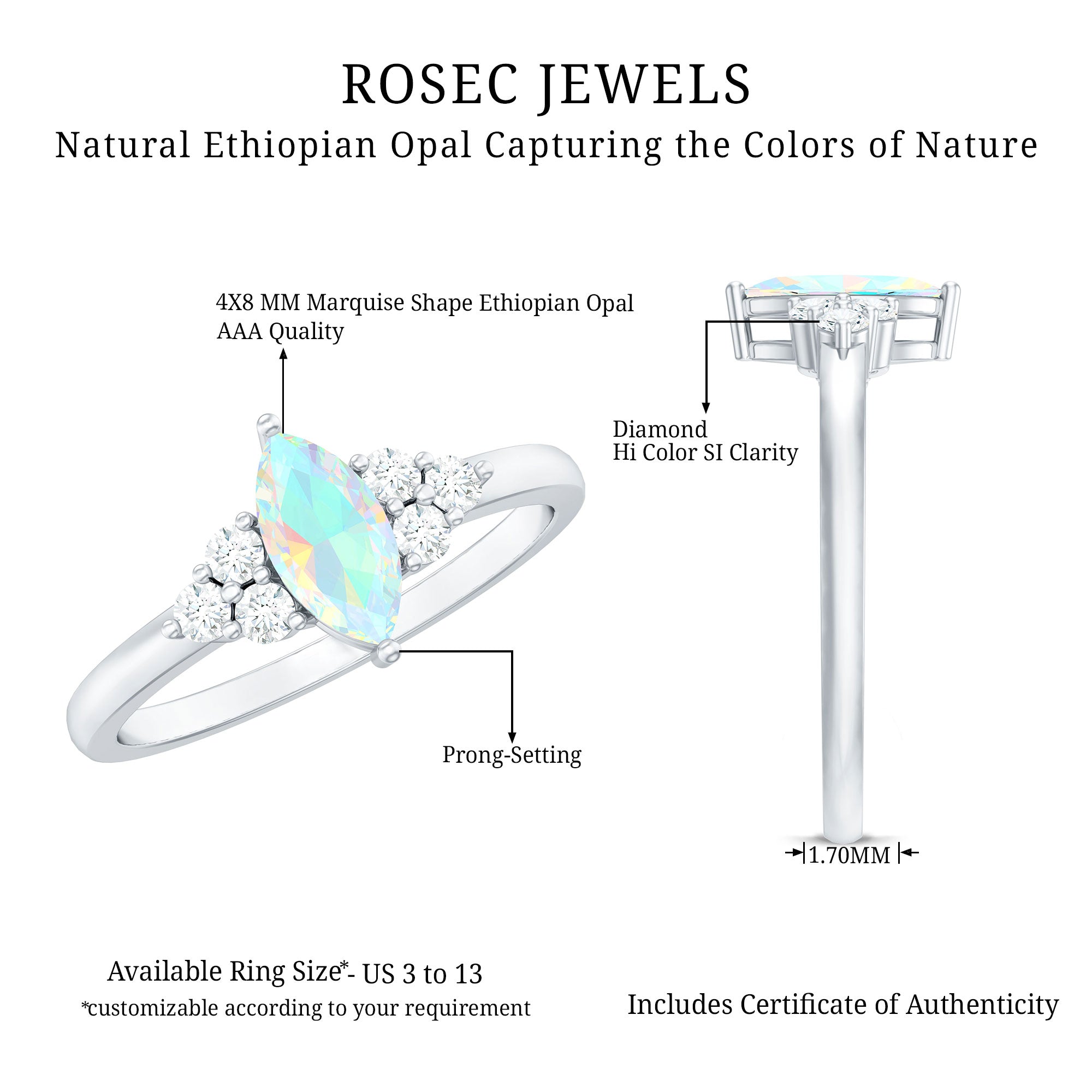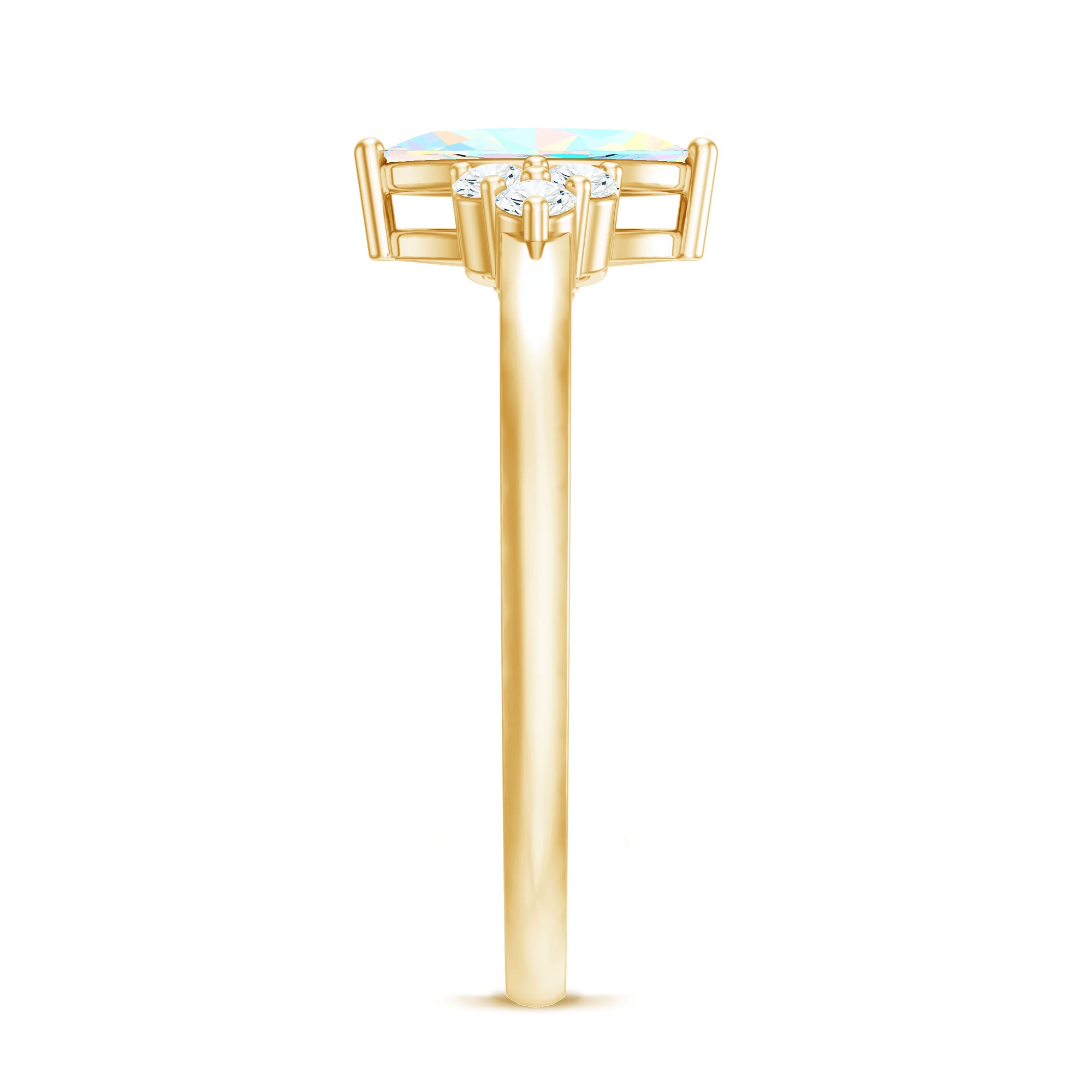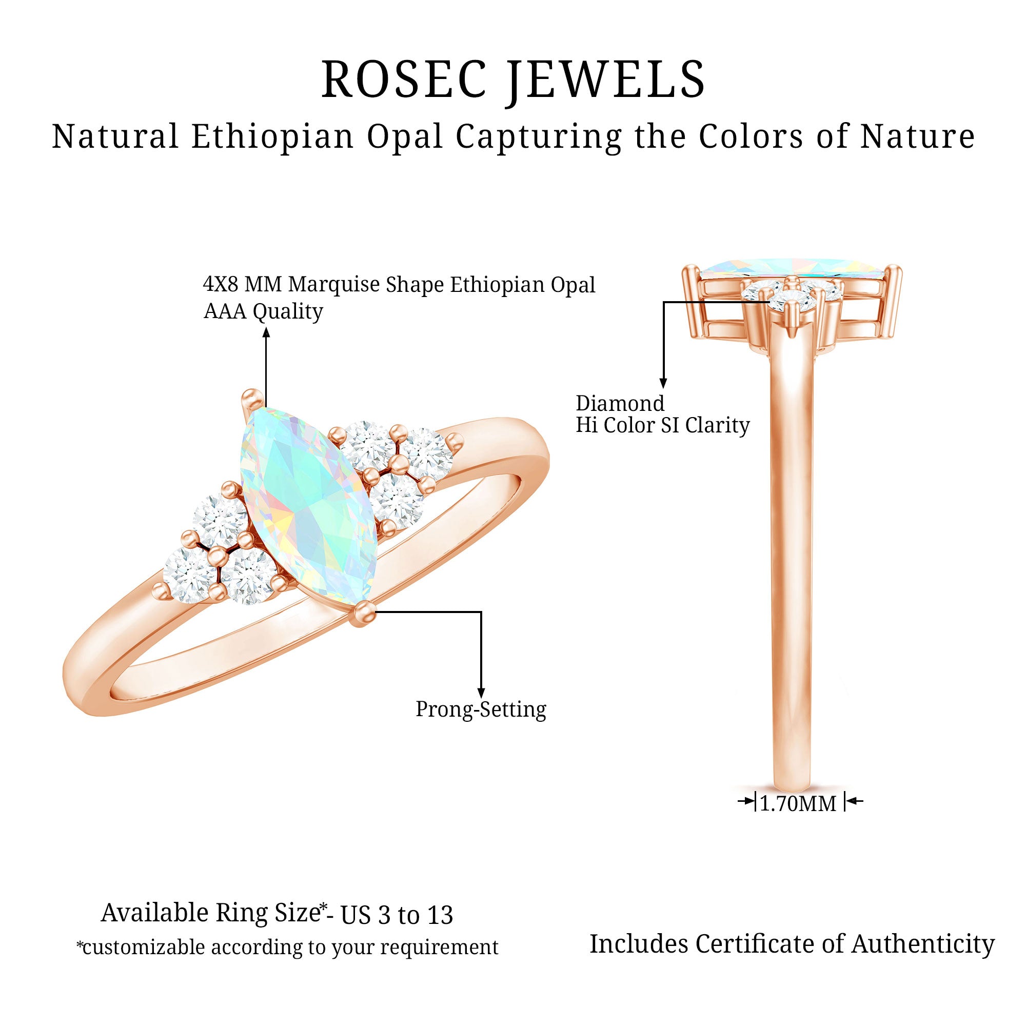 This vintage-looking rainbow opal marquise engagement ring is designed for those drawn to romantic details and distinctive gemstone character. The elongated marquise silhouette enhances the opal’s natural play of color, creating a center that feels both graceful and expressive.