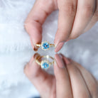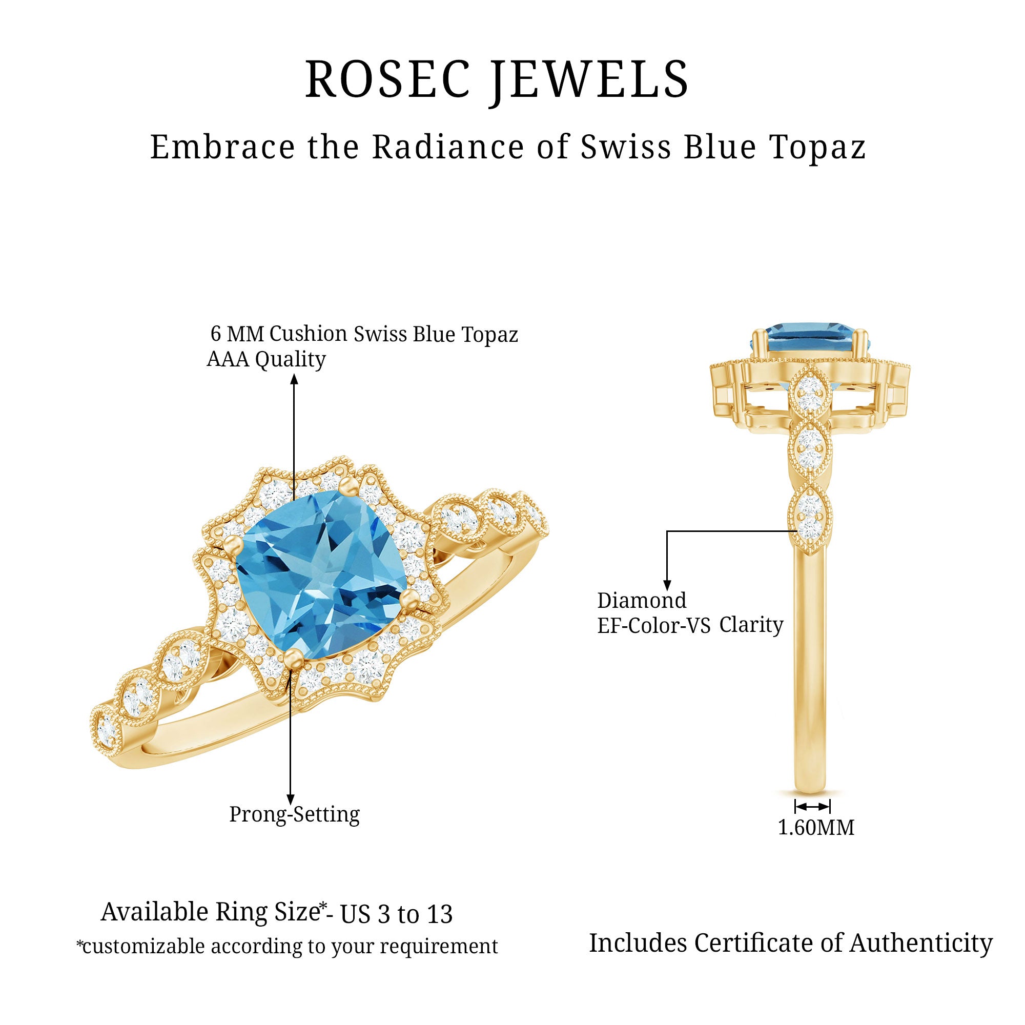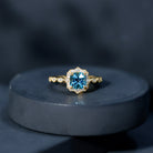 This Vintage Inspired Swiss Blue Topaz Engagement Ring is a breathtaking piece designed to capture the heart with its old-world charm and radiant sparkle. At the center of this romantic design lies a brilliant 6 MM cushion cut Swiss Blue Topaz, glowing with a vibrant blue hue that symbolizes clarity, calm, and everlasting love. The topaz is securely held in prong setting, allowing light to dance through every facet. Surrounding the center stone is a halo of round lab grown diamonds, each set with precision to create a dazzling frame. These diamonds are not only ethically sourced but also offer high brilliance, bringing a touch of modern luxury to the vintage inspired setting. The halo itself is shaped with curves and points, creating a unique floral-like design that enhances the overall romantic appeal. Adding to its vintage feel is the delicate beaded detailing that outlines the halo and continues down the shank. This tiny detailing gives the Vintage Engagement Ring a handcrafted, antique look, just like something youd find in a family heirloom box. The band features a series of marquise shaped patterns, each set with sparkling lab grown diamonds, echoing the timeless artistry of vintage jewelry design. Crafted in 14k yellow gold plated silver, the warm tone of the metal perfectly complements the cool blue topaz, creating a soft and feminine contrast. The combination of intricate details, modern gemstones, and vintage elements makes this Blue Topaz and Diamond Ring a stunning choice for brides who dream of a love story that is equal parts classic and contemporary. A ring like this is a promise wrapped in history, beauty, and heartfelt emotion.
