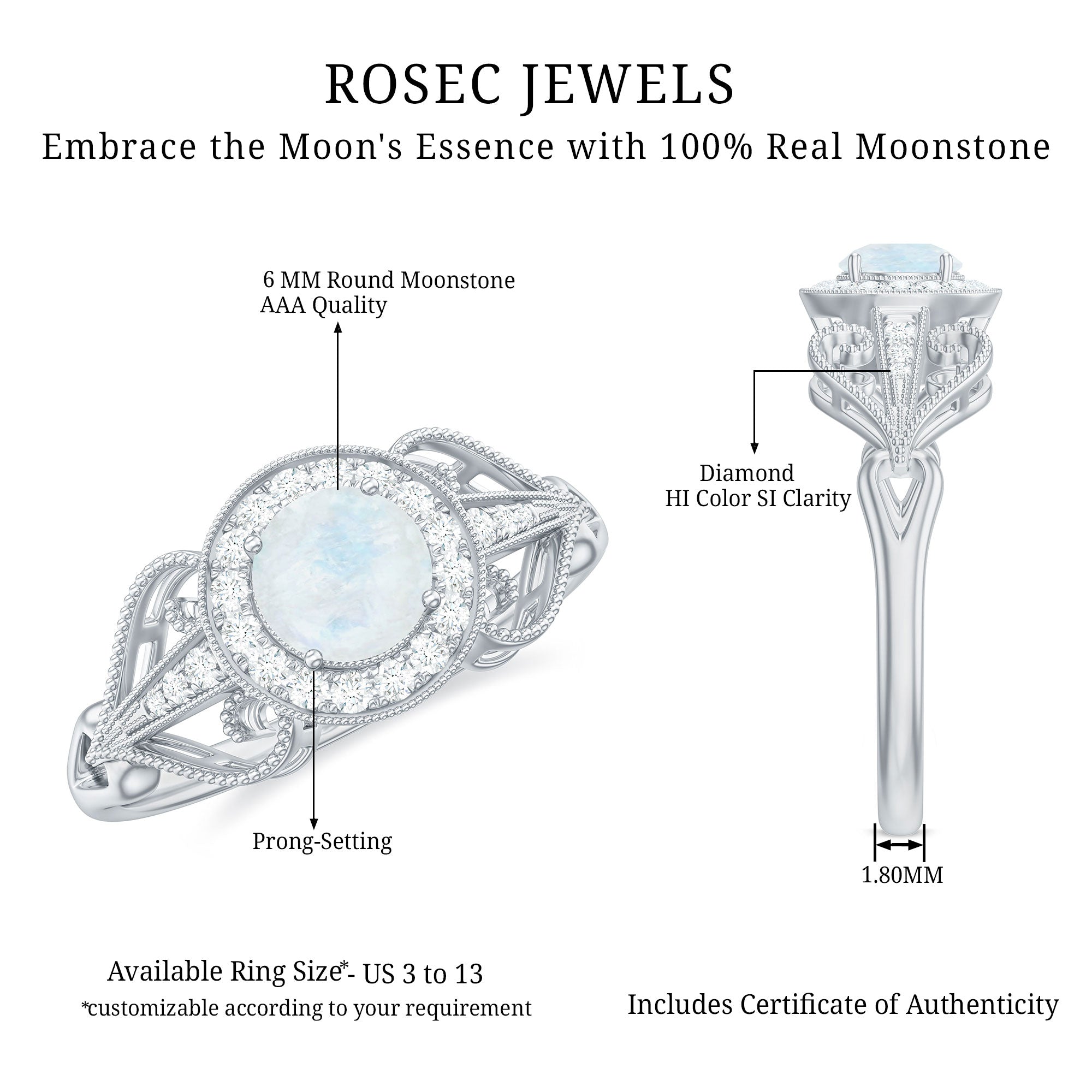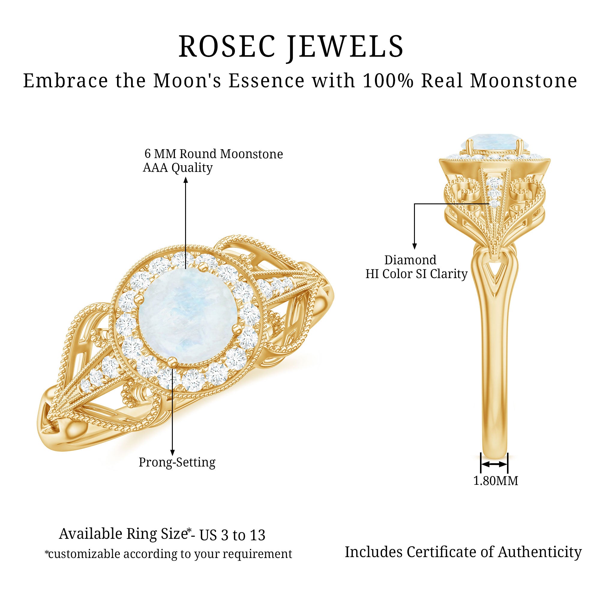 The brightness of Moonstone makes this vintage ring more appealing. The Moonstone Engagement Ring is embellished with Round Diamond Accent, glistening on the shank beautifully. The Moonstone Diamond Engagement Ring is accentuated with Beaded Gold, make your significant feel more precious with this Moonstone Gold Ring.
