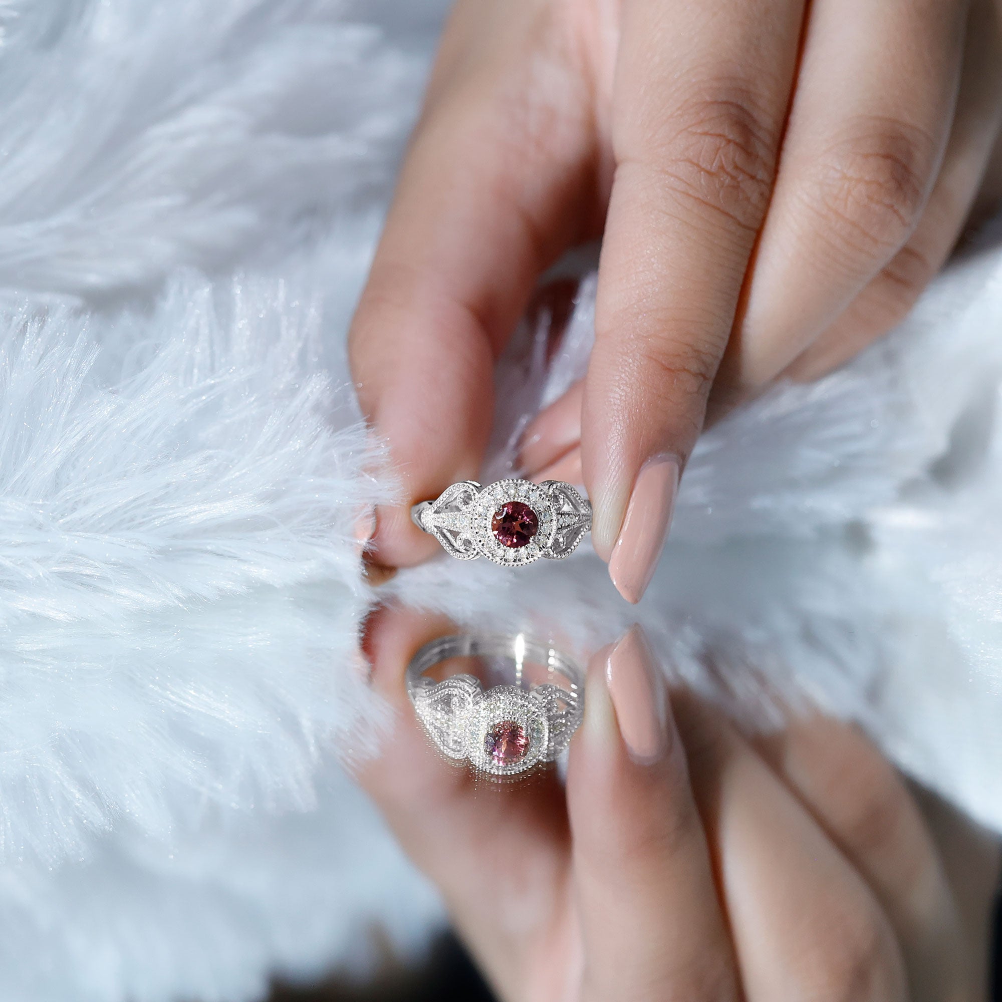 The halo setting frames the center stone, increasing light reflection and creating visual dimension. Vintage-inspired detailing adds character and depth without overpowering the central pink tourmaline. The structured setting supports the stones securely while maintaining a balanced, elegant profile suitable for an engagement piece.