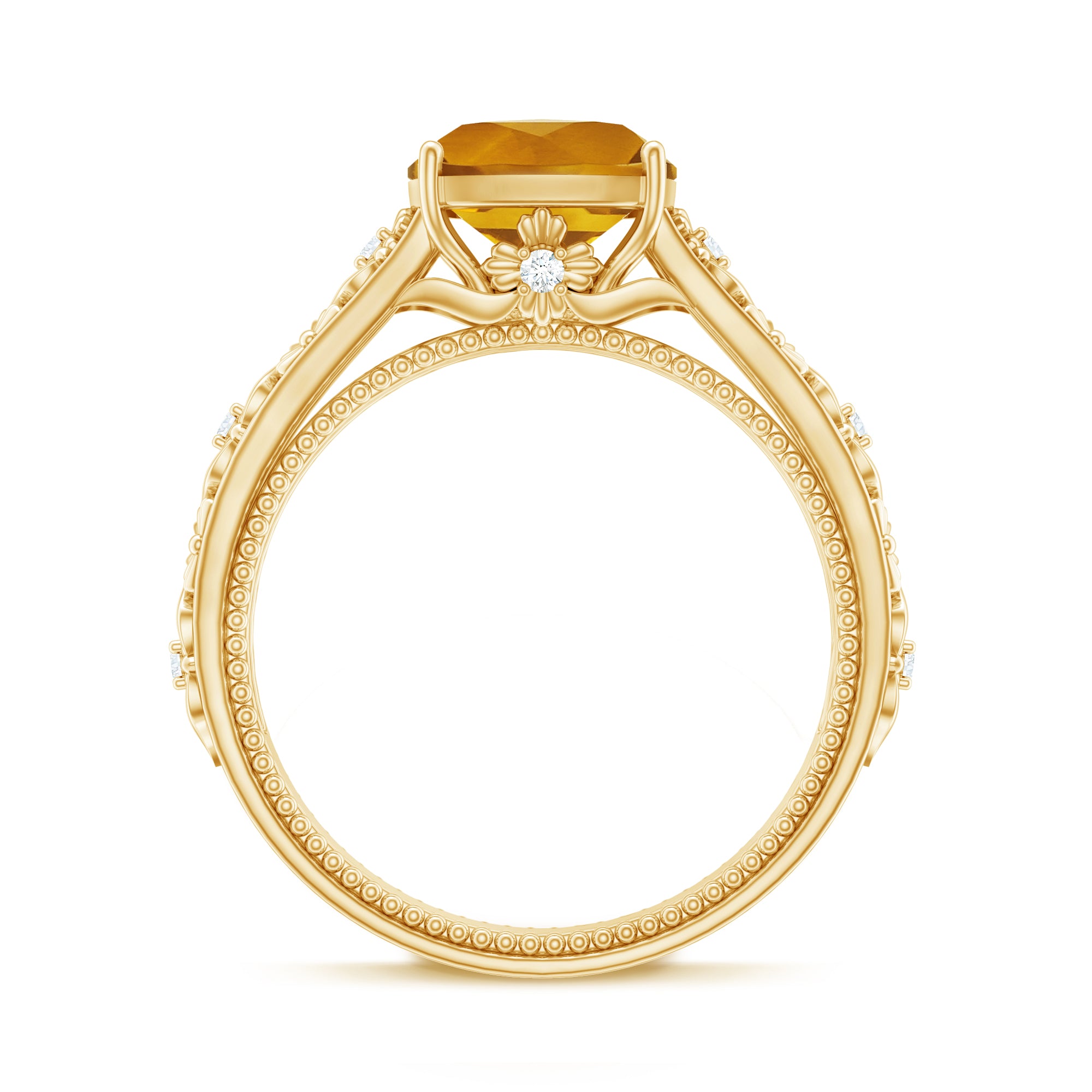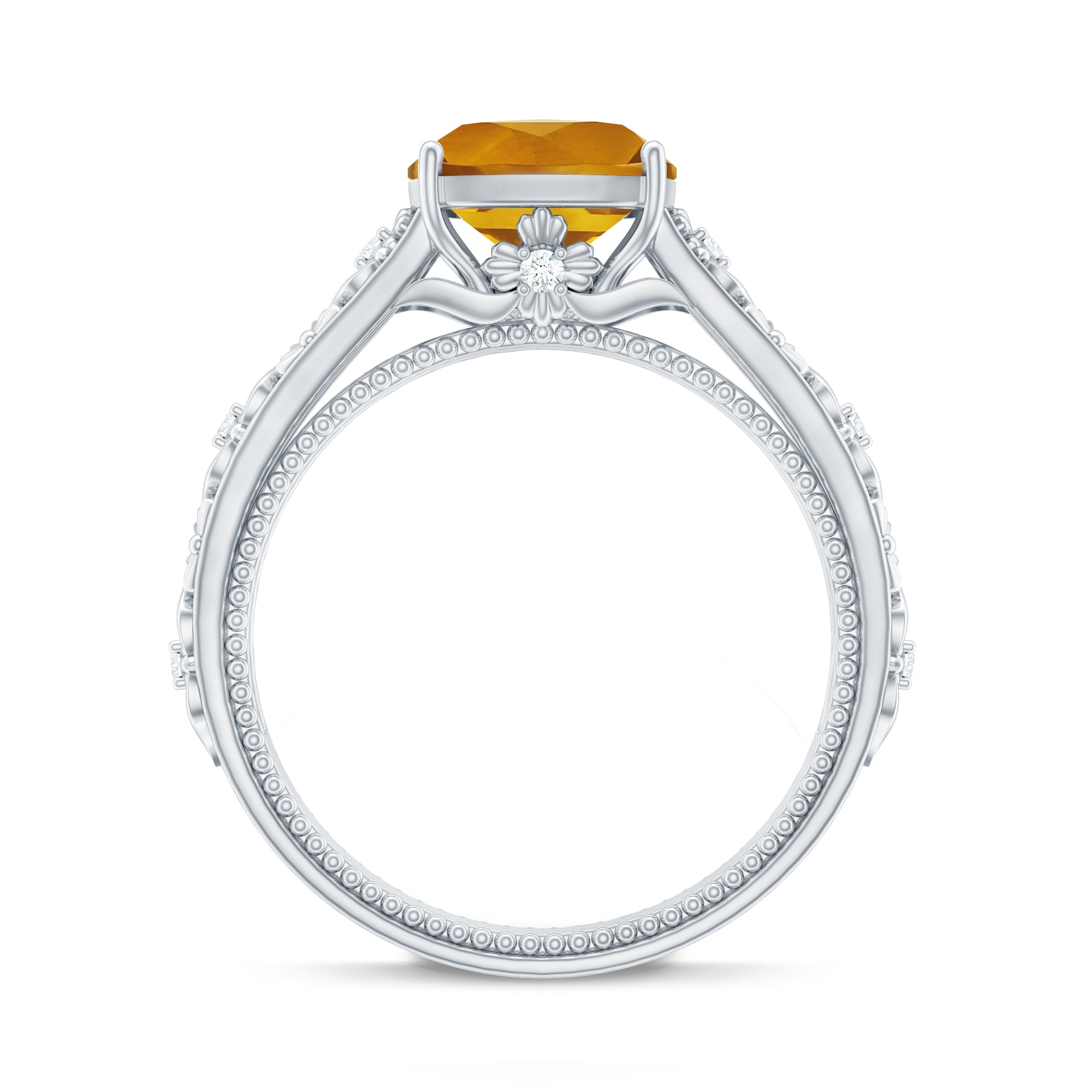 Capture the essence of romance inspired by a bygone era with this enchanting Vintage Looking Engagement Ring. At its center shines an 8 mm Cushion Cut Citrine set in Prong Setting, rich in warm golden tones that feel joyful, intimate and full of meaning. The band is beautifully detailed with delicate Floral motifs, each one adorned with a dainty Diamond stone that shimmers like whispered promises. Adding to its charm, the inner shank features intricate Beaded detailing, a hidden touch of craftsmanship meant to be cherished by the wearer. Every curve and sparkle feels thoughtfully placed, creating a ring that tells a story of devotion, tradition and enduring beauty. Designed for comfort and everyday wear, this Citrine Engagement Ring blends old-world charm with modern craftsmanship. Whether chosen for a proposal, an anniversary or a meaningful moment of love, this Citrine Diamond Ring arrives in a signature jewelry box and is available in various ring sizes. It is a heartfelt symbol of eternal love, crafted to be treasured for generations to come.