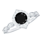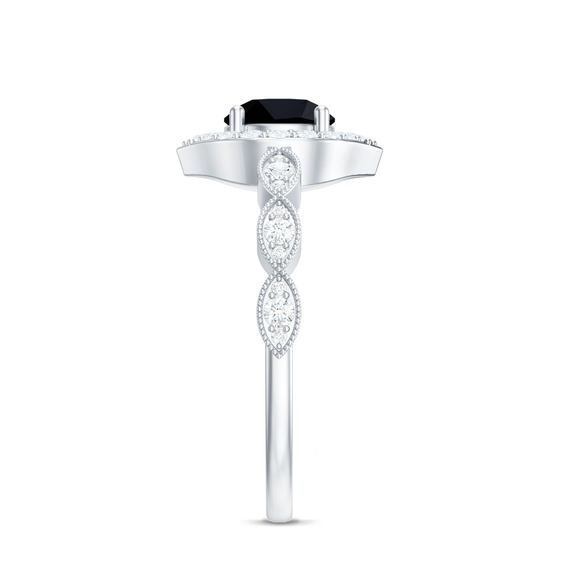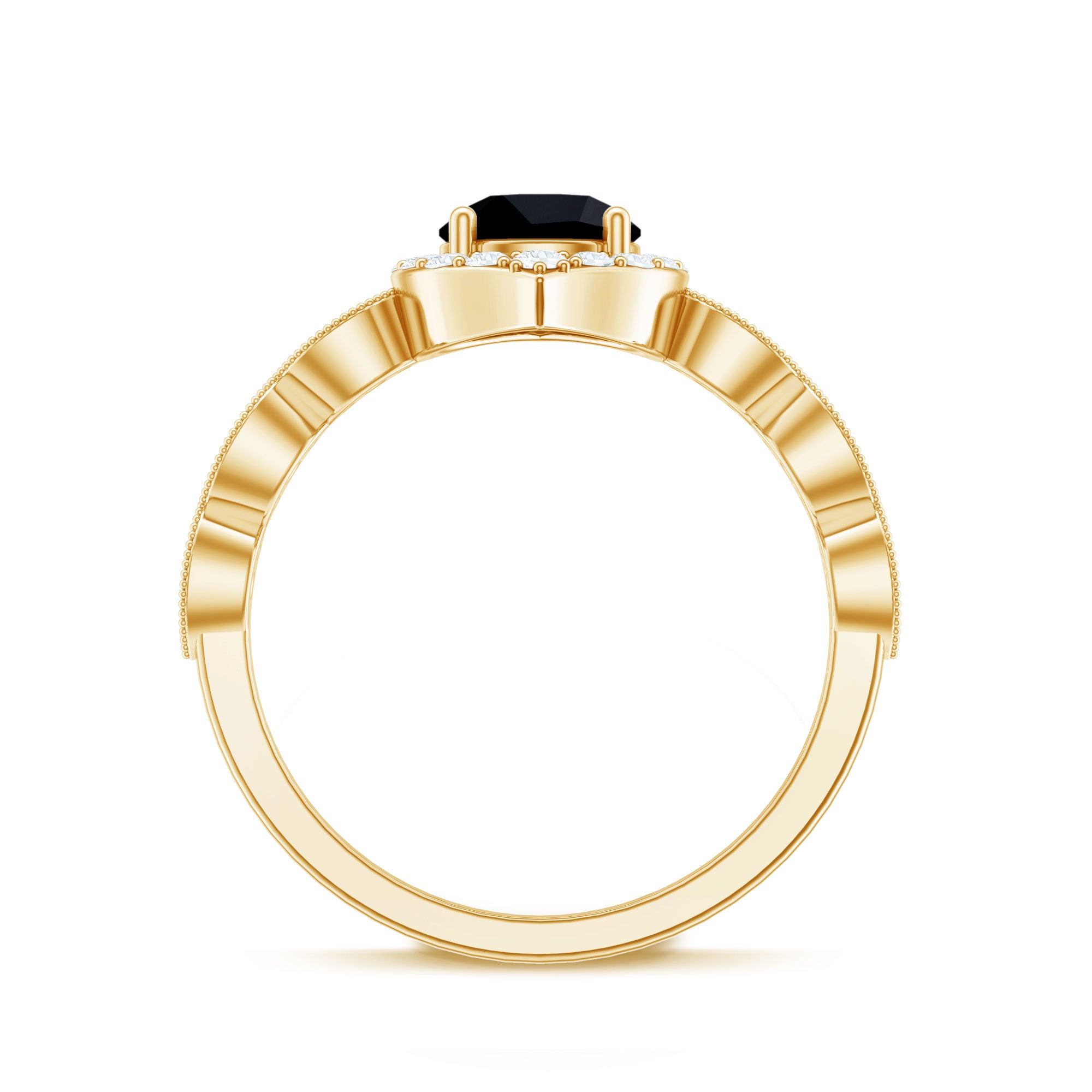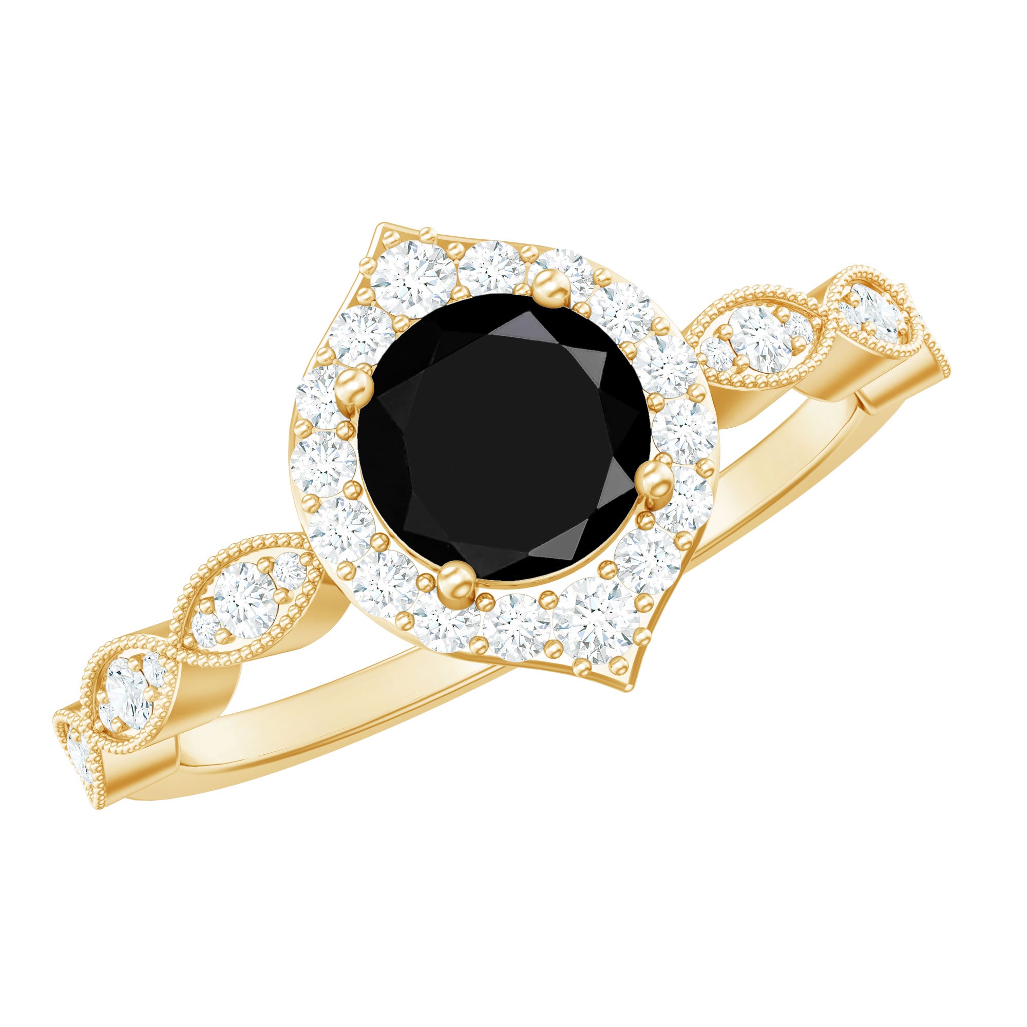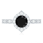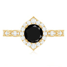 Indulge in regal elegance with this vintage-style engagement ring, showcasing a dazzling 7 MM round-cut Black Spinel at its center, encircled by round-cut Diamond accent on delicate beaded embellishments. Made of gold, this ring is an ideal choice for women who admire antique and artistic jewelry.