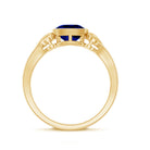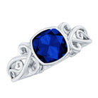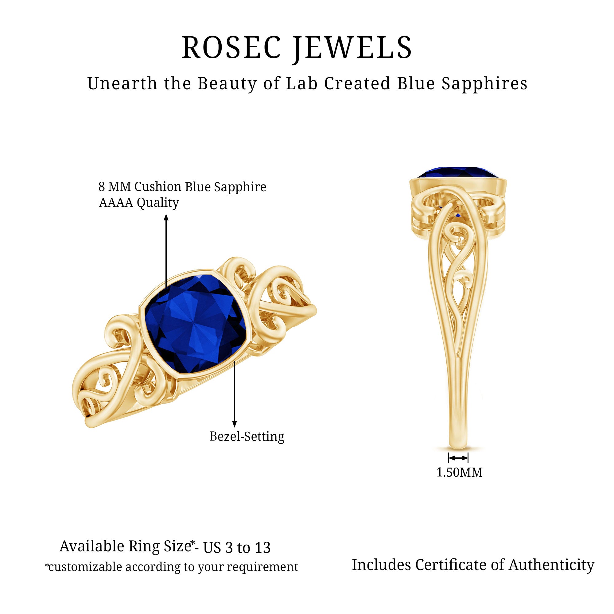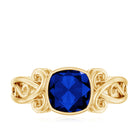 Crafted with a charming gold metal mount, this Cushion Solitaire Ring is sure to captivate with its stunning design. The centerpiece of this engagement ring is a breathtaking Cushion Cut Created Blue Sapphire, elegantly set in a bezel setting to create a striking solitaire look. The created blue sapphire ring also features a delightful vintage design in gold, adding to its allure and making it the perfect gift for that special lady in your life.