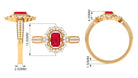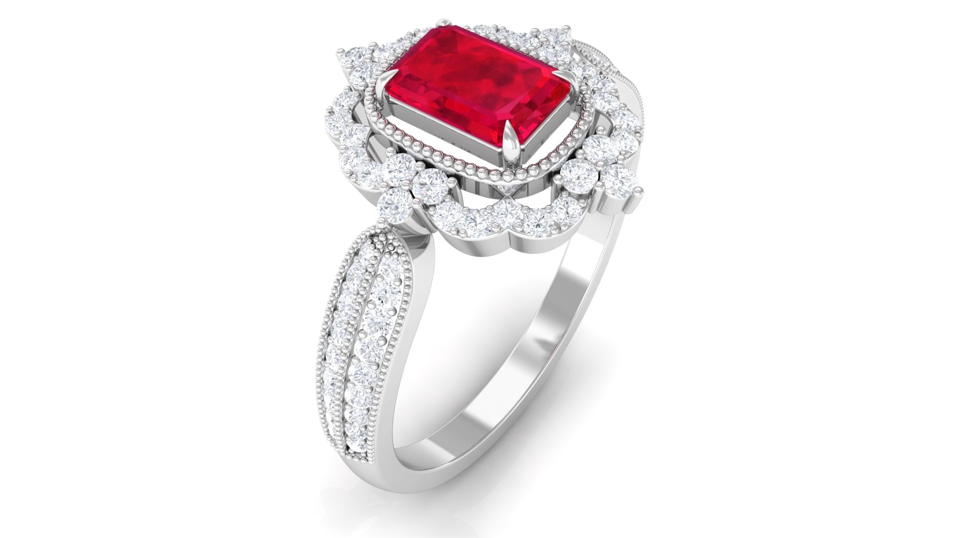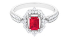 Vintage Style Emerald Cut Created Ruby Engagement Ring with Diamond Floral Halo