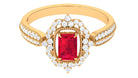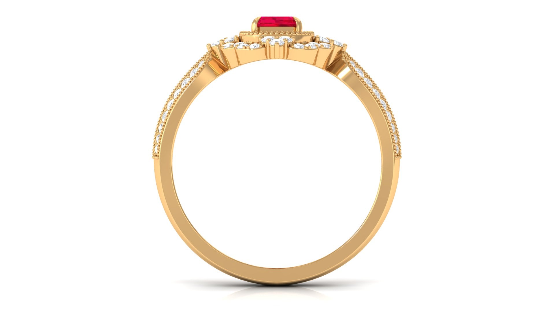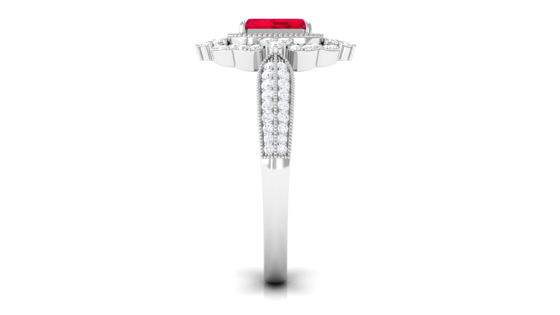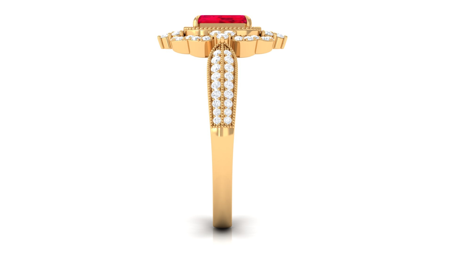 Add a touch of luxury and aesthetics to your style with this Created Ruby Vintage Ring. Emerald Cut Created Ruby is held in Claw Setting beautifully and to add more charm to its beauty, there are round Diamond studded in surface prong setting. This Created Ruby Engagement Ring exhibits high brilliance.