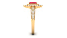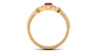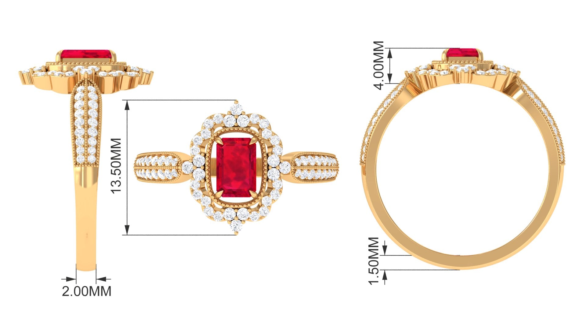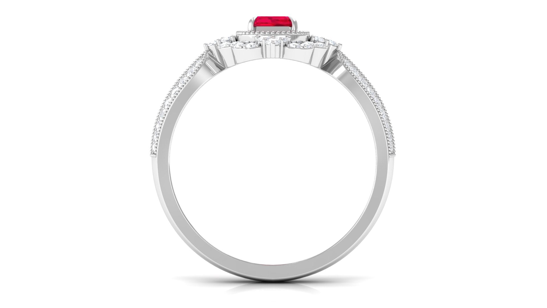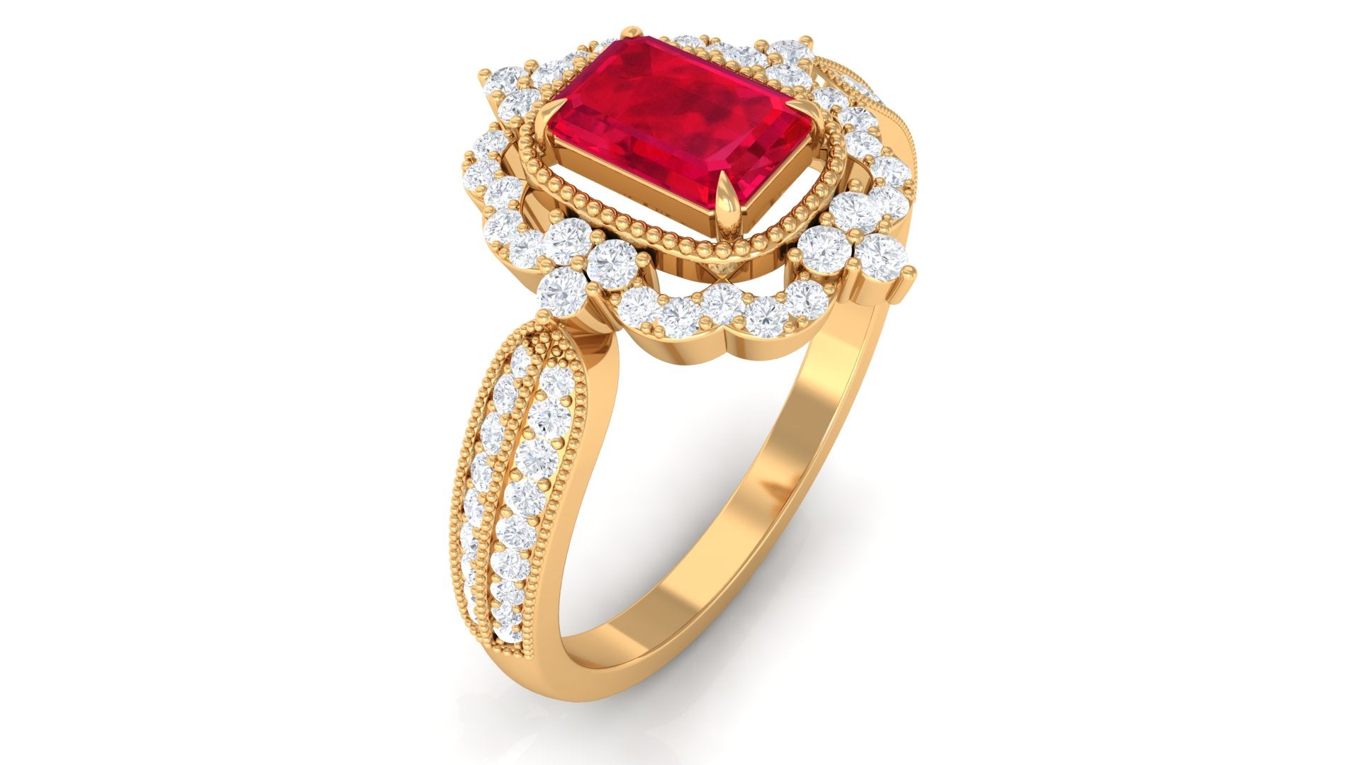Add a touch of luxury and aesthetics to your style with this Created Ruby Vintage Ring. Emerald Cut Created Ruby is held in Claw Setting beautifully and to add more charm to its beauty, there are round Diamond studded in surface prong setting. This Created Ruby Engagement Ring exhibits high brilliance.