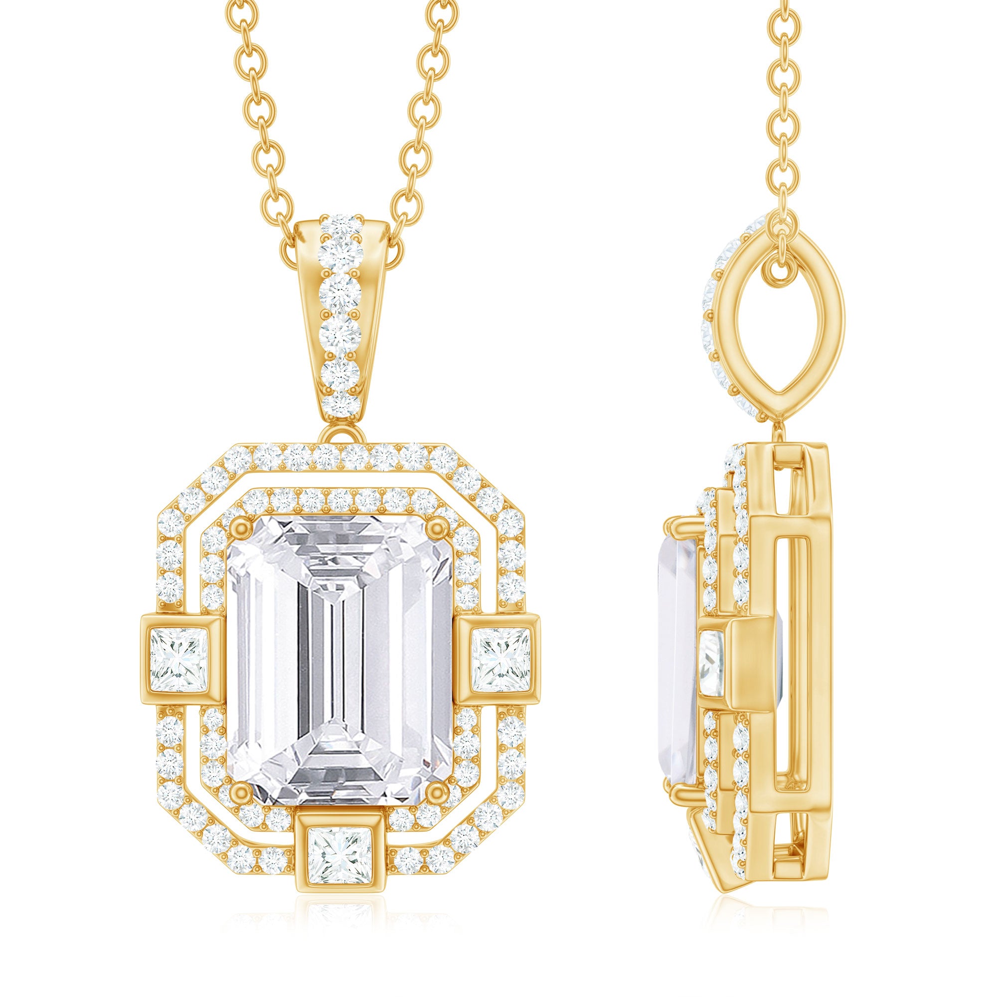 Embrace the allure of vintage-inspired design with our exquisite pendant necklace. This stunning piece showcases an emerald-cut moissanite placed gracefully within a shimmering moissanite halo. The pendant is further enhanced by the captivating sparkle of princess and round cut moissanite accents. If you have a penchant for dazzling brilliance, this necklace is the perfect choice for you. Its timeless elegance and radiant beauty make it a safe bet to add a touch of glamour to any ensemble.