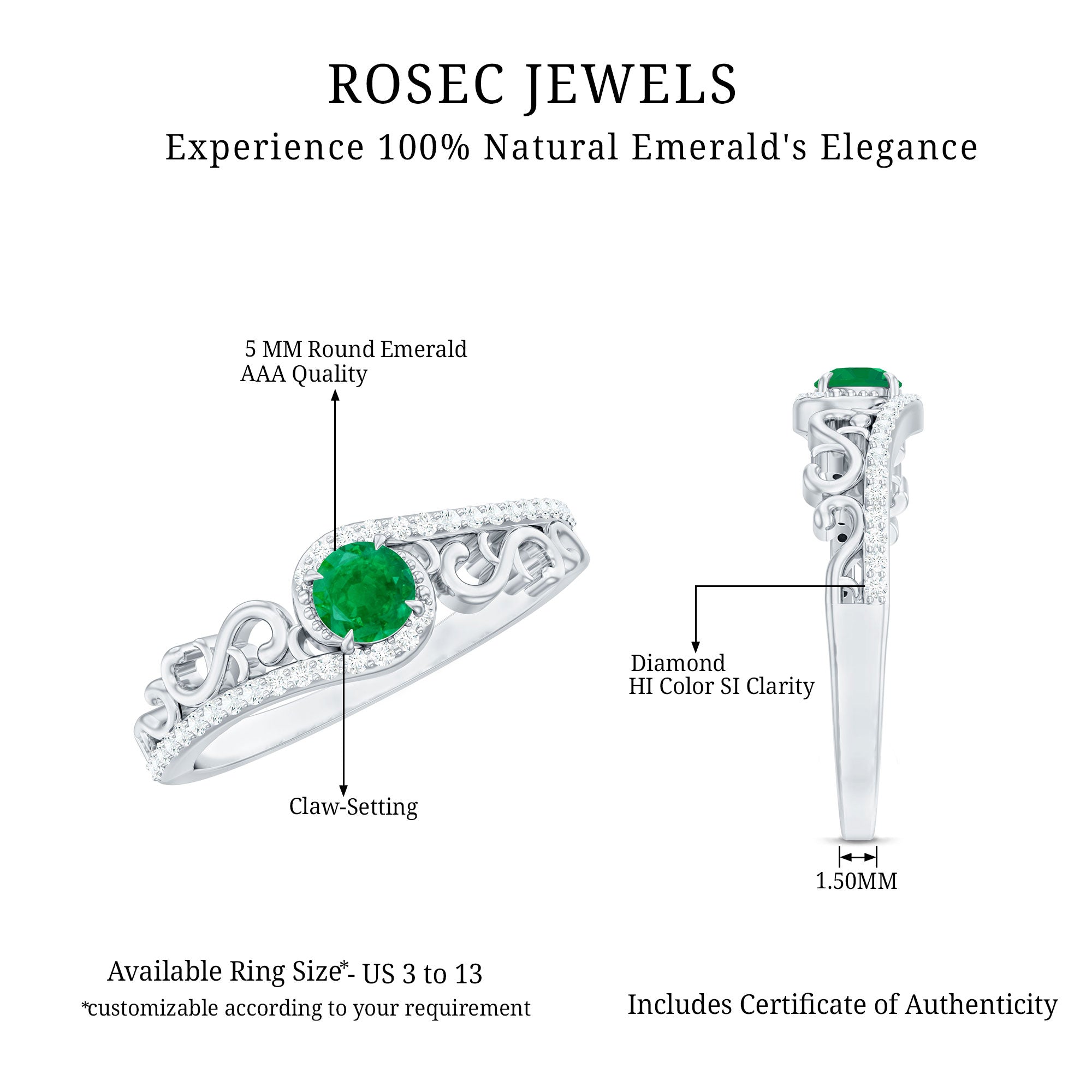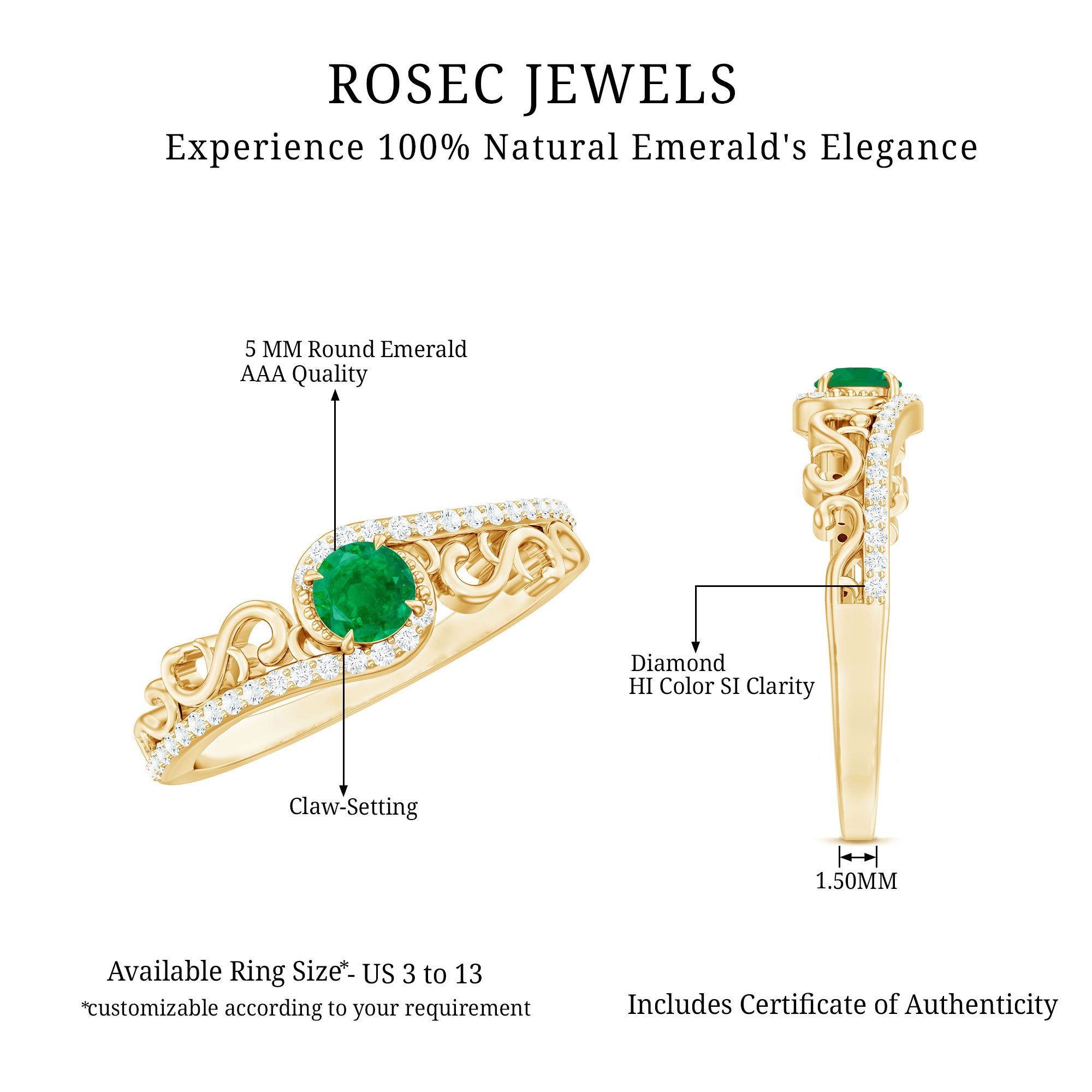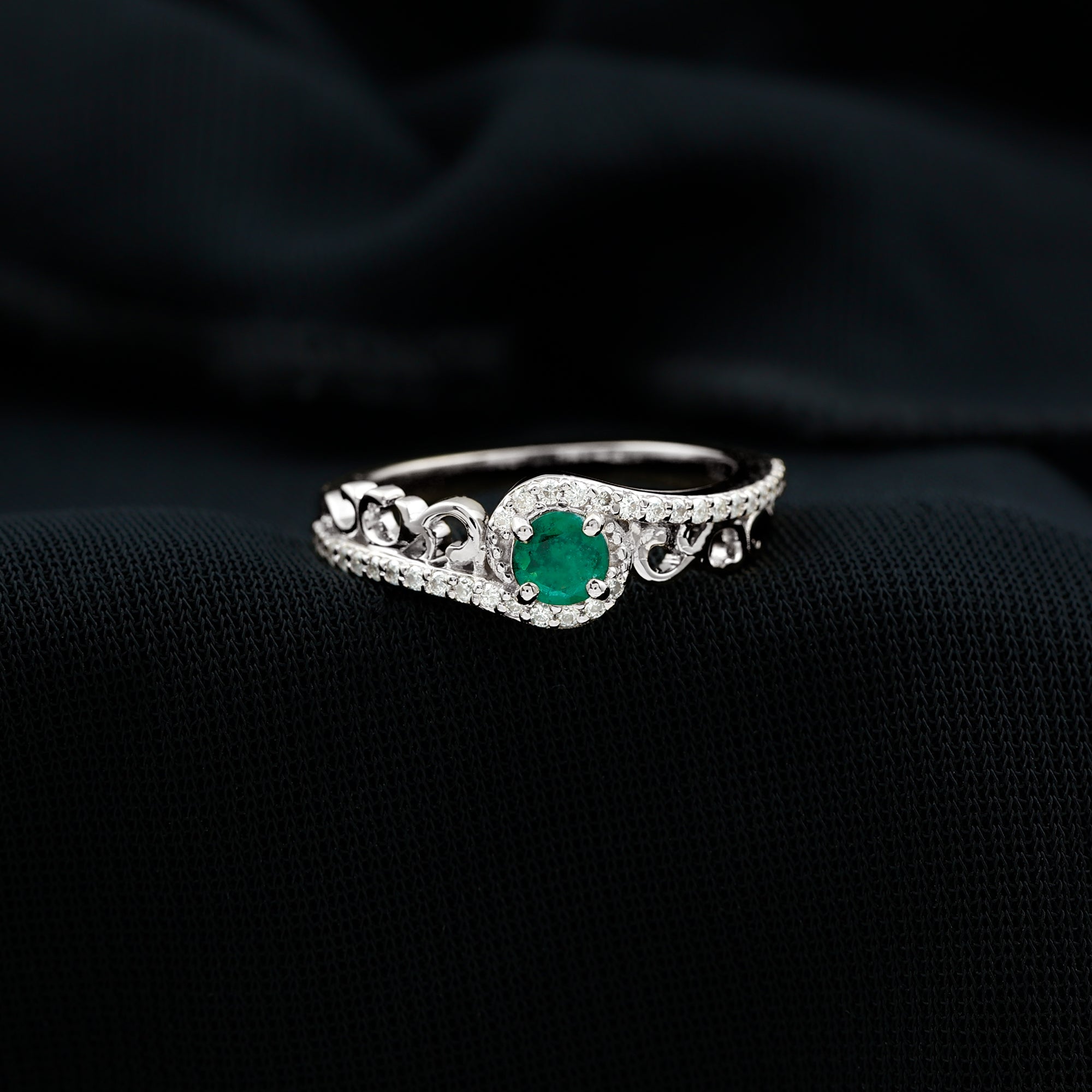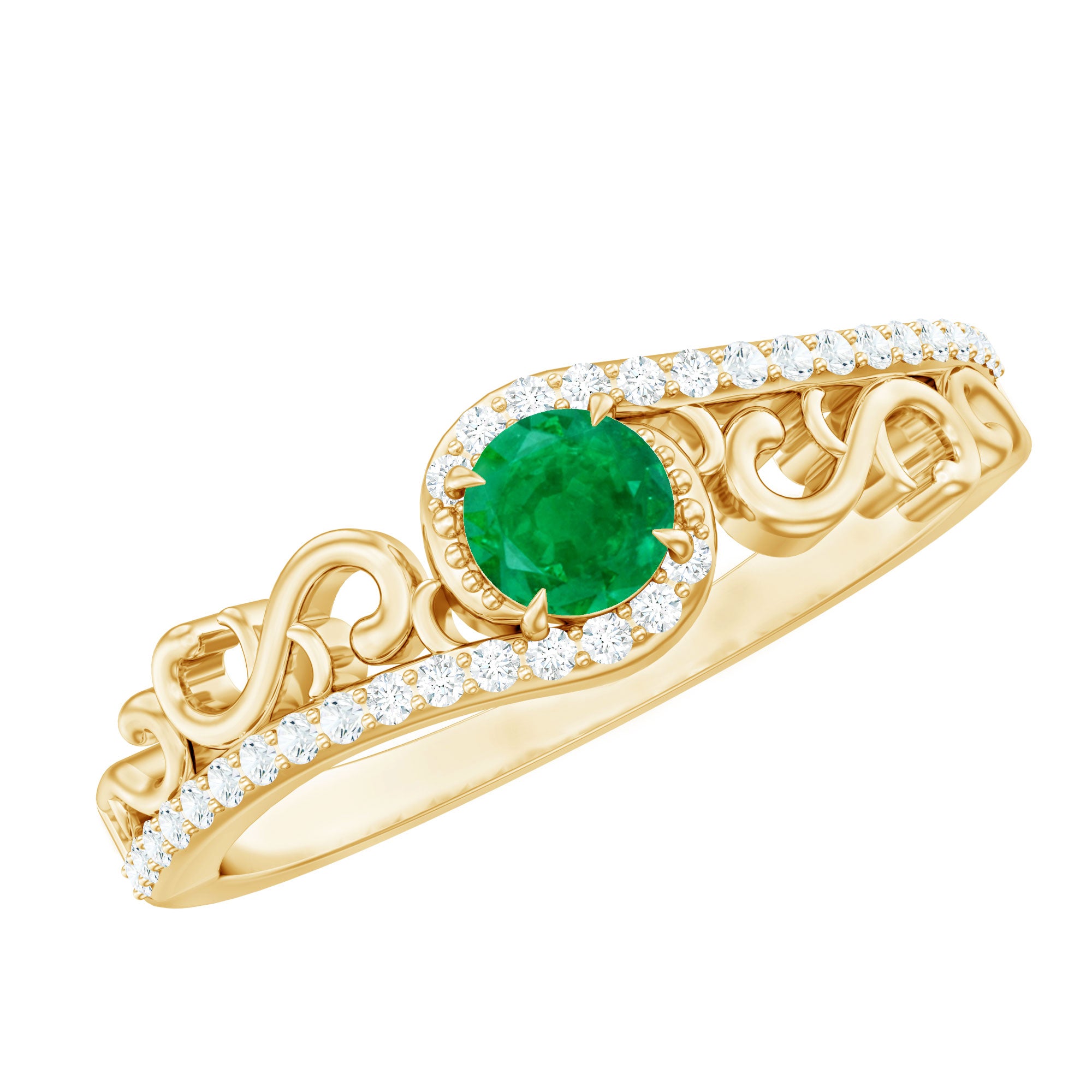 Inspired by the elegance of a bygone era, this Vintage Inspired Engagement Ring tells a story of timeless love and devotion. At its center lies a captivating 5 mm Round Shape Emerald set in Claw Setting, glowing with a deep green hue that symbolizes growth, hope and everlasting commitment. The Bypass Shank, adorned with sparkling Diamond stones, wraps gently around the Emerald in a graceful dance of light and design, reflecting a vintage charm that is both romantic and unique. Every detail of this Emerald Engagement Ring is thoughtfully crafted, from the intricate work to the way the Diamond stones catch the light from every angle, creating a mesmerizing sparkle that complements the rich green of the Emerald. Perfect for a proposal or as a treasured symbol of engagement, this Bypass Engagement Ring with Emerald brings together classic beauty and modern sophistication in one stunning piece. This Emerald Diamond Engagement Ring comes presented in a signature jewelry box, ready to mark a milestone in your love story. With a variety of ring sizes to choose from, you can select the ideal fit for your special someone. This exquisite Emerald Engagement Ring for Women is a celebration of a love that is timeless and unforgettable.