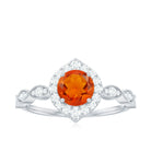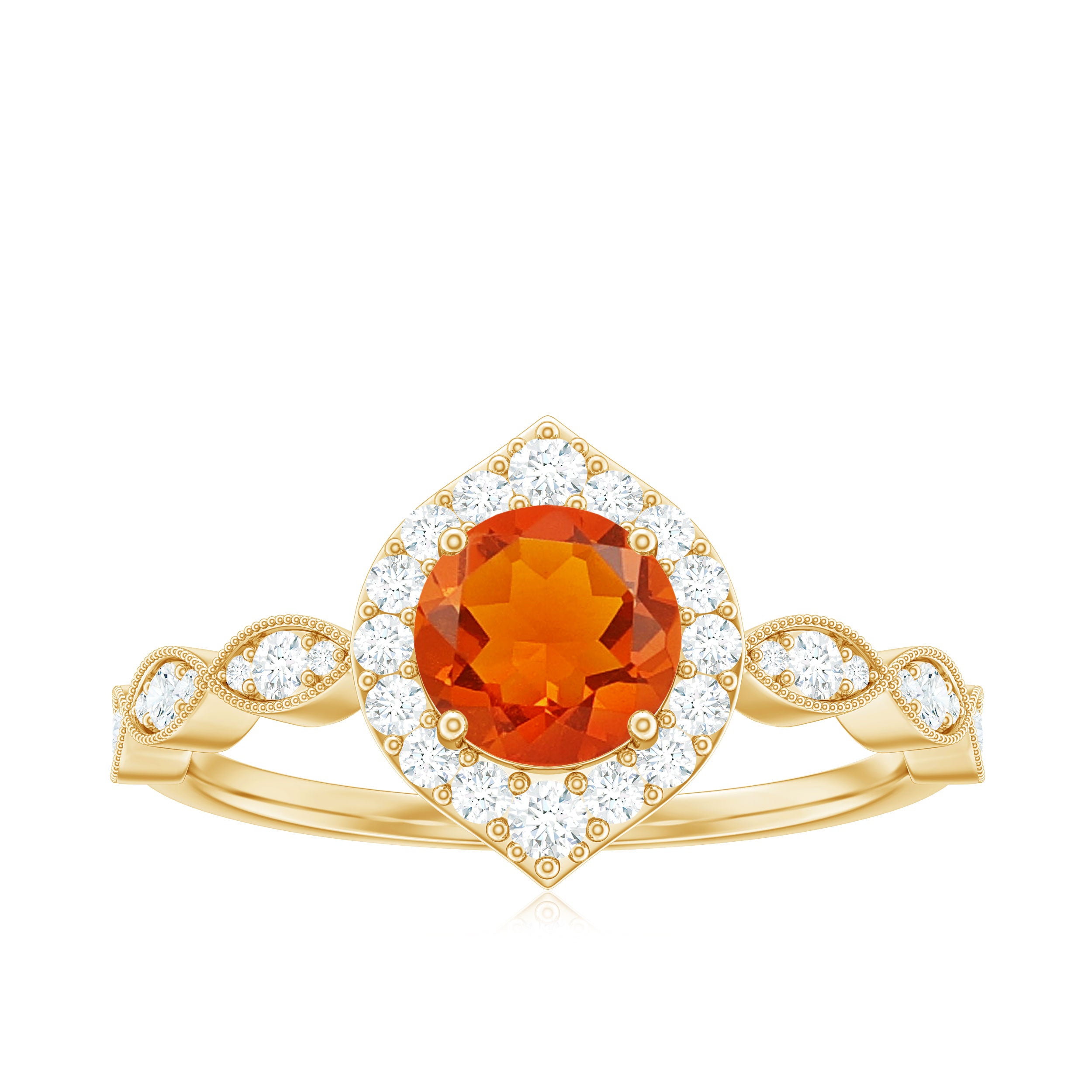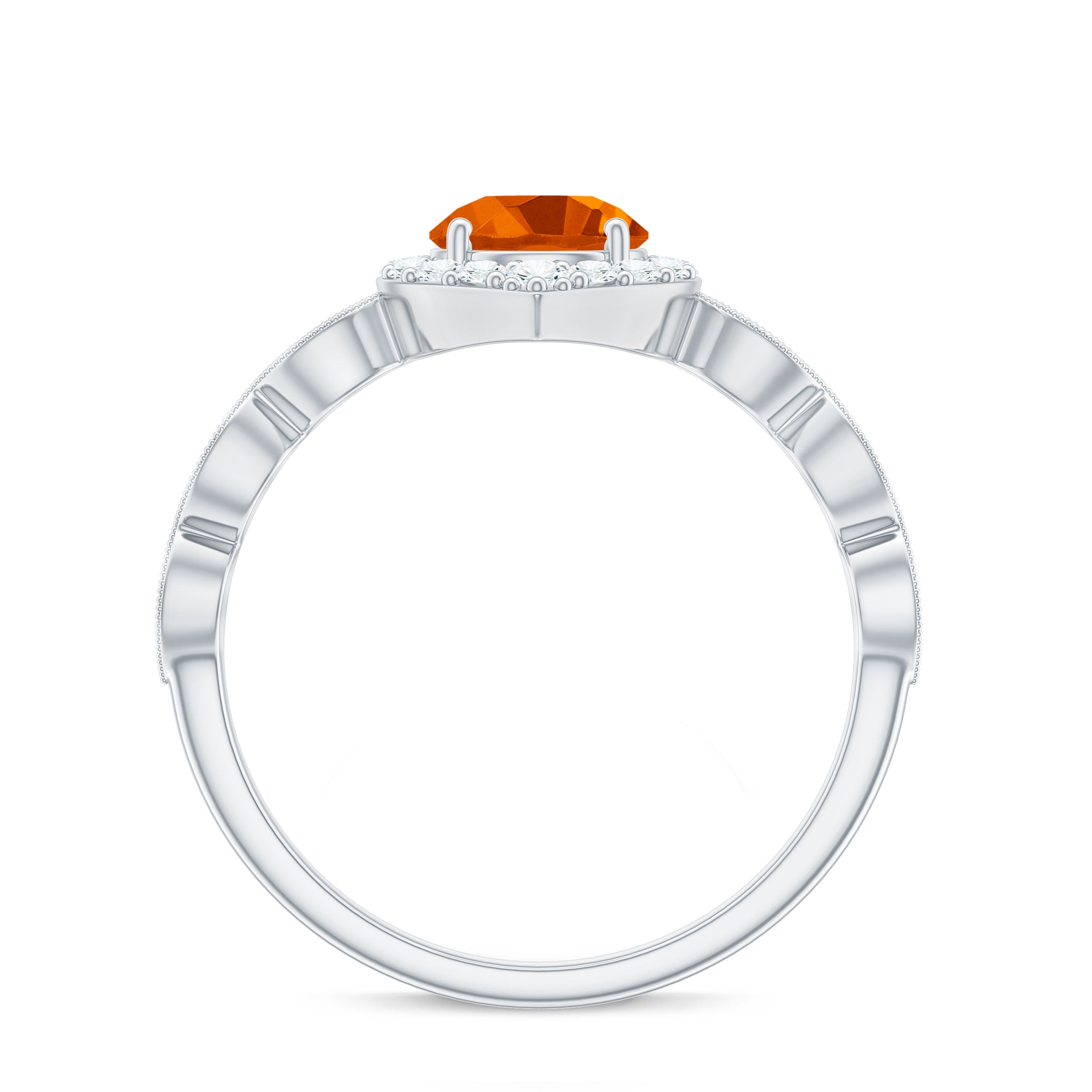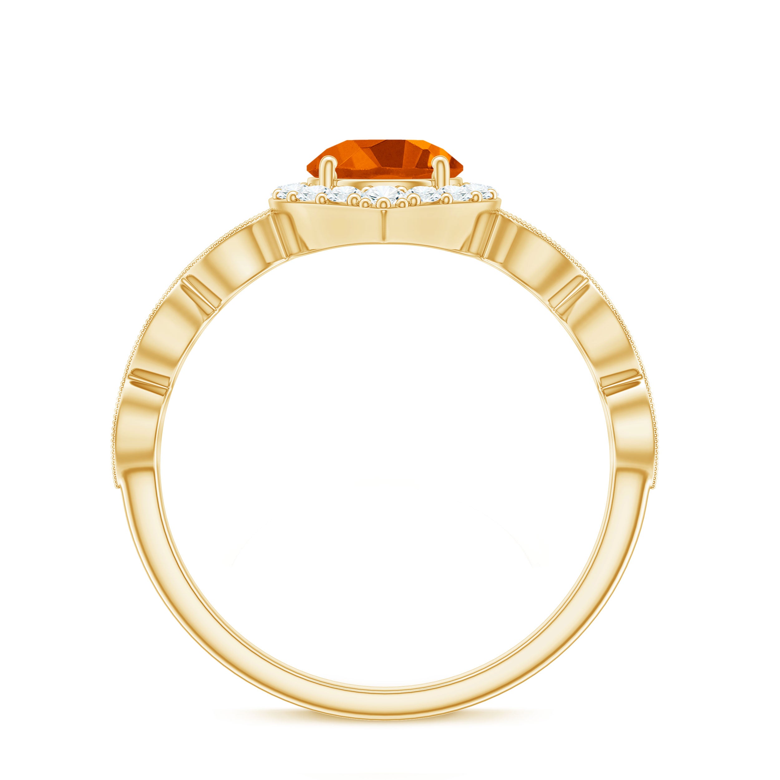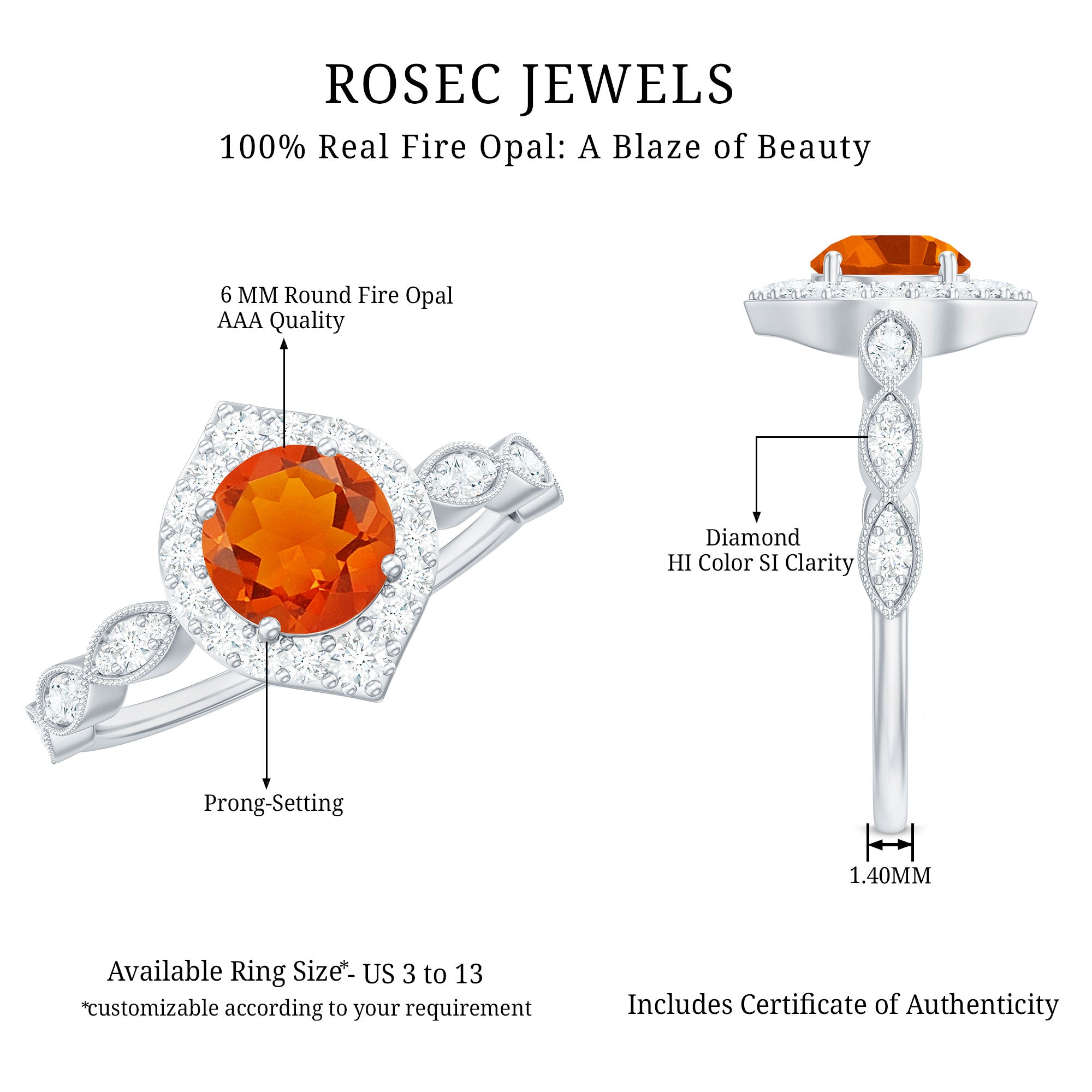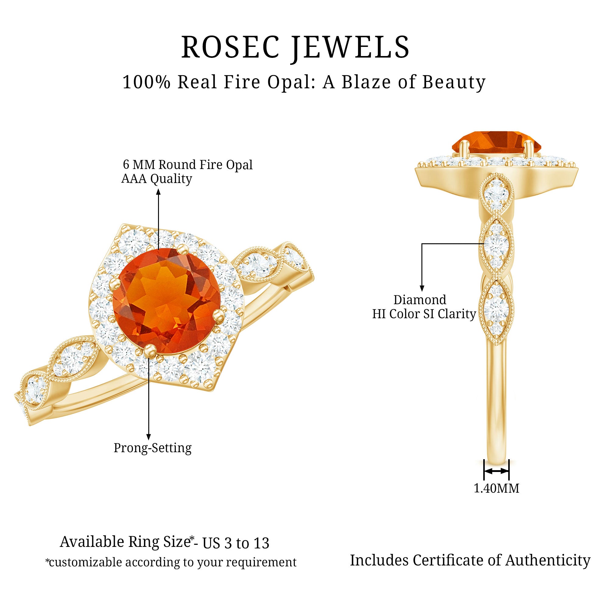 Embrace royalty with this vintage-inspired fire opal engagement ring. Featuring a radiating 6 MM round-cut fire opal center surrounded by round-cut Diamond accents on the beaded details, this solid gold ring is perfect for women who appreciate antique and artistic jewelry.