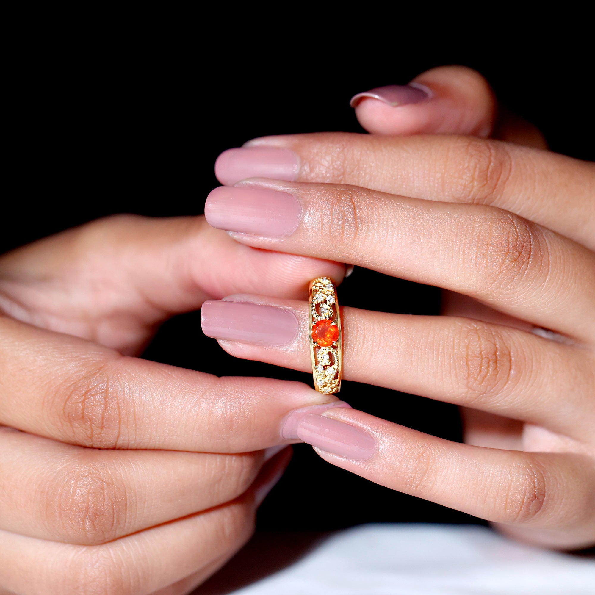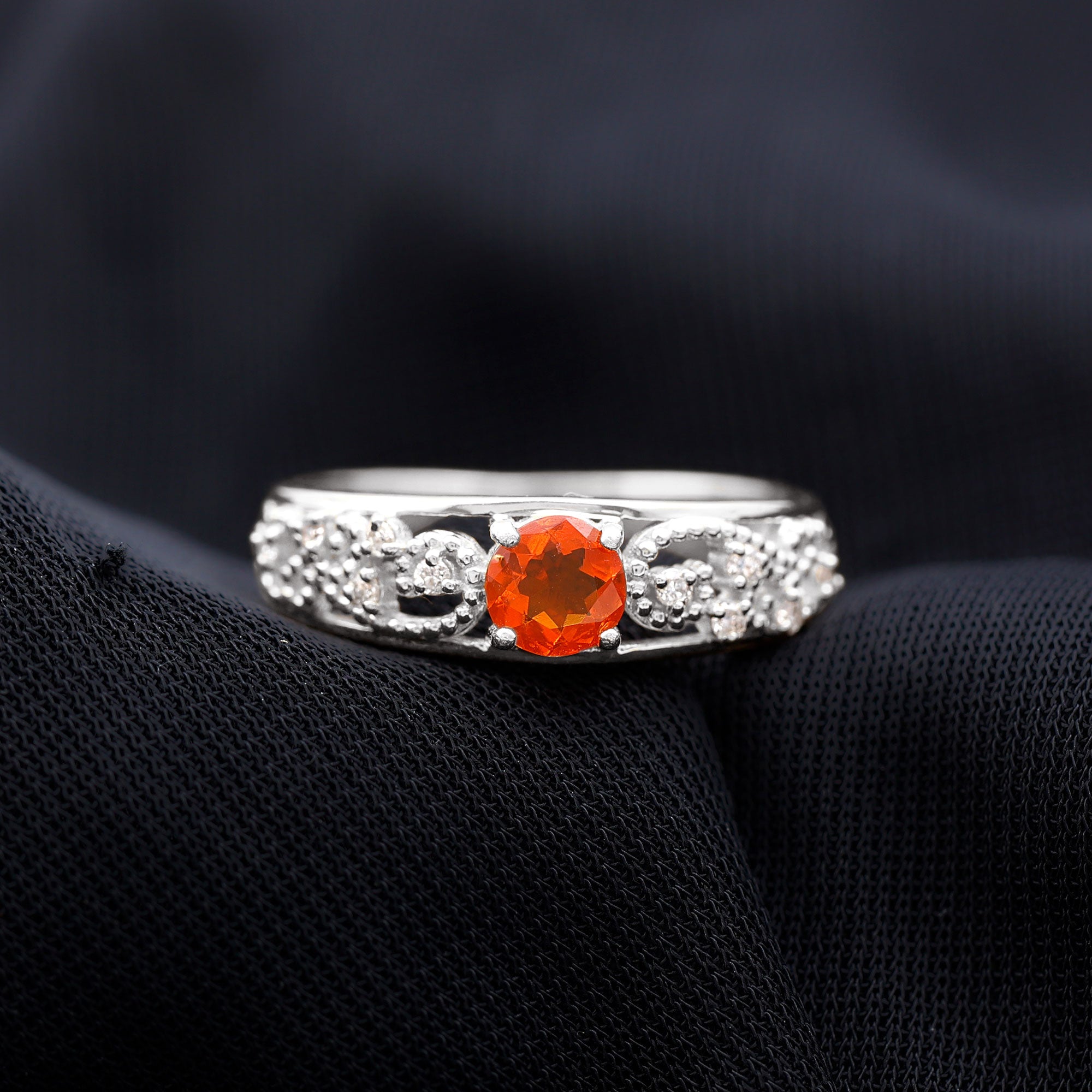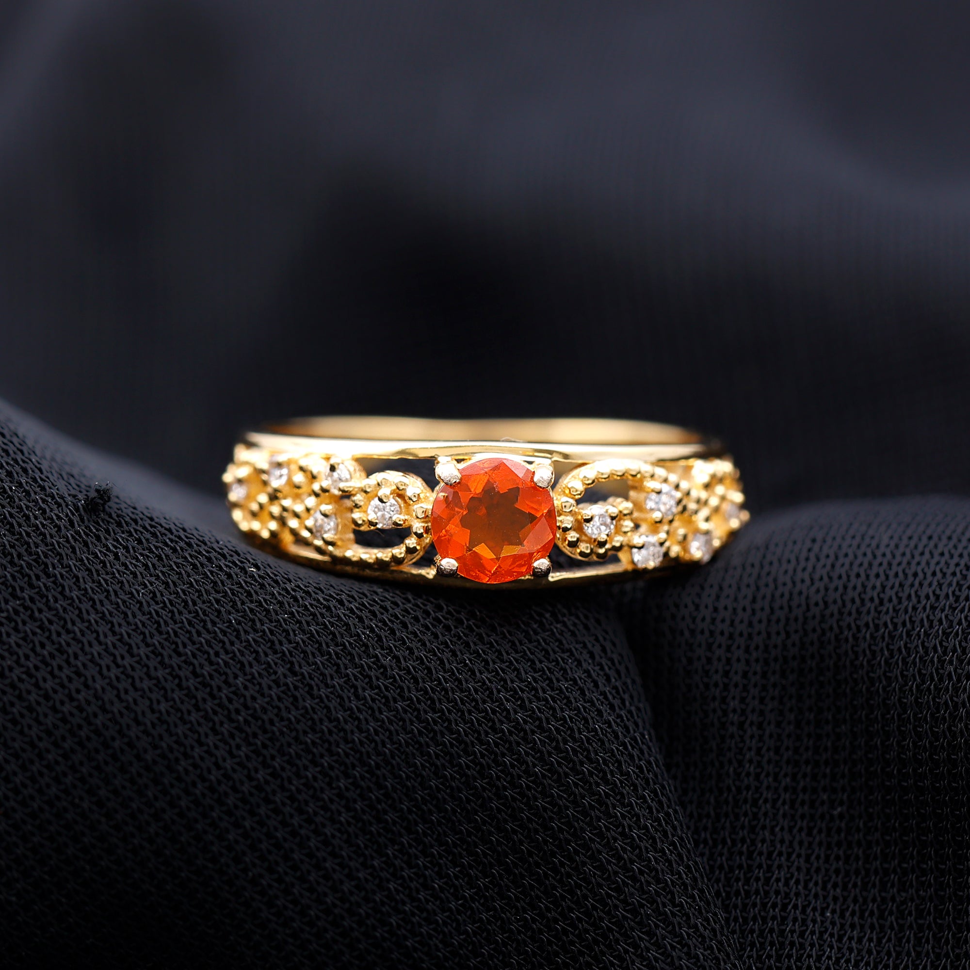 Embrace the allure of vintage elegance with our Solitaire Band Ring. At its heart lies a magnificent Round Shape Fire Opal, serving as the focal point of this stunning piece. This band ring stands as a symbol of both sophistication and exquisite beauty. Its intricate beaded detailing, delicately accentuated by small Diamond stones, infuses an element of distinctiveness and opulence into this exquisite bridal adornment.
