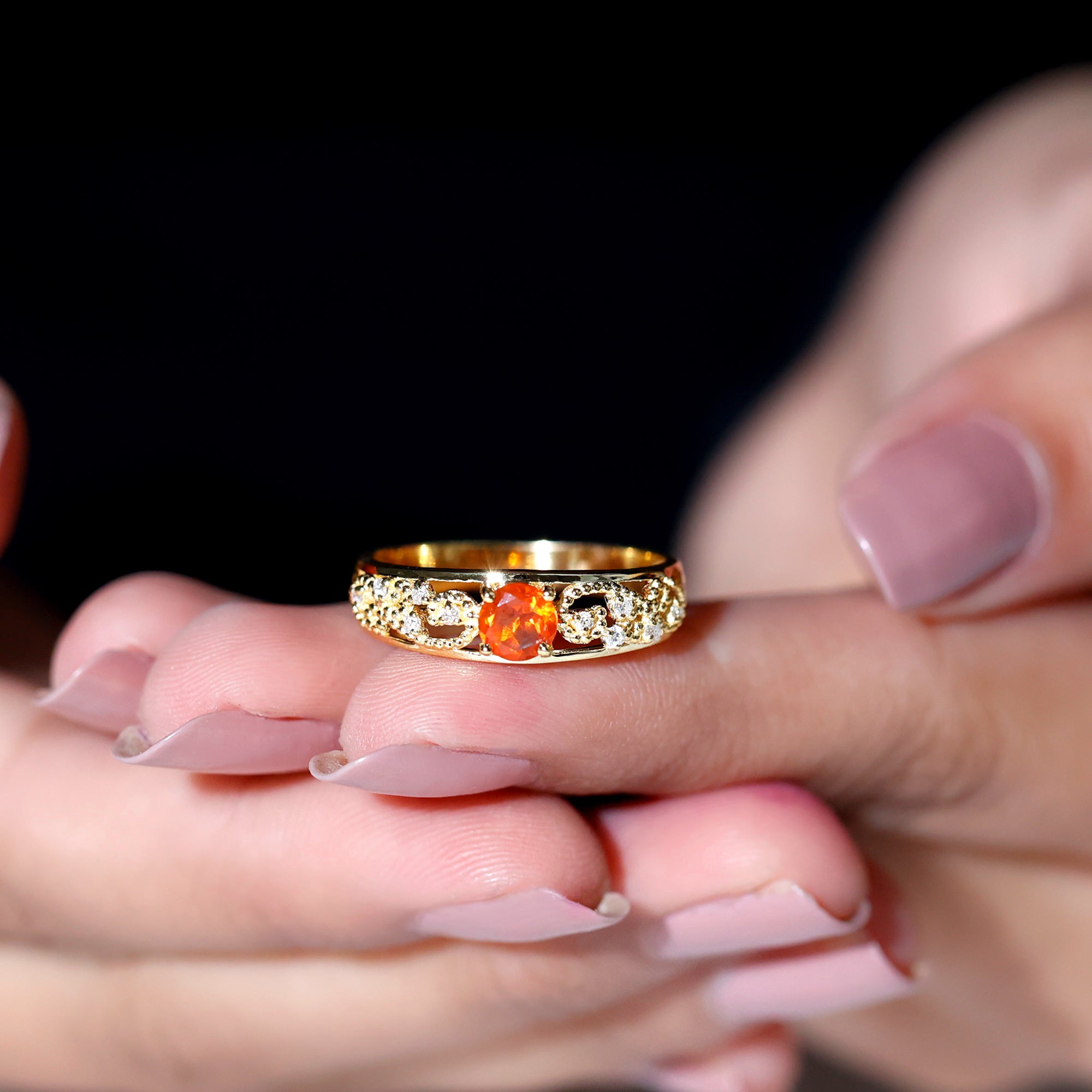 Vintage Style Fire Opal Solitaire Band Ring with Diamond and Beaded Detailing