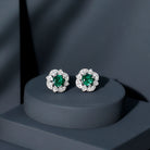 Inspired by the timeless beauty and natures elegance, these Vintage Stud Earrings are a statement of pure sophistication. Carefully handcrafted in 14K white gold plated silver, these Lab Grown Emerald Stud Earrings bring together the elegance of classic design with the sparkle of modern craftsmanship. They feature a 6 MM round brilliant cut lab created emerald securely set in prong setting in the center, radiating a rich, deep green hue that captures the eye instantly. Surrounding the center stone is a delicate moissanite halo, each stone expertly set to enhance brilliance and bring out the vintage vibe. The halo design of these Emerald Green Earrings is inspired by nature and traditional art, creating a graceful blend of femininity and old world charm that complements any style from casual chic to formal glam. What makes these Emerald Flower Earrings even more special is their screw back closure, which not only ensures a secure fit but give you the perfect comfort all day. Fall in love with the floral elegance, the sparkle, and the beauty of old school grace.
