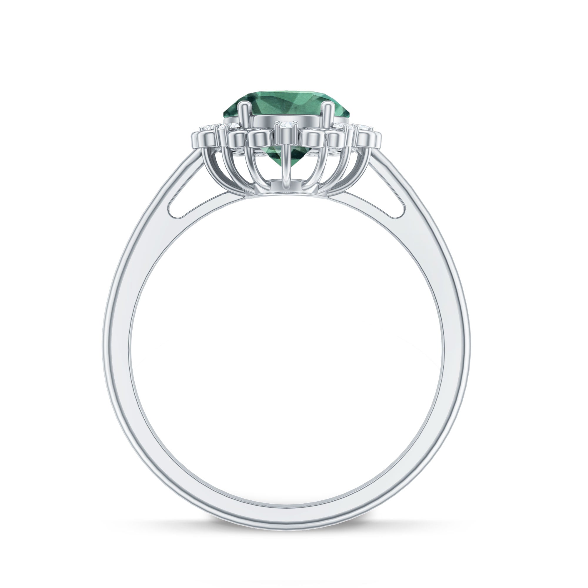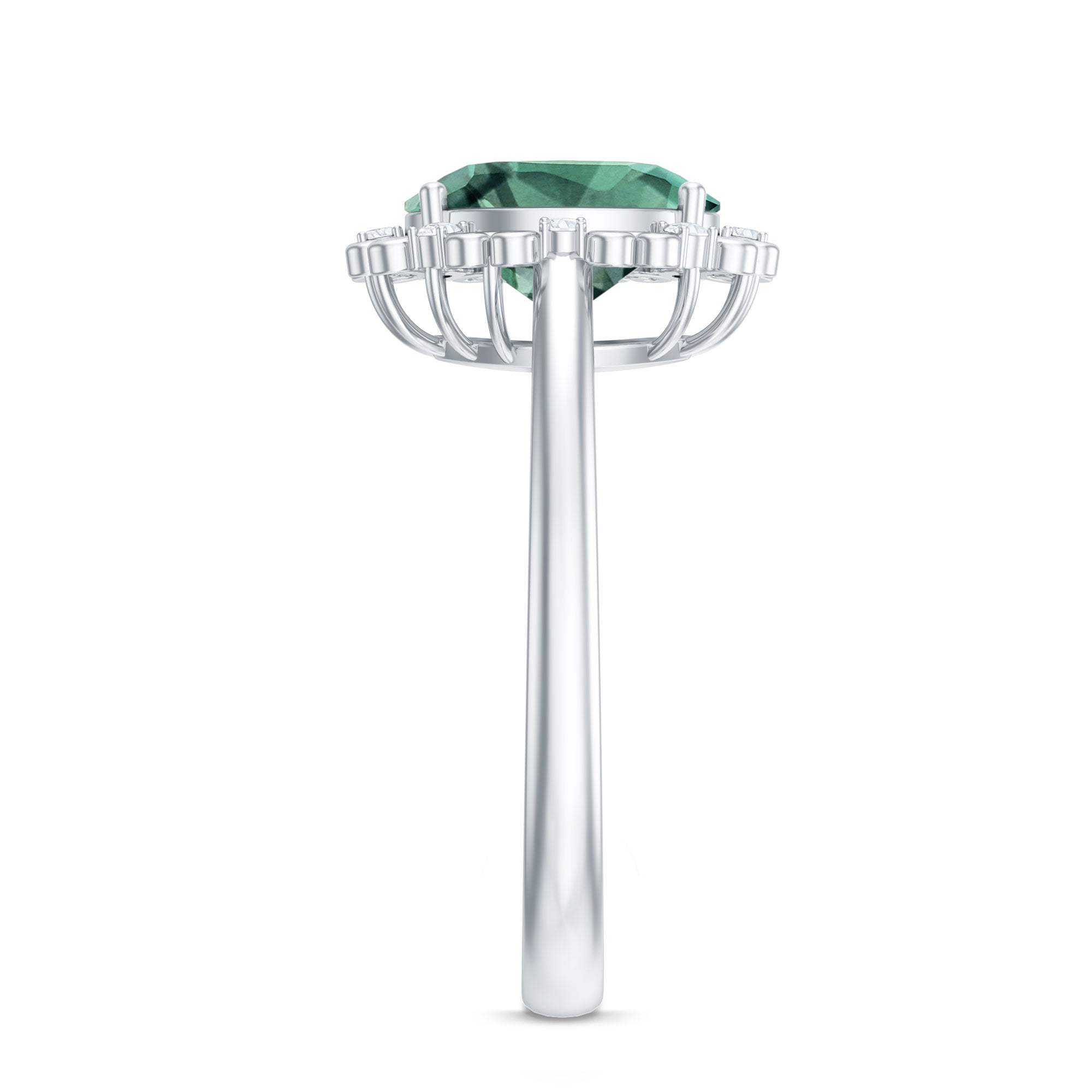 Splendid and elegant, this Engagement Ring is beautified with an Oval Cut Lab Grown Green Sapphire secured by 4 Prong Setting and Round Diamonds Accent. Style this amazing Lab Grown Sapphire Ring with your dressy attires and stand out from the crowd.