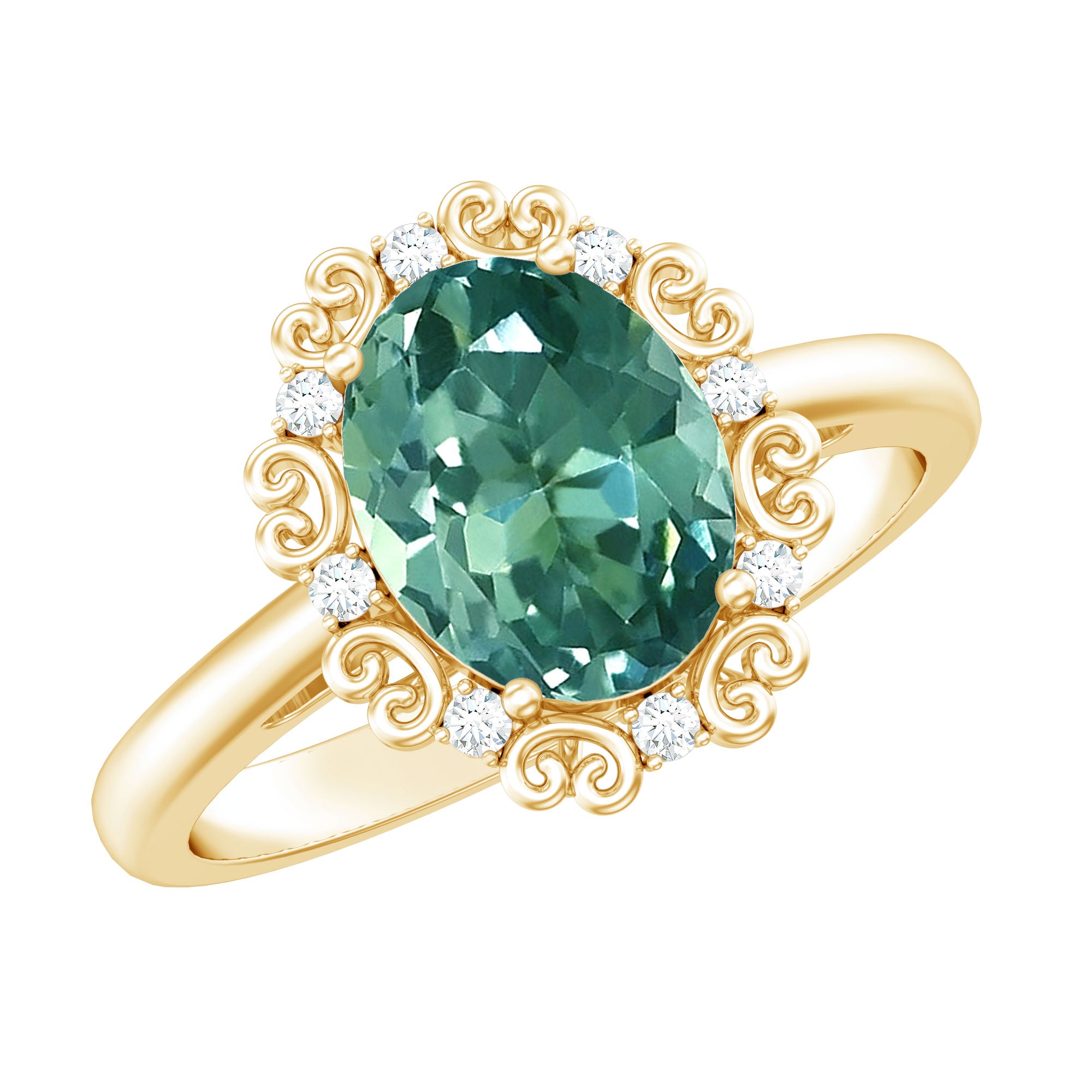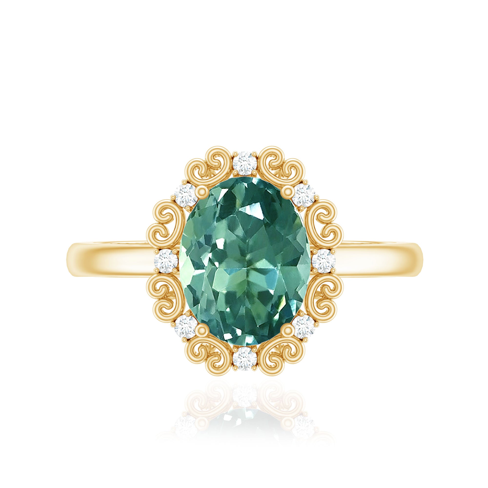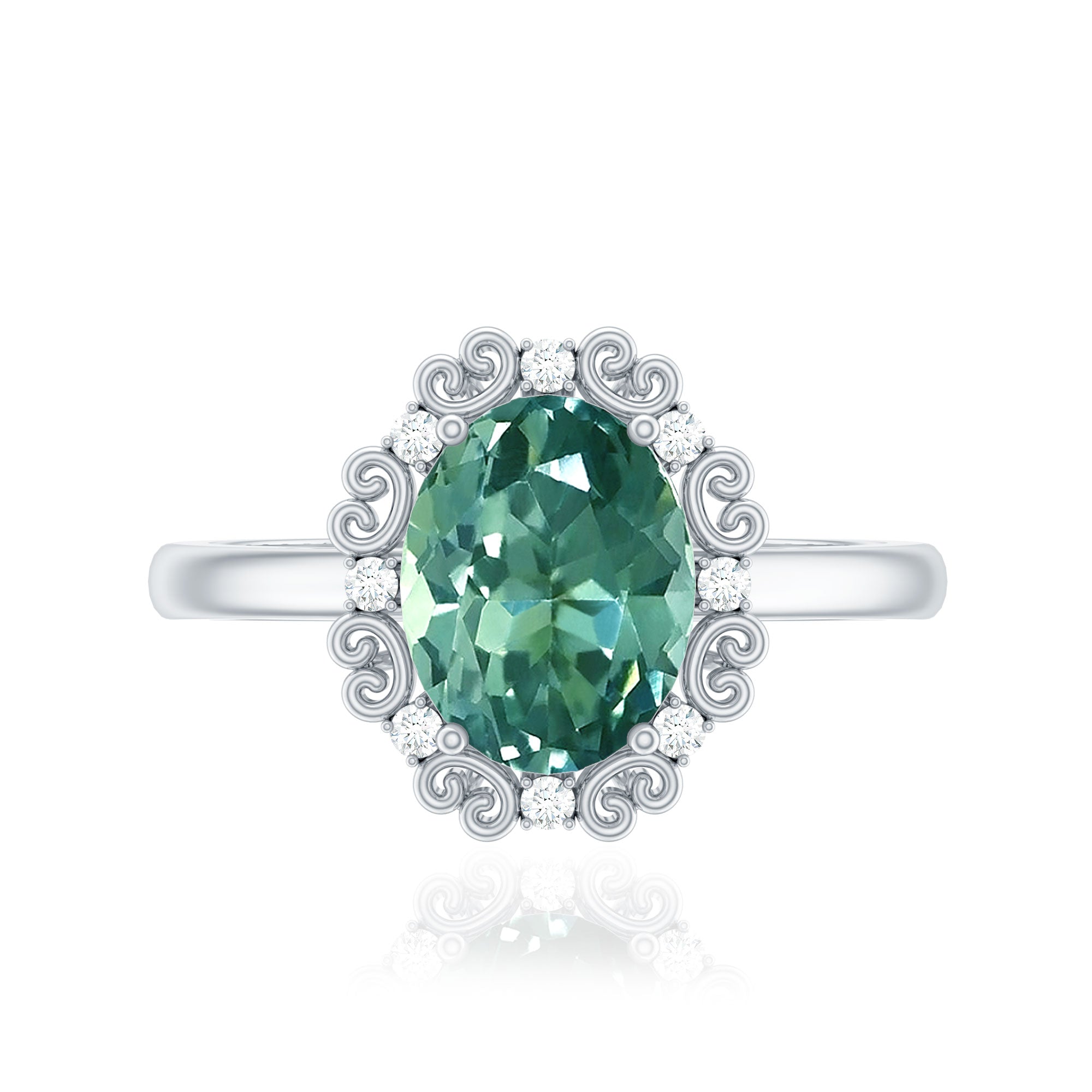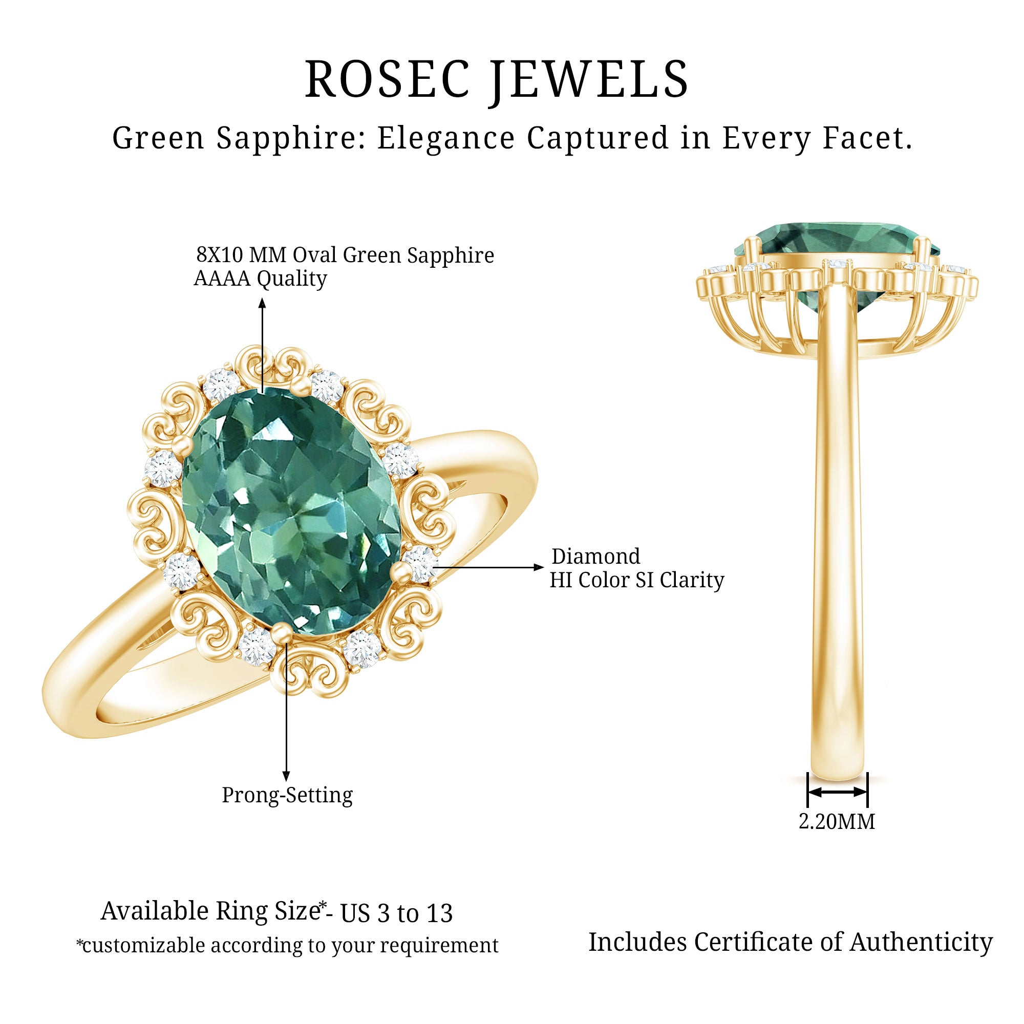 Vintage Style Lab Grown Green Sapphire Engagement Ring with Diamond