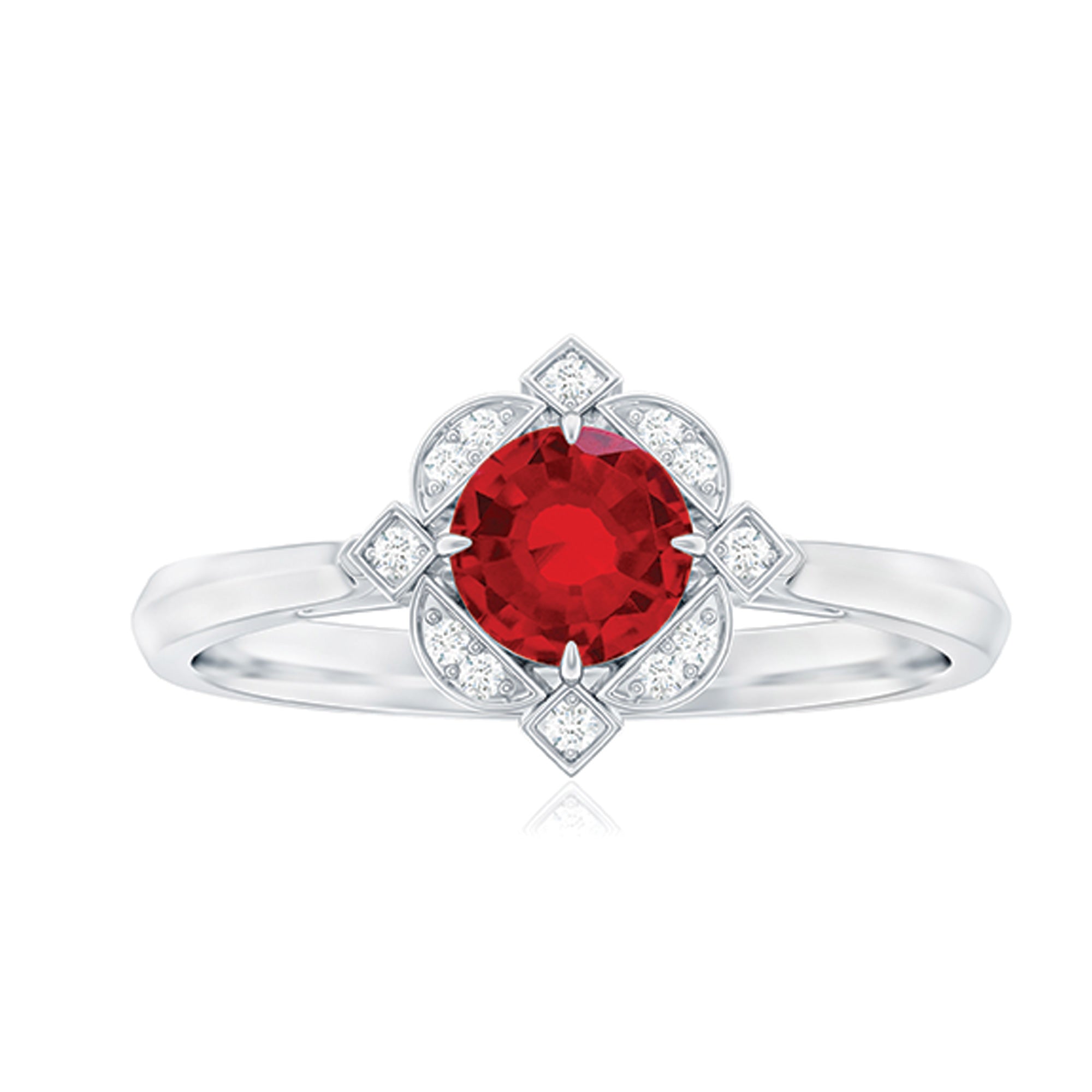 Embrace the elegance of a bygone era with our Vintage Inspired Created Ruby Ring. Featuring a round-cut Lab Created Ruby as the centerpiece, nestled in a claw setting and surrounded by Diamond stones, this ring exudes classic charm. This vintage-style ring will be a treasured addition to your jewelry collection.