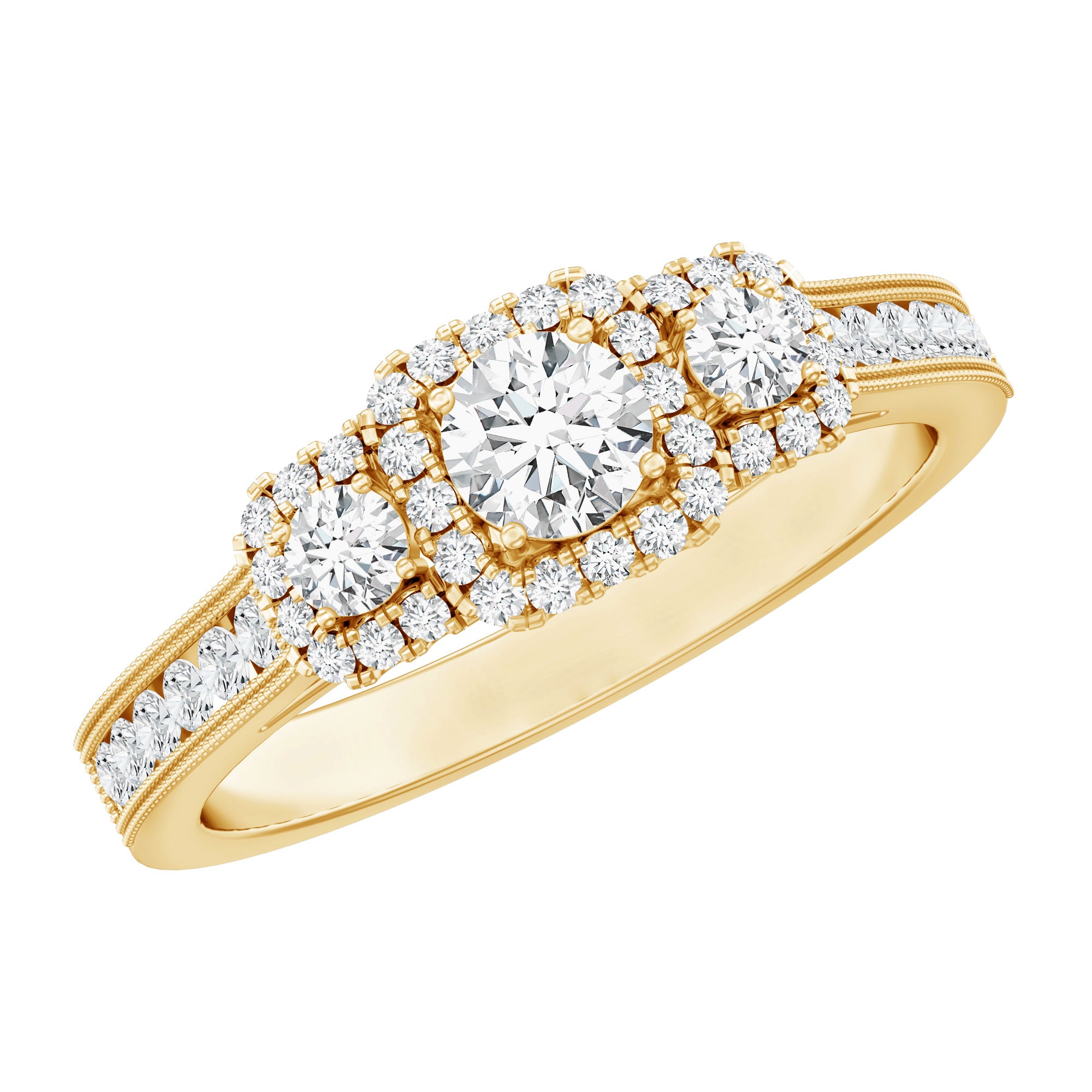 Our Moissanite Engagement Ring honors the Past, celebrates the Present, and shines for the Future. This Three Stone Engagement Ring is where vintage romance meets contemporary sparkle, a true tribute to timeless love and thoughtful design. Featuring three brilliant round cut Moissanite stones, each carefully chosen for its D color and VS1 clarity, and surrounded by smaller stones, the ring reflects your journey together. The trio of stones is delicately accented by dainty side gems that add extra shimmer without overpowering the meaningful centerpiece. Intricate beaded detailing along the band brings a vintage-inspired elegance, giving the 3 Stone Moissanite Ring a heirloom feel while the clean lines and modern craftsmanship ensure a fresh, unforgettable look. Crafted for the romantic who appreciates both tradition and individuality, this Past Present and Future Ring is more than just a symbol of love, it’s a reflection of shared values, deep connection, and lasting beauty. Whether youre preparing to propose or celebrating a milestone, this Vintage Engagement Ring is designed to make the moment magical. Presented in a beautiful jewelry box and available in a range of sizes, its ready to become part of your forever. Let this stunning piece be the sparkle that marks the beginning of your next chapter, full of love, meaning, and memories to come.